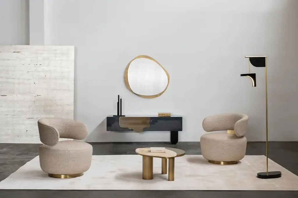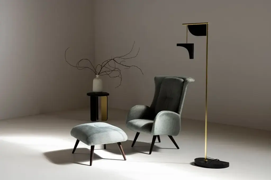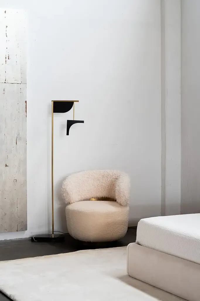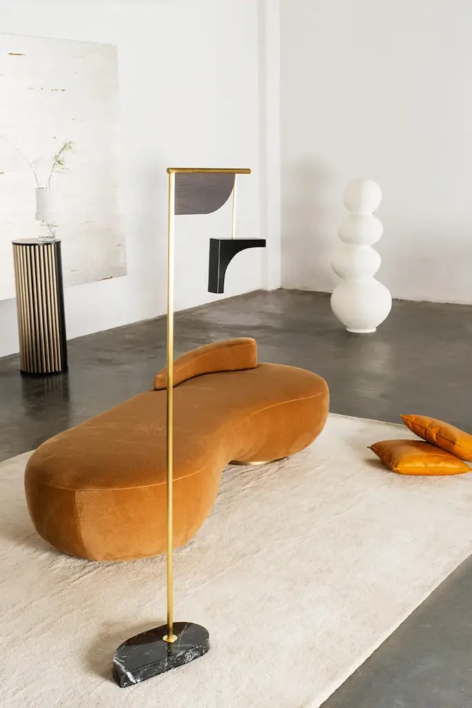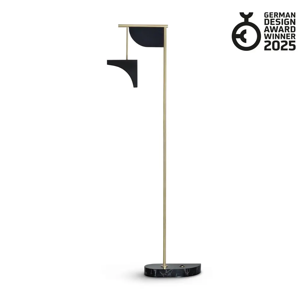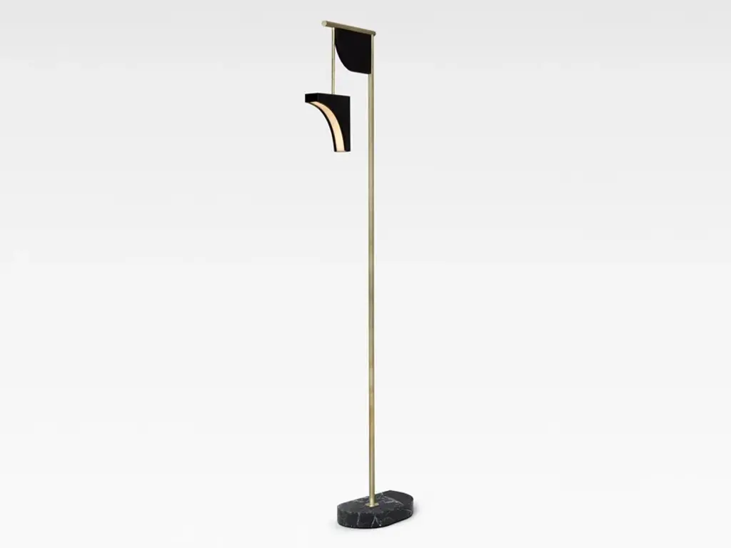 Opposite floor lamp with a hanging black lampshade and a detail of American oak veneer under the bridge arm is a concept for modern light and creates a subliminal ambience for exceptional living. The visual contrast between the exquisite silver Portoro marble base and the warm brushed brass adds a sense of balance and boldness to any interior.Materials & FinishesME006 Brushed brass; high-gloss finishST053 Silver Portoro marble; polishedFI007 Black lacquer; satin finishWD107 American oak; open-pore black stained; matt finishEL001 LED light stripElectric components - CE SpecificationsVoltage, frequency: 230V, 50HZEletrical plug type: C, FMax. bulb wattage: 4,9WLed strip: YesLed strip color temperature: 3000Kled strip brightness: 420Energy CertificationThis luminaire contains built-in LED lamps that cover the following levels of energy certification: A++ to AAverage energy class: A++The lamps cannot be changed in this luminaire: Yes