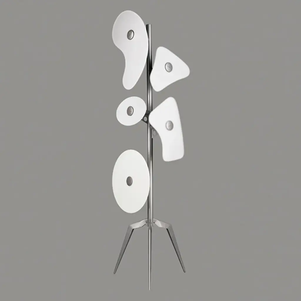 Orbital is Ferruccio Laviani’s debut lamp, designed in 1992. This lighting object decorates with the boldness of a sculpture; a true icon of lighting design. The lamp’s structure is essentially made up of three parts: a moveable tripod, made from laser-cut metal sheet that supports a lacquered metal rod. Five arms extend from the rod and on these arms are diffusers made from serigraphic, industrial glass. Each slab has its own unique shape for a bold overall graphic effect which is particularly evident in the white version. The colored diffusers, on the other hand, evoke a surrealist painting when the lamp is switched off. When the lamp is switched on, these mosaic glass strips create an illusion. The diffusers are satin-finished on the outside to give texture to the color and enhance the shapes but glossy on the inside to reflect the light. Features