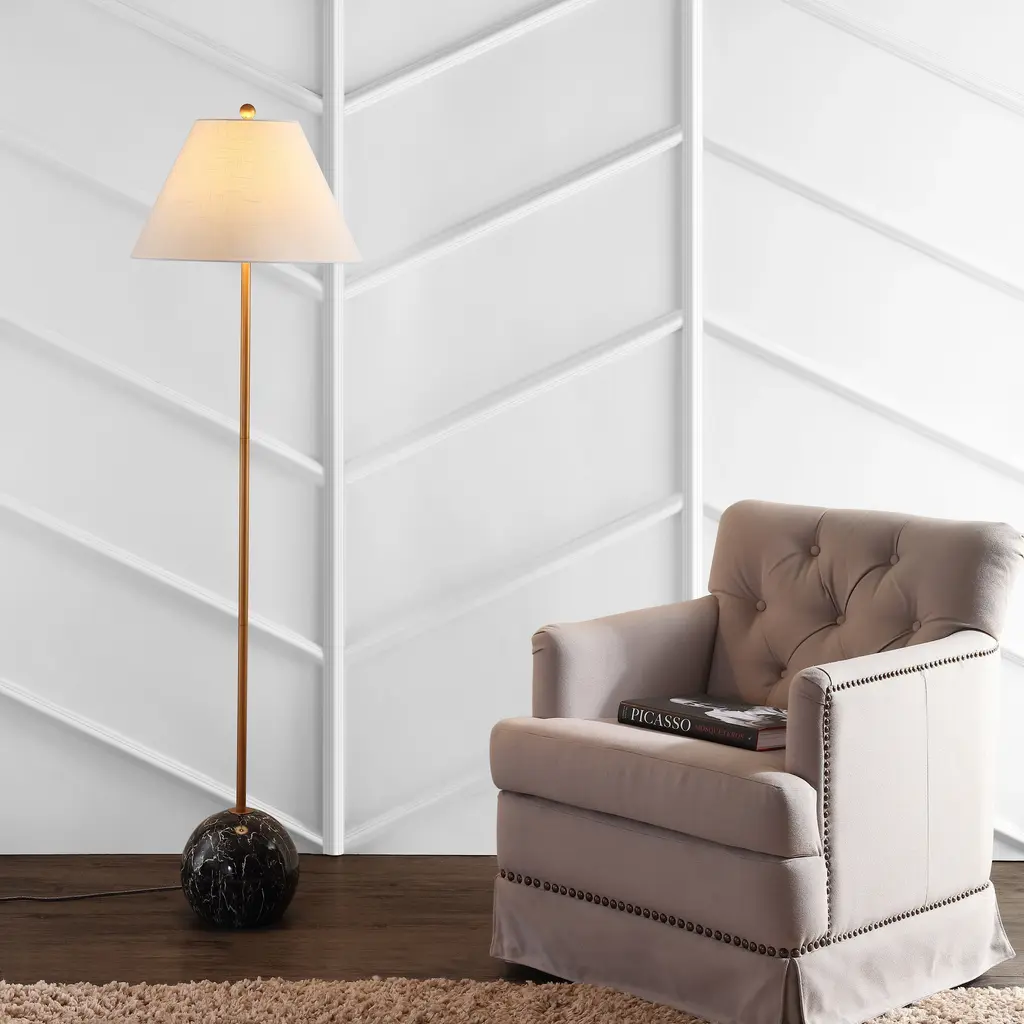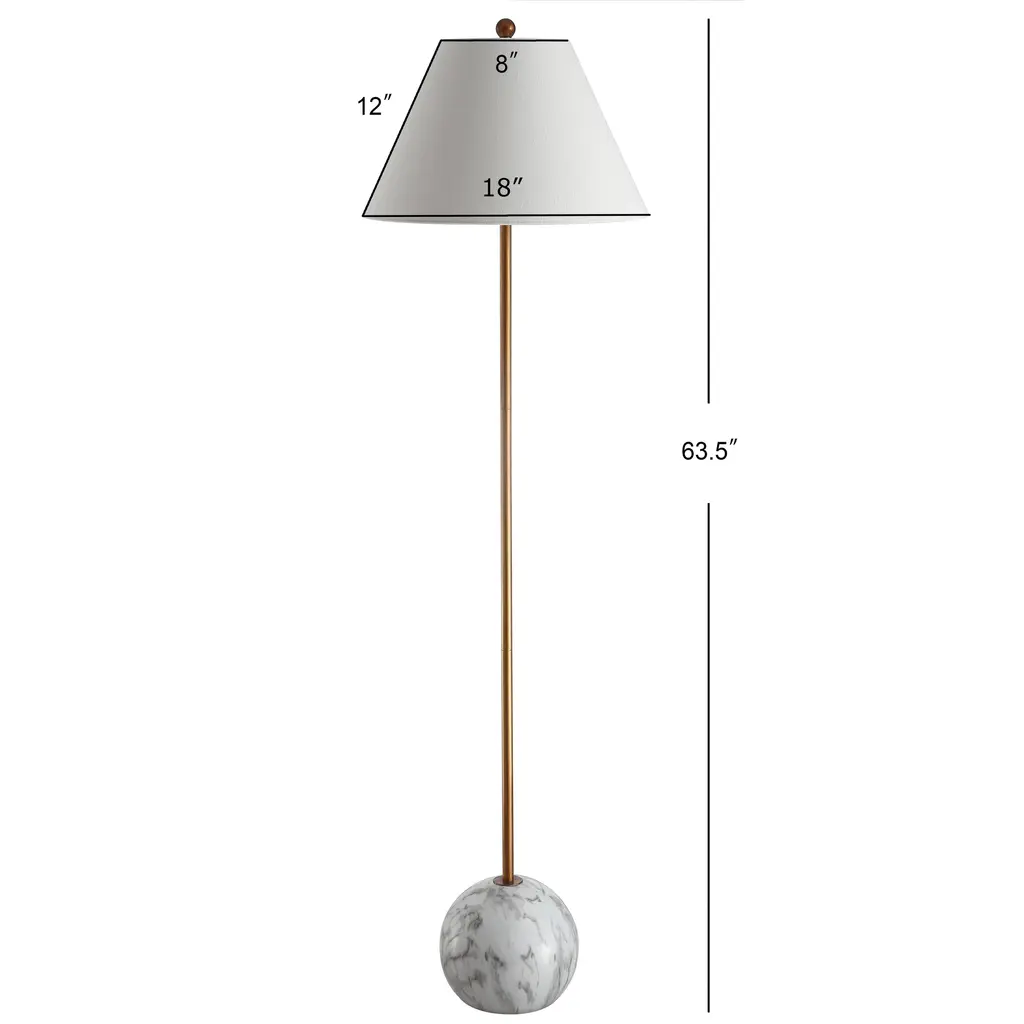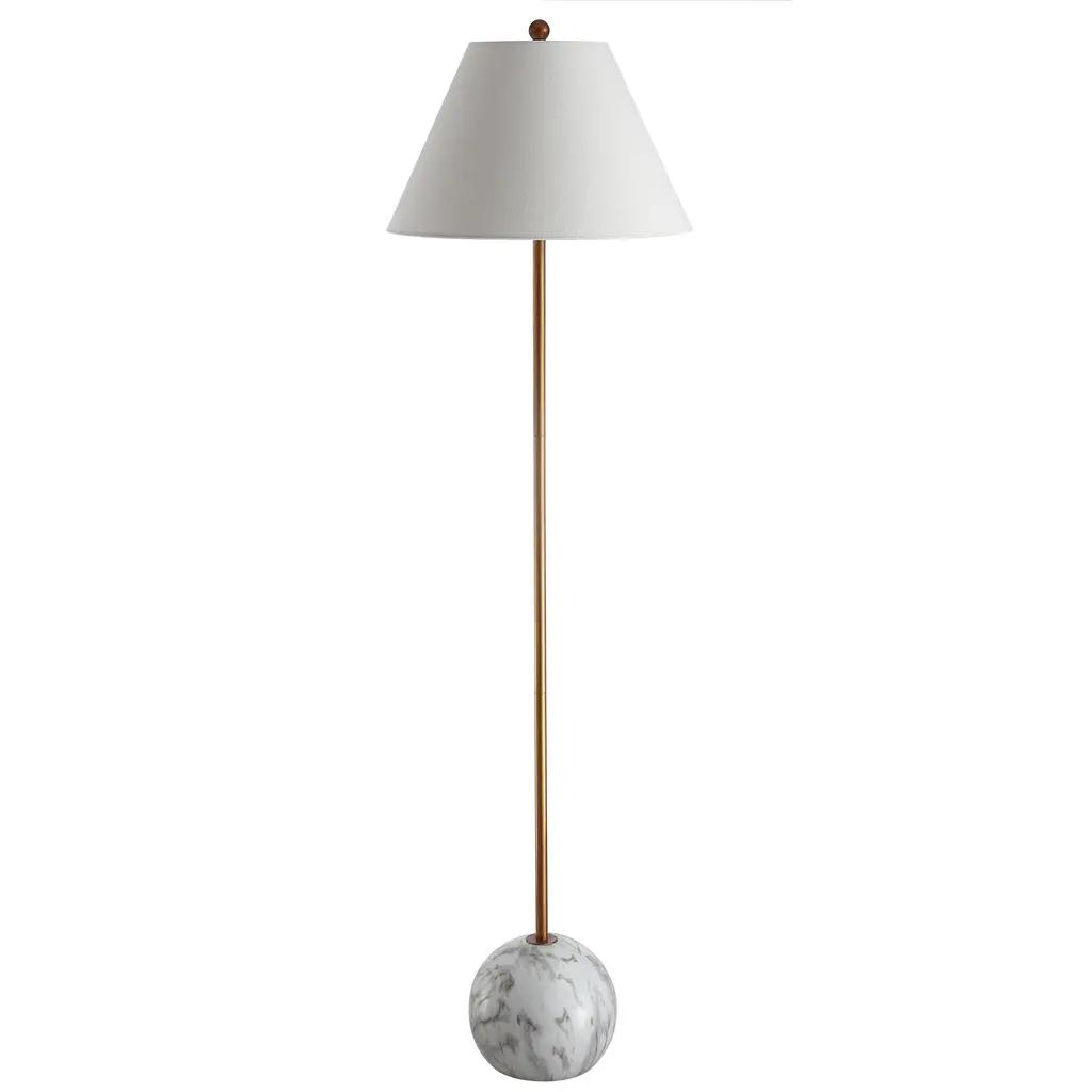 "Shibumi" is a word the Japanese use to describe elegant simplicity, and this lamp exemplifies both those features. Simple in design, with a minimalist brass column, tapered shape, and geometric sphere base, the high quality materials make it not only simple, but elegant. Cast resin creates a solid, heavy base with a marble-like effect, while brass plating shines in contrast. Keeping the style classic, a tapered cotton shade completes the look. Features:Dimensions:About us:You see a lamp.We see a decorative work of art.A perfectly curved shade casts a dramatic shadow on a floor. A silk cord you never want to hide. LED lightbulbs: as easy on the environment as they are on the eyes. The JONATHAN Y Lighting collection considers every detail from impeccably sourced materials to designer styling. And our prices are so attractive, we've transformed a functional necessity into a fashion accessory.JONATHAN Y Lighting - a fashion revolution in home decor.
