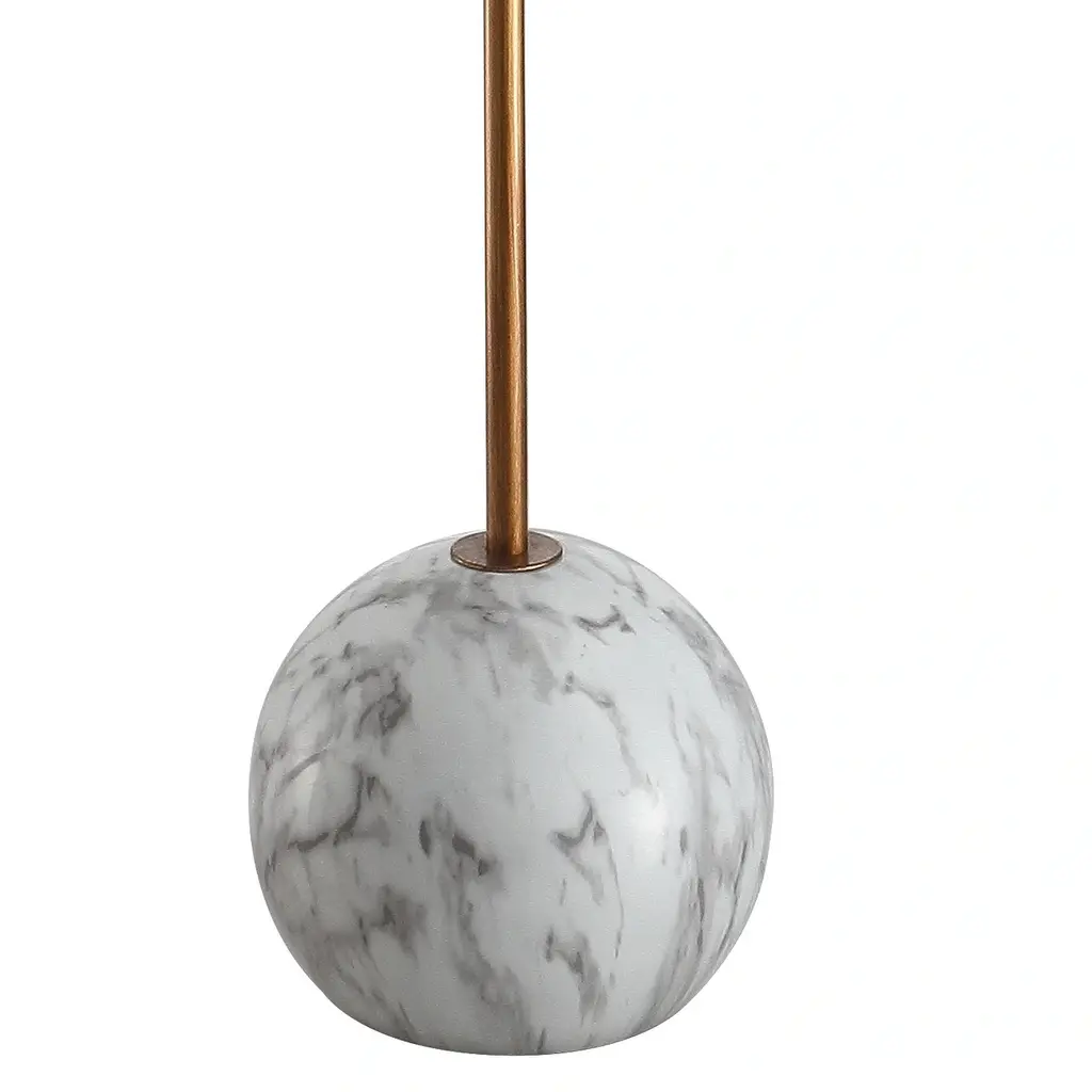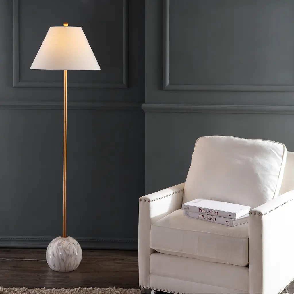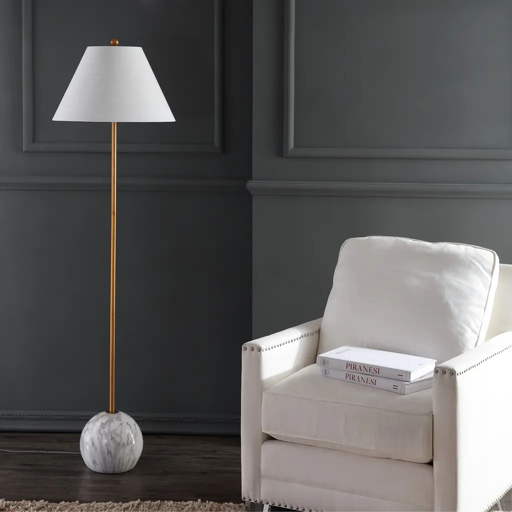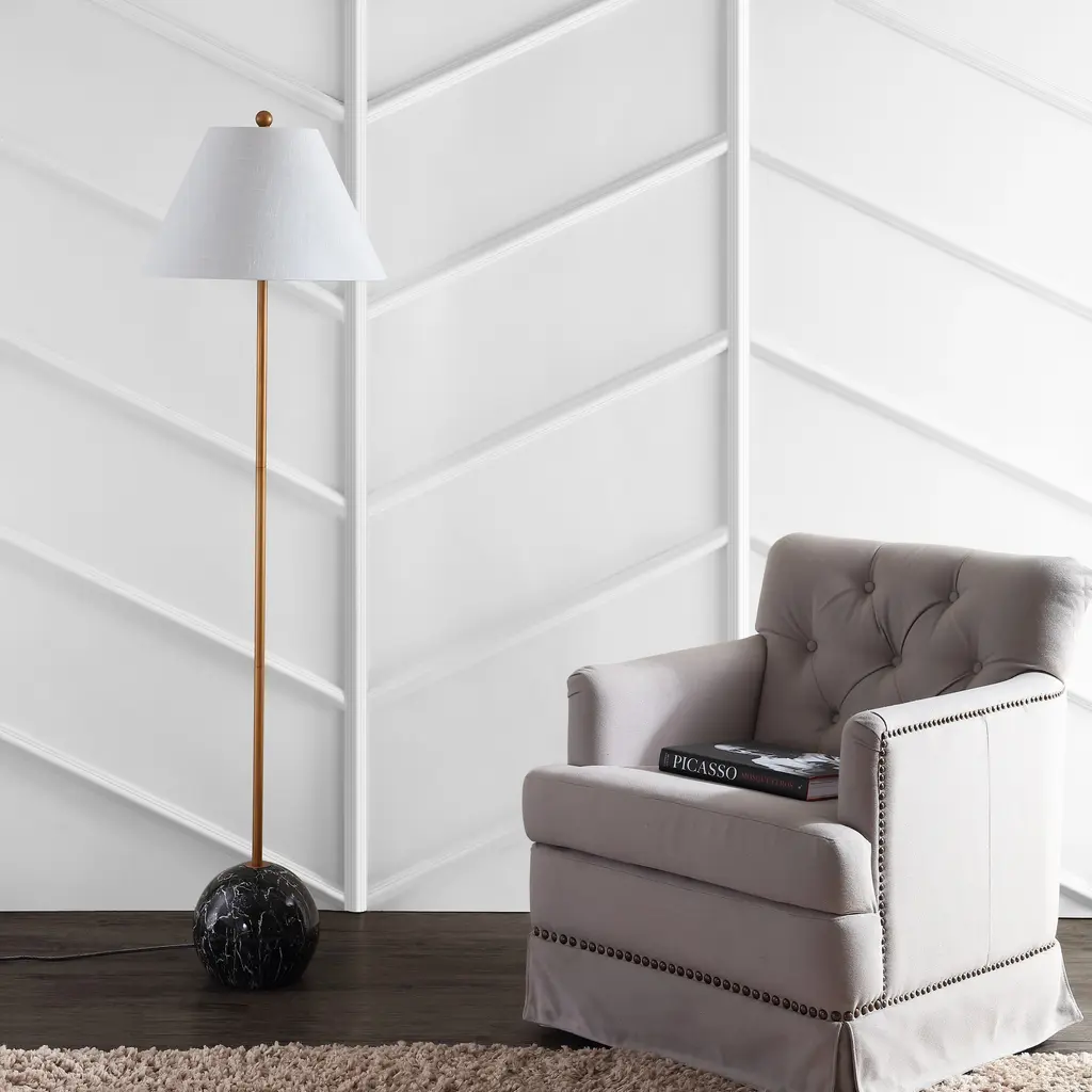"Shibumi" is a word the Japanese use to describe elegant simplicity, and this lamp exemplifies both those features. Simple in design, with a minimalist brass column, tapered shape, and geometric sphere base, the high quality materials make it not only simple, but elegant. Cast resin creates a solid, heavy base with a marble-like effect, while brass plating shines in contrast. Keeping the style classic, a tapered cotton shade completes the look. Features:Dimensions:About us:You see a lamp.We see a decorative work of art.A perfectly curved shade casts a dramatic shadow on a floor. A silk cord you never want to hide. LED lightbulbs: as easy on the environment as they are on the eyes. The JONATHAN Y Lighting collection considers every detail from impeccably sourced materials to designer styling. And our prices are so attractive, we've transformed a functional necessity into a fashion accessory.JONATHAN Y Lighting - a fashion revolution in home decor.