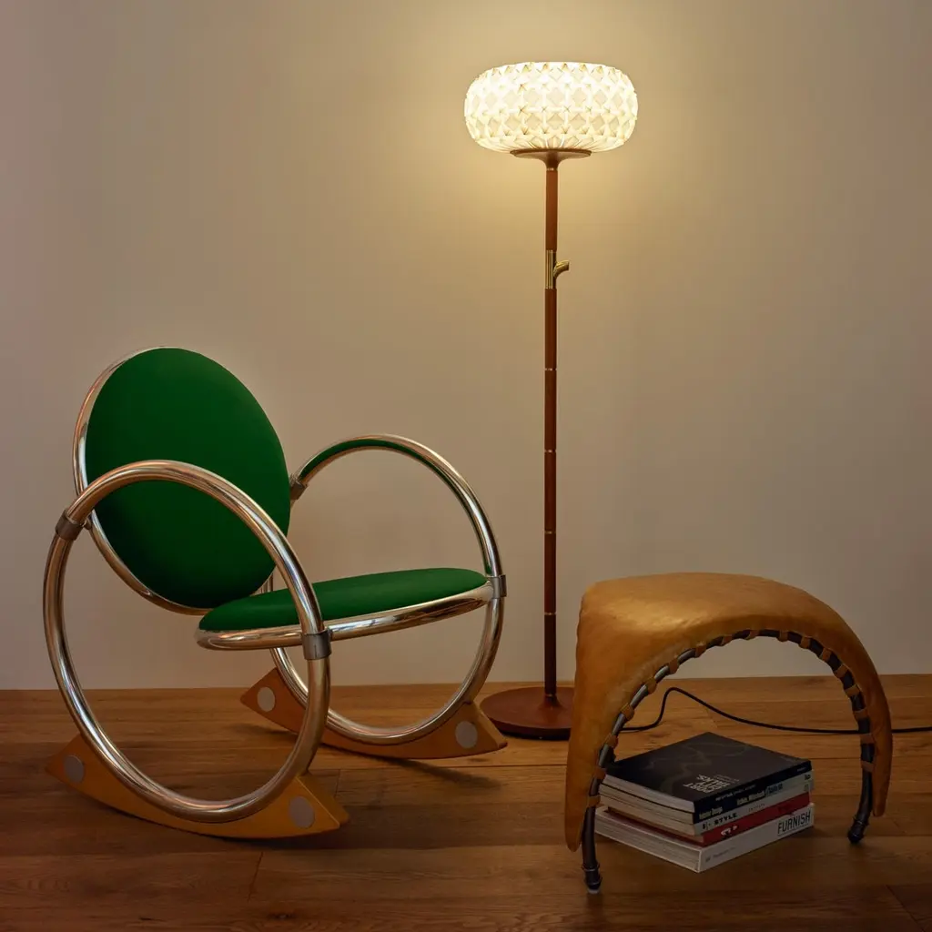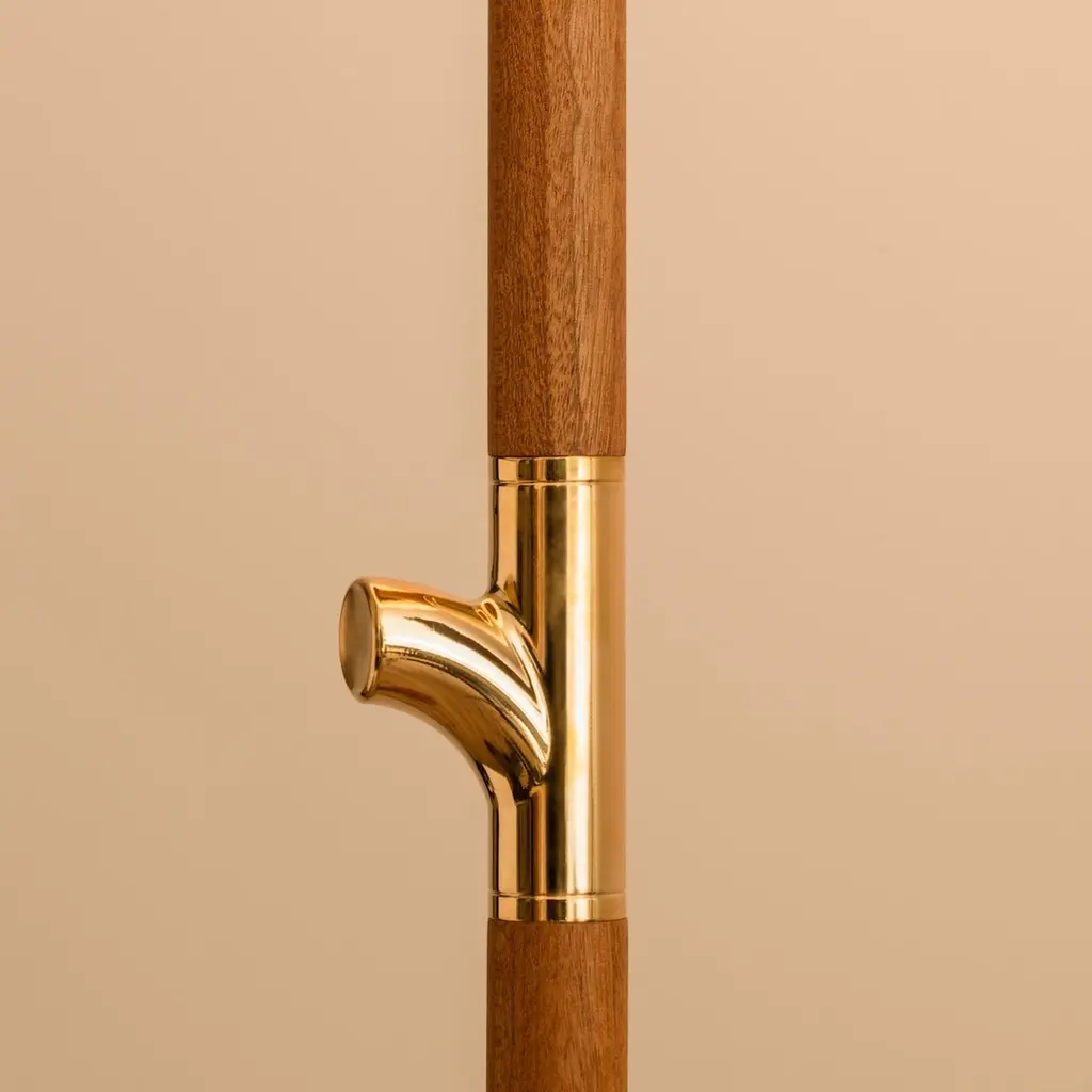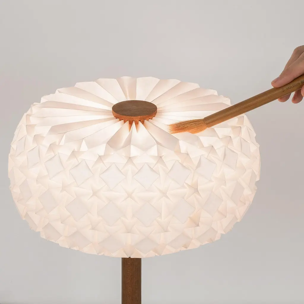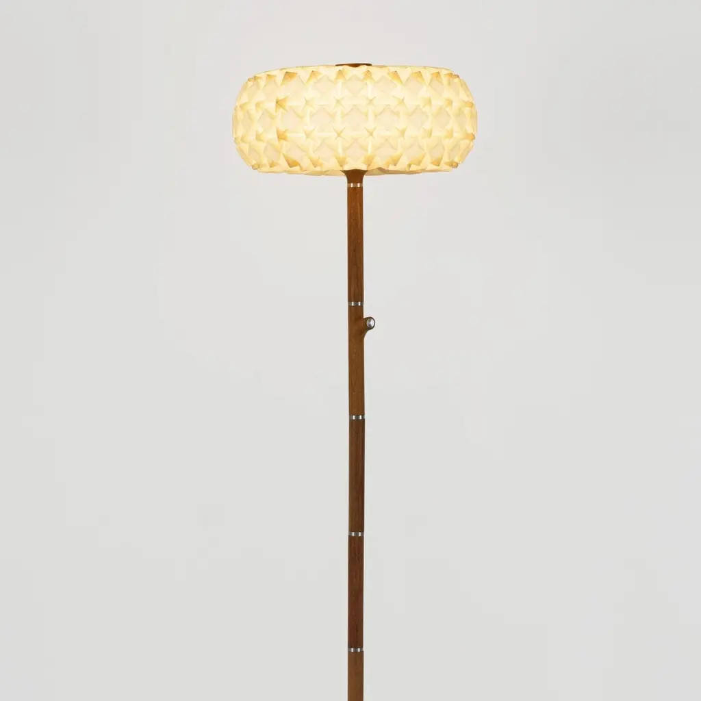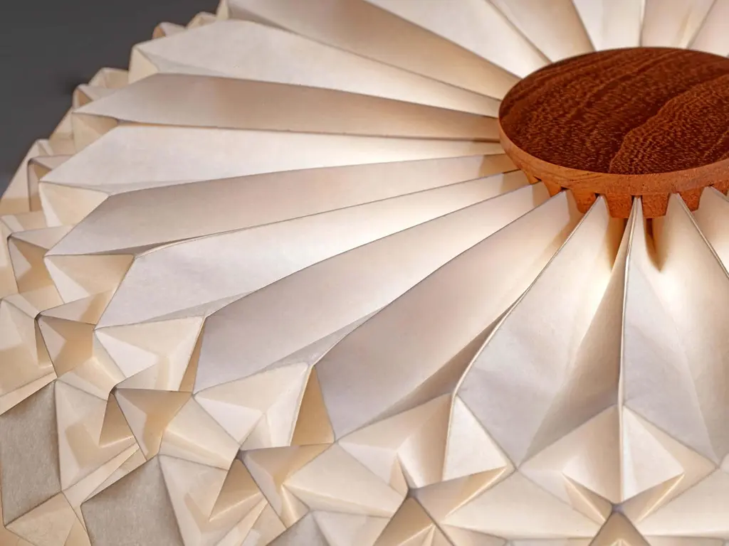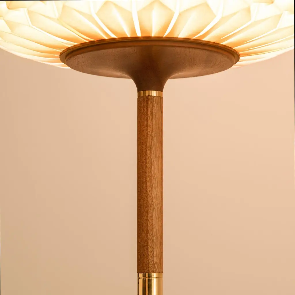 A free standing floor lamp made of CNC-milled mahogany wood and a hand-folded origami paper lampshade. Comes with touch on-off and dimming.