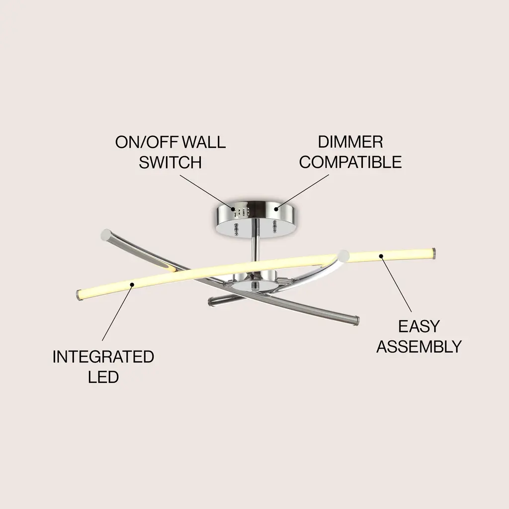 Perfect for low ceilings, our contemporary semi-flush fixture has three integrated-LED chrome tubes for bright, even illumination. The sleek, modern light fixture extends down only 7.5" from the ceiling. This minimalist design is perfect for a dining room, living room, kitchen, or bedroom.Features:Dimensions:About us:You see a lamp.We see a decorative work of art.A perfectly curved shade casts a dramatic shadow on a floor. Compatible with LED lightbulbs: as easy on the environment as they are on the eyes. The JONATHAN Y Lighting collection considers every detail from impeccably sourced materials to designer styling. And our prices are so attractive, we've transformed a functional necessity into a fashion accessory.JONATHAN Y Lighting - a fashion revolution in home decor.
