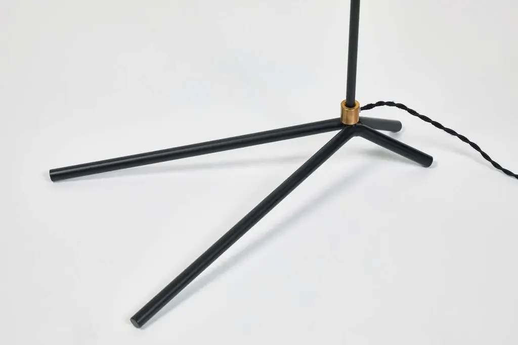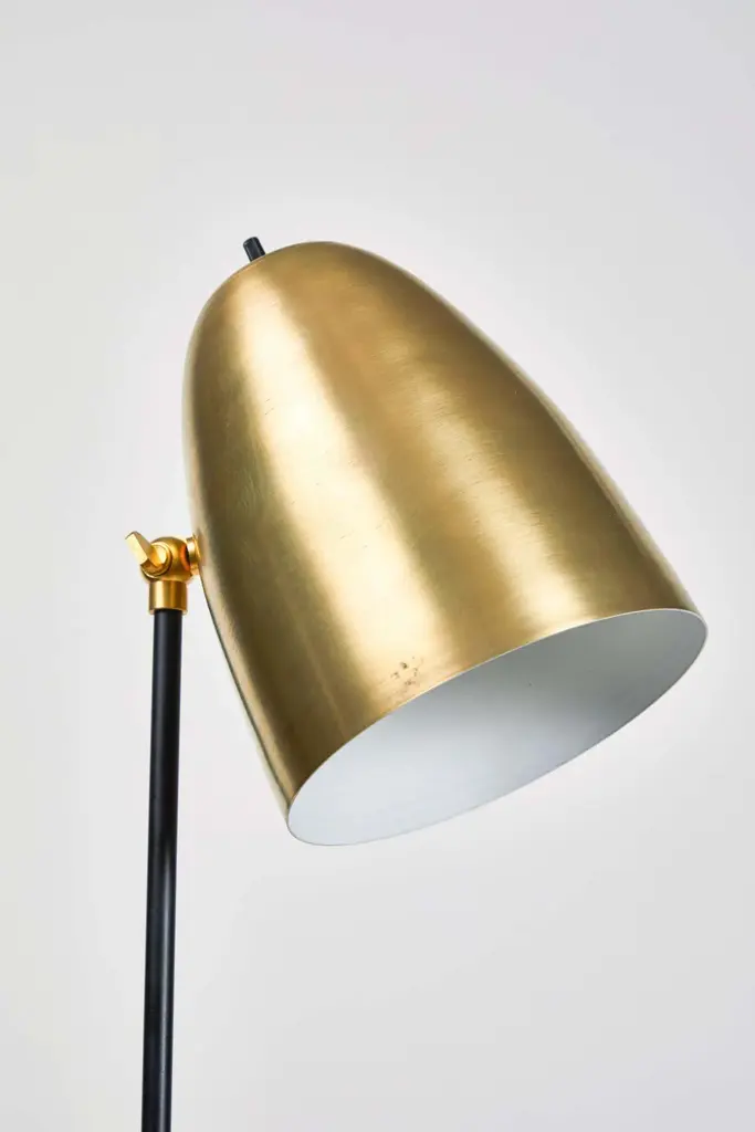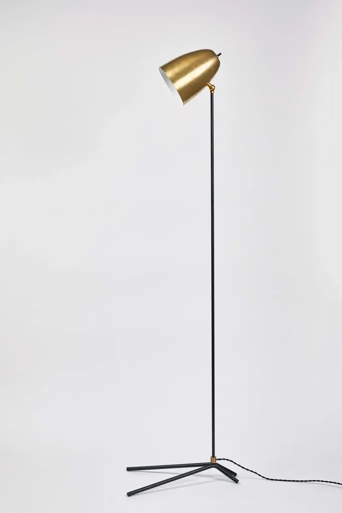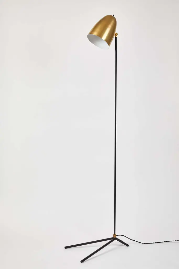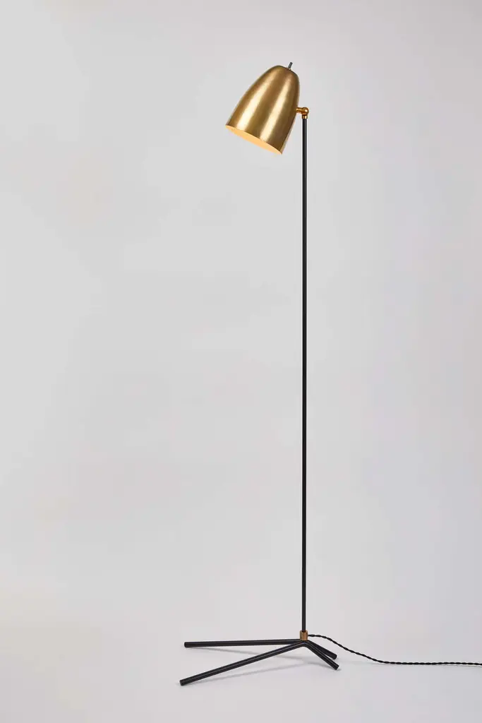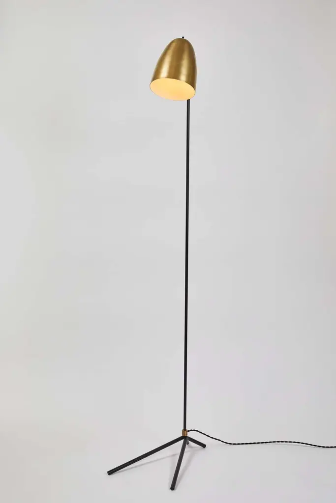 ORO' brass and metal floor lamp. Hand-fabricated by Los Angeles based designer and lighting professional Alvaro Benitez, this UL listed and highly refined floor lamp is reminiscent of the iconic mid-century Italian designs of Arteluce and Stilnovo. Executed in black metal and brushed brass, shade can be rotated left, right, up and down for a flexible variety of lighting options. Price is per item. One in stock. For time sensitive orders, please inquire prior to purchasing. Made to order. Accommodates a single medium based 60 watt max bulb (higher with LED). UL listed. Please note that the brass parts of this lamp are fabricated in unlacquered brass. They will naturally patinate over time and can already show varied signs of patination through exposure to the elements, handling, etc. Made to order. All sales are final.