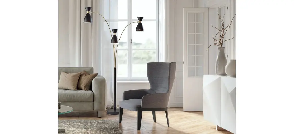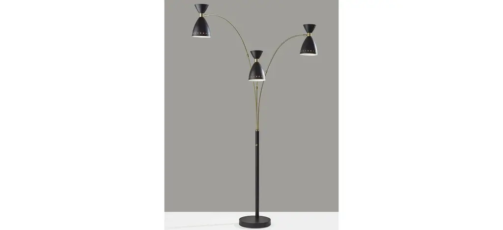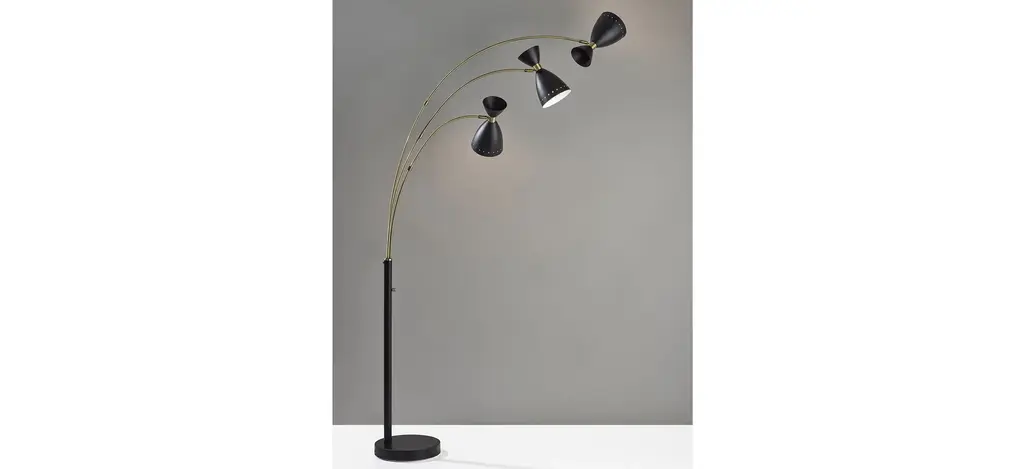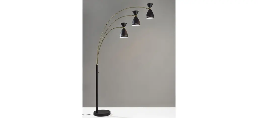 Bring a modern touch to your d_cor with the clean styling of the Oscar 3-Arm Arc Lamp. The arcing design and slender profile of this tall lamp makes it the perfect addition in room corners or beside furniture. The round black painted metal base provides stability, leading to three long and slender antique brass arcing arms. Each arm is topped by a 40W bulb (not included) and a metal bell-shaped shade with antique brass accents. The three arms can be swiveled and repositioned from the base, and each head features an adjustable joint, allowing you to direct the light wherever it's needed. Operated by a rotary switch located on the pole, this lamp features multiple lighting settings.