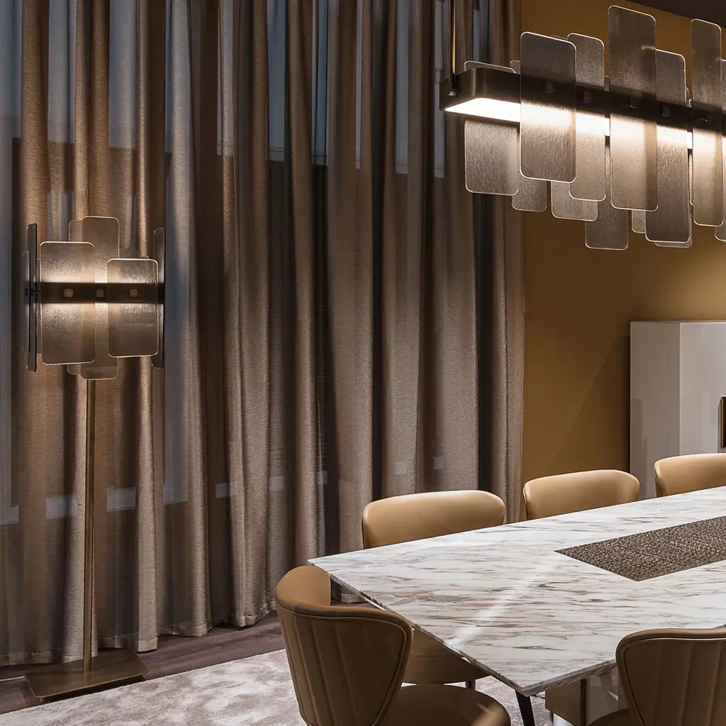 The shape of this floor lamp enhances the beauty of the frosted glass that surrounds it. It is used to screen out direct light yet thanks to its transparency it still ensures perfect lighting.