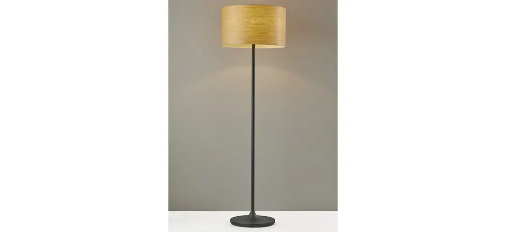 An interpretation of Scandinavian design, the Oslo floor lamp features a matte black modified trumpet shaped base and body and is topped with a hardback drum shade of cherry wood veneer. The wood veneer has a natural wood grain that is highlighted when lit. An on/off rotary switch is located on the socket. This lamp has a clear cord and is smart outlet compatible. Bulb is not included.