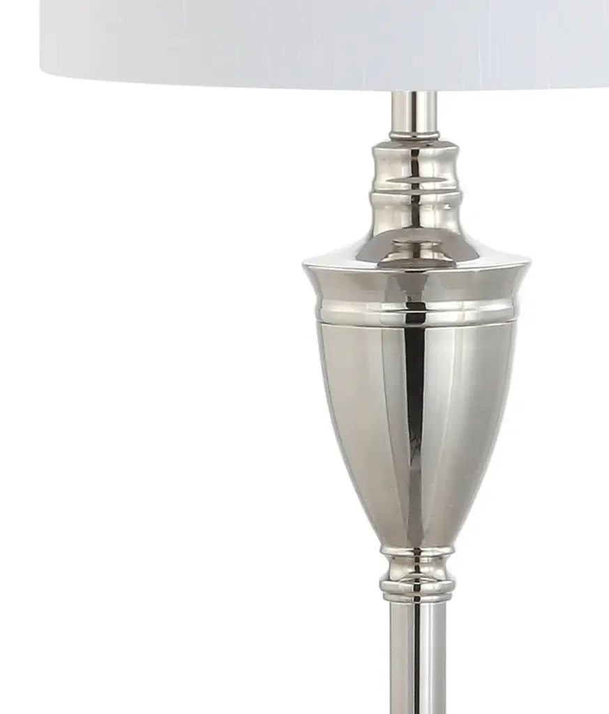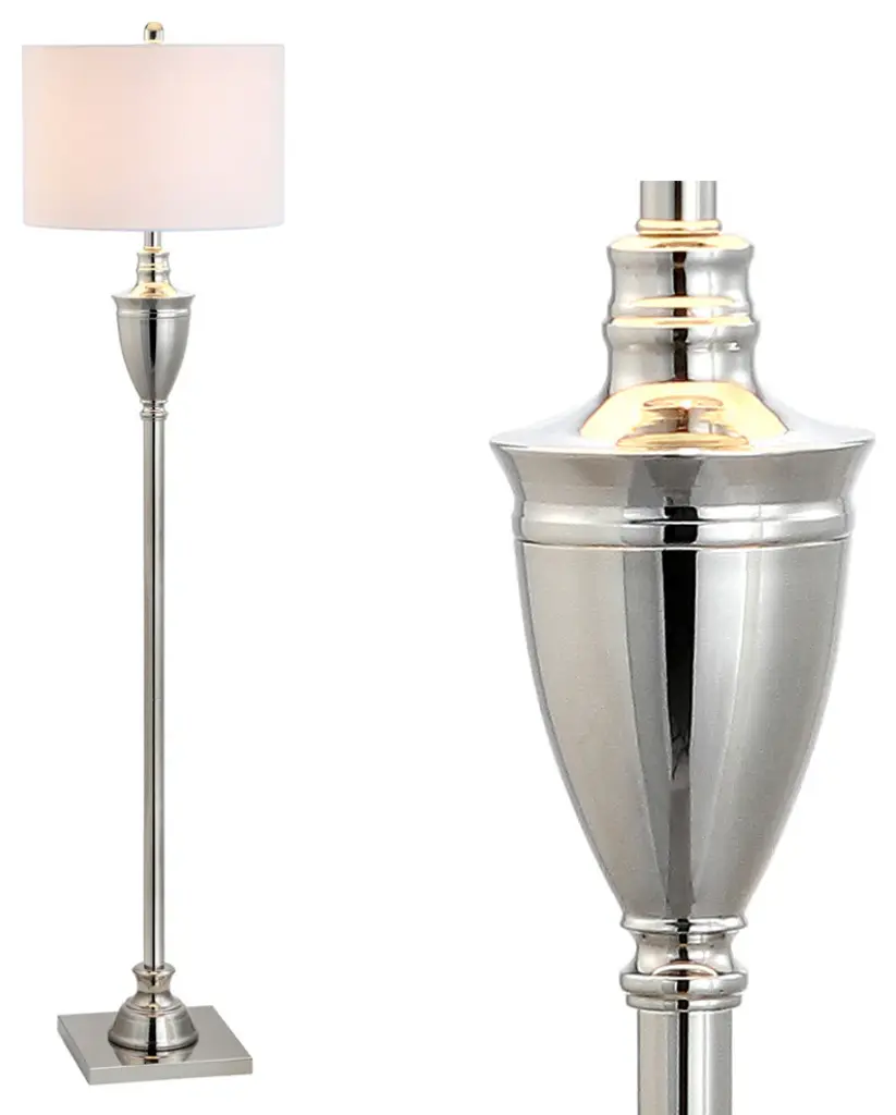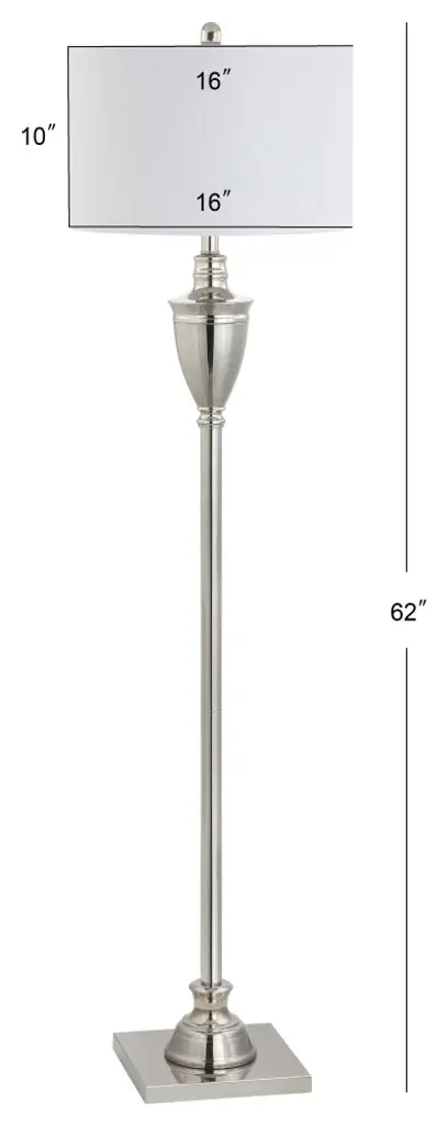 Classical style meets contemporary elegance in this polished nickel floor lamp with a bright white drum shade. Typically used as a silhouette for table lamps, the Grecian urn accent adds an old world element to this functional silhouette. At 62" tall, it is the perfect height for beside a sofa or between a pair of club chairs. Features:A Grecian Urn accent adorns the base of this classic floor lamp100% cotton hardback drum shadeBeautiful to display or easy to conceal: the 72" cord is silk-wrappedOn-off rotary switch on socketEco-friendly 9W LED bulb includedTakes one bulb and compatible with any 12W LED or 100W Type "A" or 23W CFLUL ListedColor: Polished Nickel with white shadeBody Material: MetalBase Material: IronFinial Material: MetalFinial Color: Polished NickelHarp Color: SilverIncludes: One (1) lamp(s)Minor Assembly RequiredDimensions:Lamp: 62 inches high x 16 inches wide x 16 inches deepShade: 10 inches high x 16 inches wide x 16 inches deepAbout us:You see a lamp.We see a decorative work of art.A perfectly curved shade casts a dramatic shadow on a floor. A silk cord you never want to hide. LED lightbulbs: as easy on the environment as they are on the eyes. The JONATHAN Y Lighting collection considers every detail from impeccably sourced materials to designer styling. And our prices are so attractive, we''ve transformed a functional necessity into a fashion accessory.JONATHAN Y Lighting - a fashion revolution in home decor.