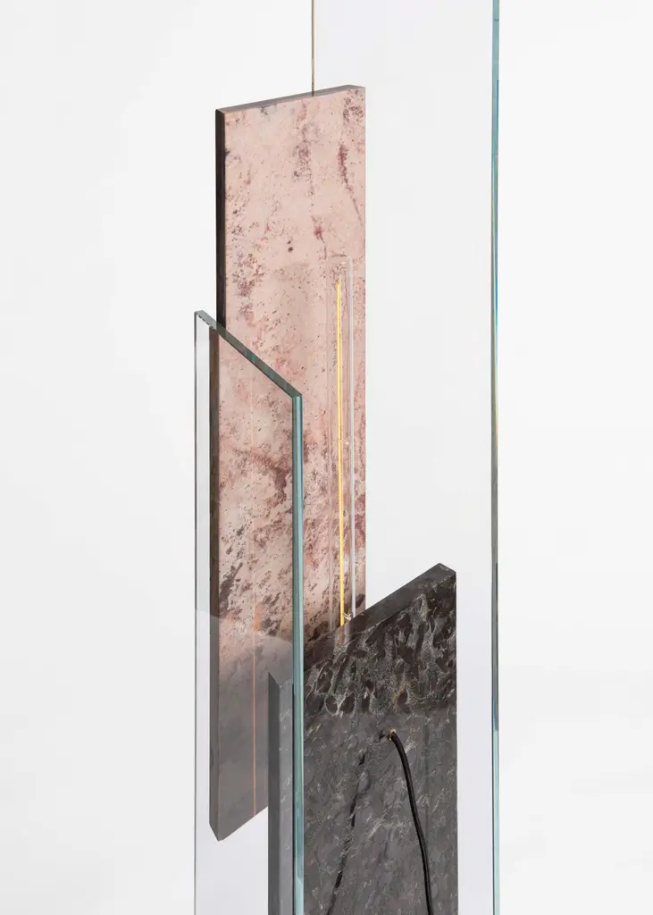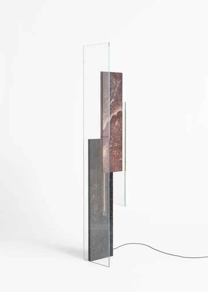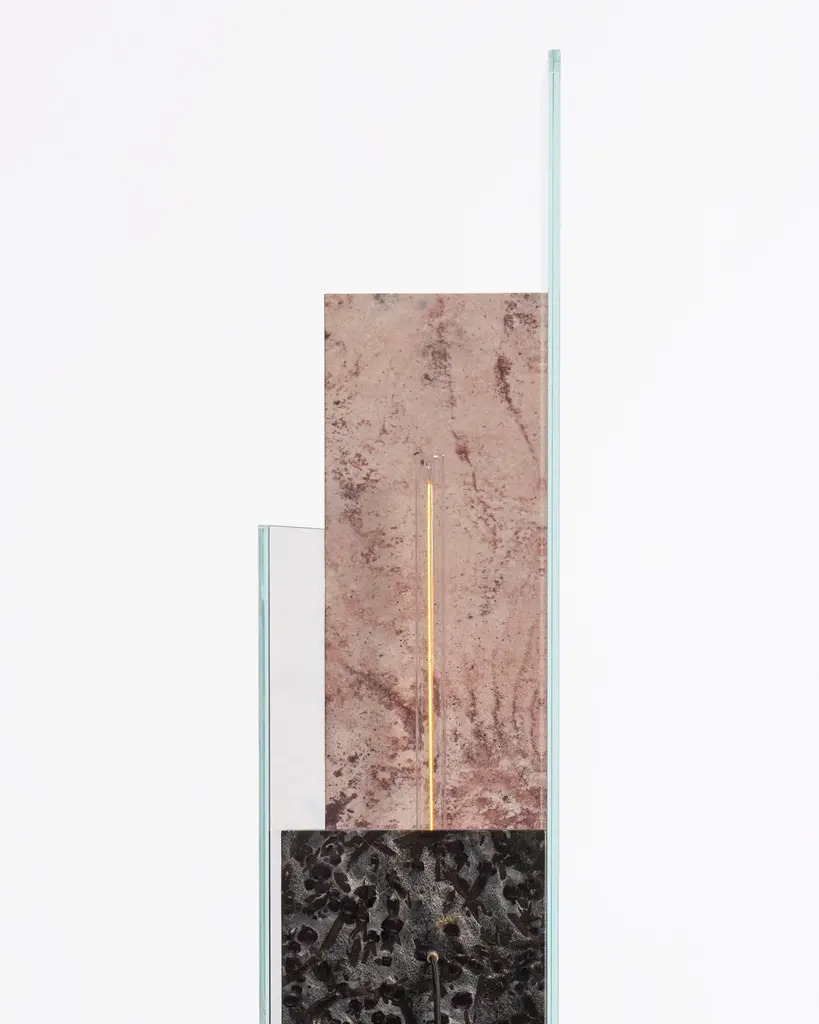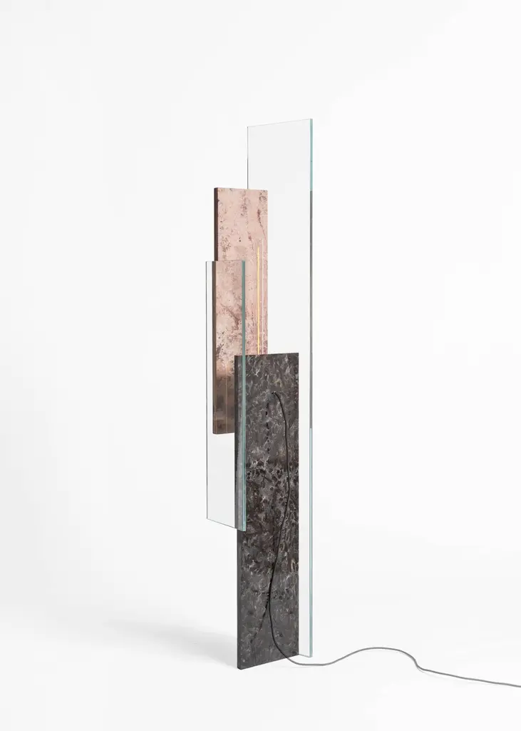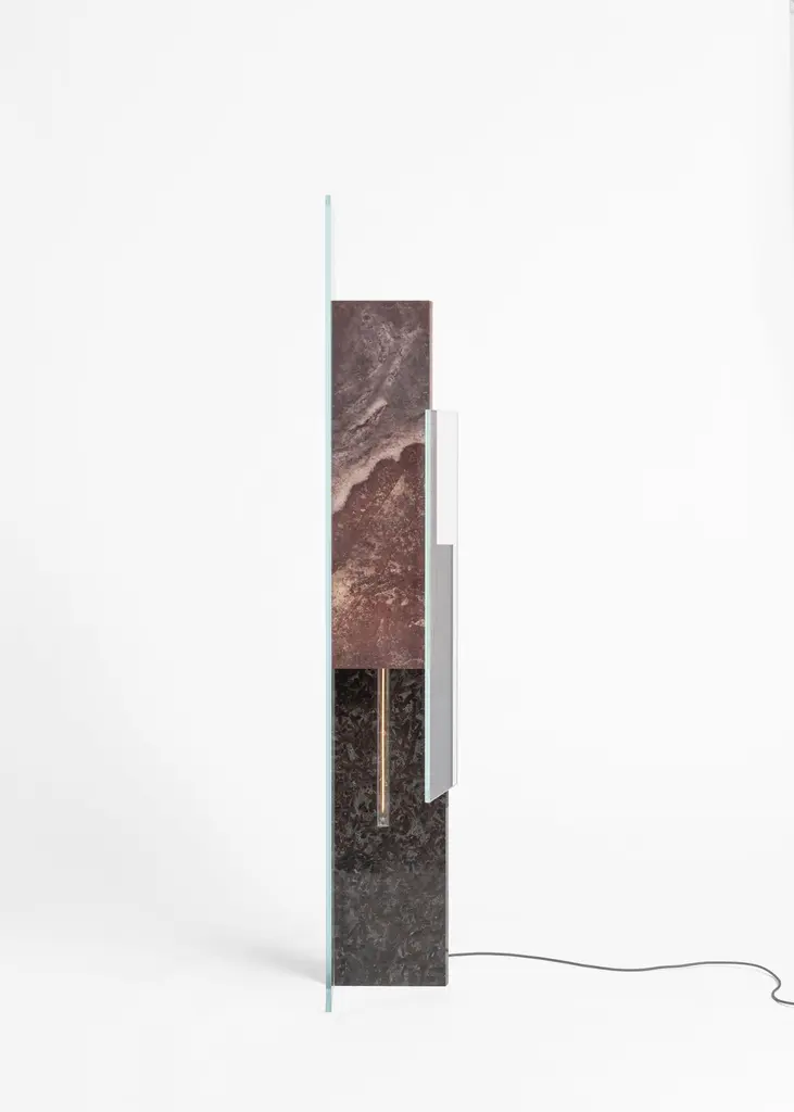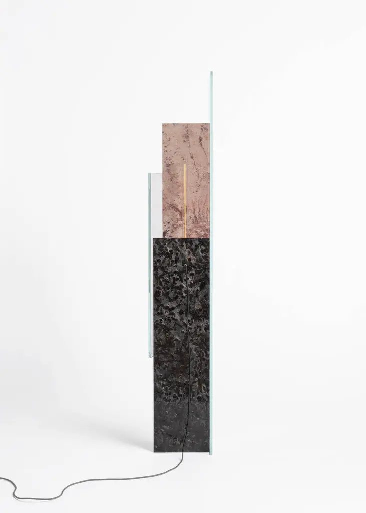 Delta L floor lamp by Frederic SaulouLimited Edition of 5Materials: White glass, Green pink granit from Brazil, pink marble from Portugal.Dimensions: D 30 x W 28 x H 175 cmSigned and numbered."The first question that one could ask oneself in front of these works could be about the notion of balance or even volumetric understanding.Beyond the use, these two new pieces thus raise a technical and symbolic question announcing my creative reflection.Indeed, my work since 2013 tends to highlight the mineral materials from buildings and heritage to give them back their nobility, to question the territory around the material, know-how, in closeconnection with architecture and his history.For this new collection, I like to play on the dualities offered by the different properties of the materials used and their architectural uses, reflected in the tension and technicality betweenthe colored, dense and heavy stone in balance with the transparent glass, thin and light."Frederic Saulou's sculpted design artworks introduce a series of work coming from researches andpartnerships between local ateliers and designer, and implemented to another scale: That of the object and contemporary creation.Frédéric Saulou is a proeminent French contemporary designer.Born in 1989, Frédéric Saulou, lives and works in Rennes, in France. Graduated in space and environmental design at the Institut Supérieur des Arts Appliqués (LISAA) in 2011 and in object design at the Ecole Européenne Supérieure des Beaux Arts de Rennes (EESAB) in 2013, Frédéric will continue to perfect his experience within the Eric Gizard Associés agency and with the designer Frédéric Ruyant. In 2013, he founded the studio, Frédéric Saulou Design Studio, an independent and multidisciplinary design and consulting agency that sees design as a space for research and exchange that allows him to develop a sensitive approach to forms and materials.Experimentation and research take precedence over his work in order to think of new materials and new uses. This accompanies his daily approach so that each project is conceived as a sculpture in its own right, between simplicity and technicality. His approach guides him towards a global approach but also unique in his creations, thus creating particular interactions between the user and the object, between Industrial craftsmanship. Today Frédéric works on various projects, from objects to space, in series or limited editions and collaborates with prestigious institutions and brands such as the publishing houses Ligne Roset, Drugeot Manufacture, Brossier Saderne, Vista Alegre, Esprit Porcelaine Limoges etc.