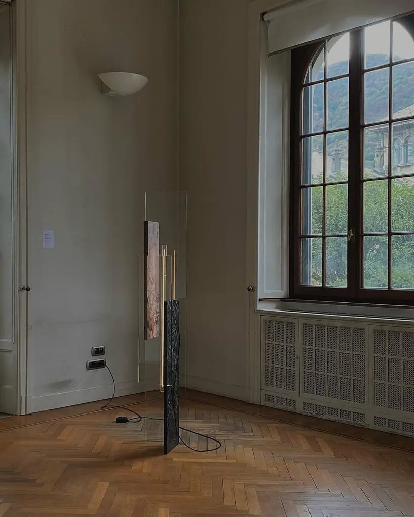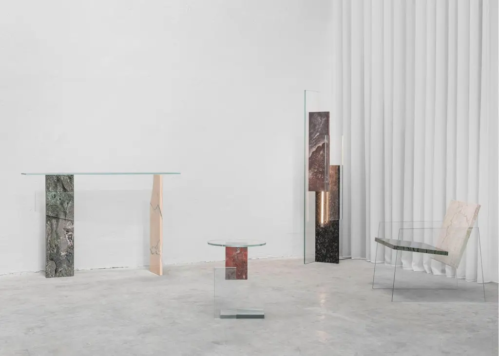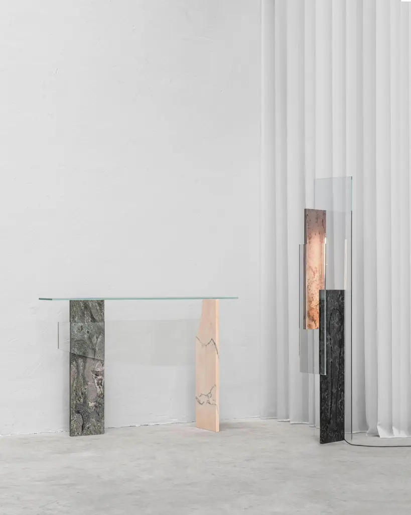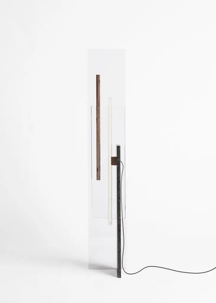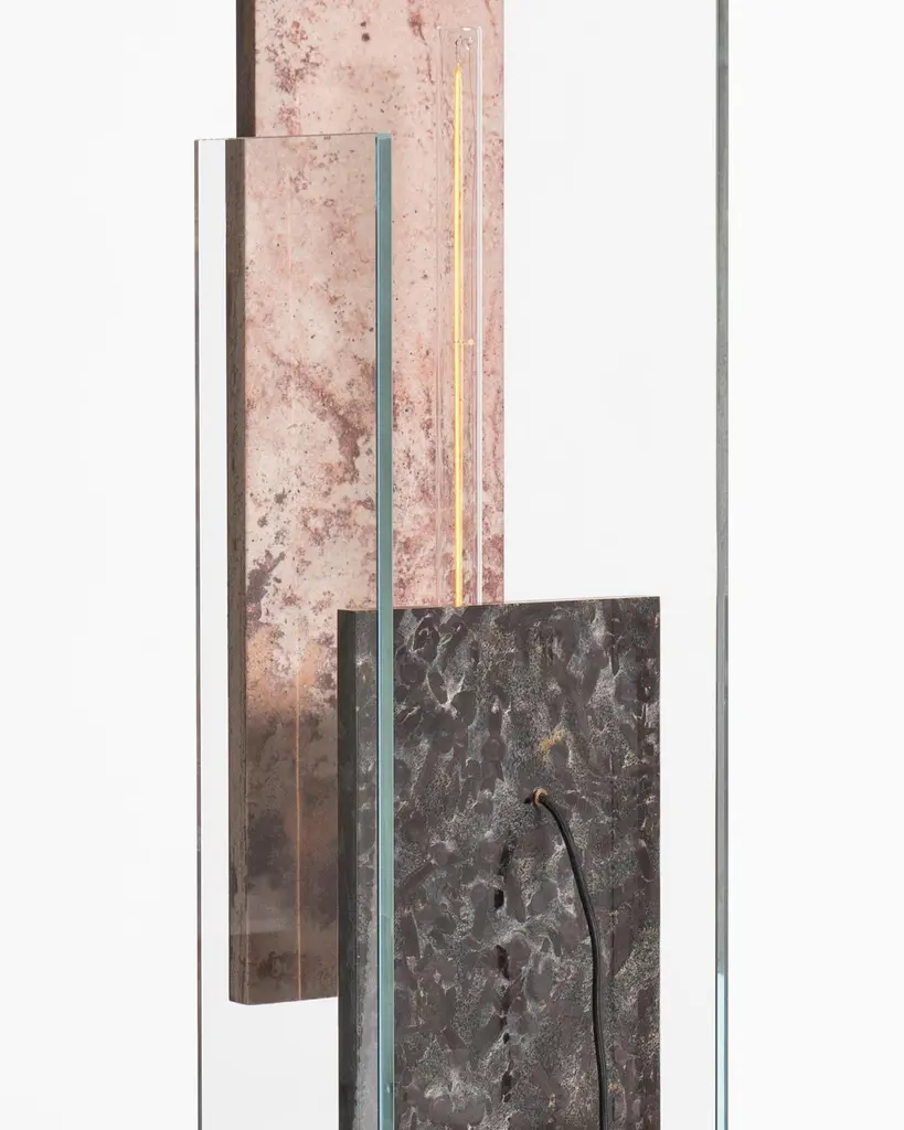Delta L floor lamp by Frederic SaulouLimited Edition of 5Materials: White glass, Green pink granit from Brazil, pink marble from Portugal.Dimensions: D 30 x W 28 x H 175 cmSigned and numbered."The first question that one could ask oneself in front of these works could be about the notion of balance or even volumetric understanding.Beyond the use, these two new pieces thus raise a technical and symbolic question announcing my creative reflection.Indeed, my work since 2013 tends to highlight the mineral materials from buildings and heritage to give them back their nobility, to question the territory around the material, know-how, in closeconnection with architecture and his history.For this new collection, I like to play on the dualities offered by the different properties of the materials used and their architectural uses, reflected in the tension and technicality betweenthe colored, dense and heavy stone in balance with the transparent glass, thin and light."Frederic Saulou's sculpted design artworks introduce a series of work coming from researches andpartnerships between local ateliers and designer, and implemented to another scale: That of the object and contemporary creation.Frédéric Saulou is a proeminent French contemporary designer.Born in 1989, Frédéric Saulou, lives and works in Rennes, in France. Graduated in space and environmental design at the Institut Supérieur des Arts Appliqués (LISAA) in 2011 and in object design at the Ecole Européenne Supérieure des Beaux Arts de Rennes (EESAB) in 2013, Frédéric will continue to perfect his experience within the Eric Gizard Associés agency and with the designer Frédéric Ruyant. In 2013, he founded the studio, Frédéric Saulou Design Studio, an independent and multidisciplinary design and consulting agency that sees design as a space for research and exchange that allows him to develop a sensitive approach to forms and materials.Experimentation and research take precedence over his work in order to think of new materials and new uses. This accompanies his daily approach so that each project is conceived as a sculpture in its own right, between simplicity and technicality. His approach guides him towards a global approach but also unique in his creations, thus creating particular interactions between the user and the object, between Industrial craftsmanship. Today Frédéric works on various projects, from objects to space, in series or limited editions and collaborates with prestigious institutions and brands such as the publishing houses Ligne Roset, Drugeot Manufacture, Brossier Saderne, Vista Alegre, Esprit Porcelaine Limoges etc.
