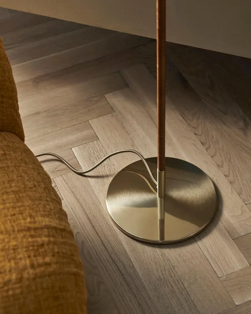 The 9602 Floor Lamp, also known as “Chinese Hat” was designed by Paavo Tynell in 1935 for the hotel Aulanko. Characterized by its elegant and airy lampshade and rattan-covered stem, the 9602 Floor Lamp shows the designer’s limitless imagination and unparalleled ability to create designs of enduring beauty. Adding a playful, exuberant quality to the top, balanced by the more static form of the base, the 9602 Floor Lamp is perfectly suited for creating a gentle ambient light in the domestic living room. Its refined silhouette makes it a timeless addition to both classic and contemporary interiors. With its warm materials and sculptural presence, the lamp is as much an object of art as it is a functional light source.- The lamp is available in four shade options: Canvas, Wicker Willow, Bamboo and Pierre Frey- Lampshade diameter: 63 cm- Lampshade height: 21 cm- Overall lamp height: 153.5 cm- Lightbulb socket: U.S. – 2 x E26 (Bulb not included)- Lumen watt recommended: 810 Lumen (6W-10W LED)- UL Certified for use in the U.S.-