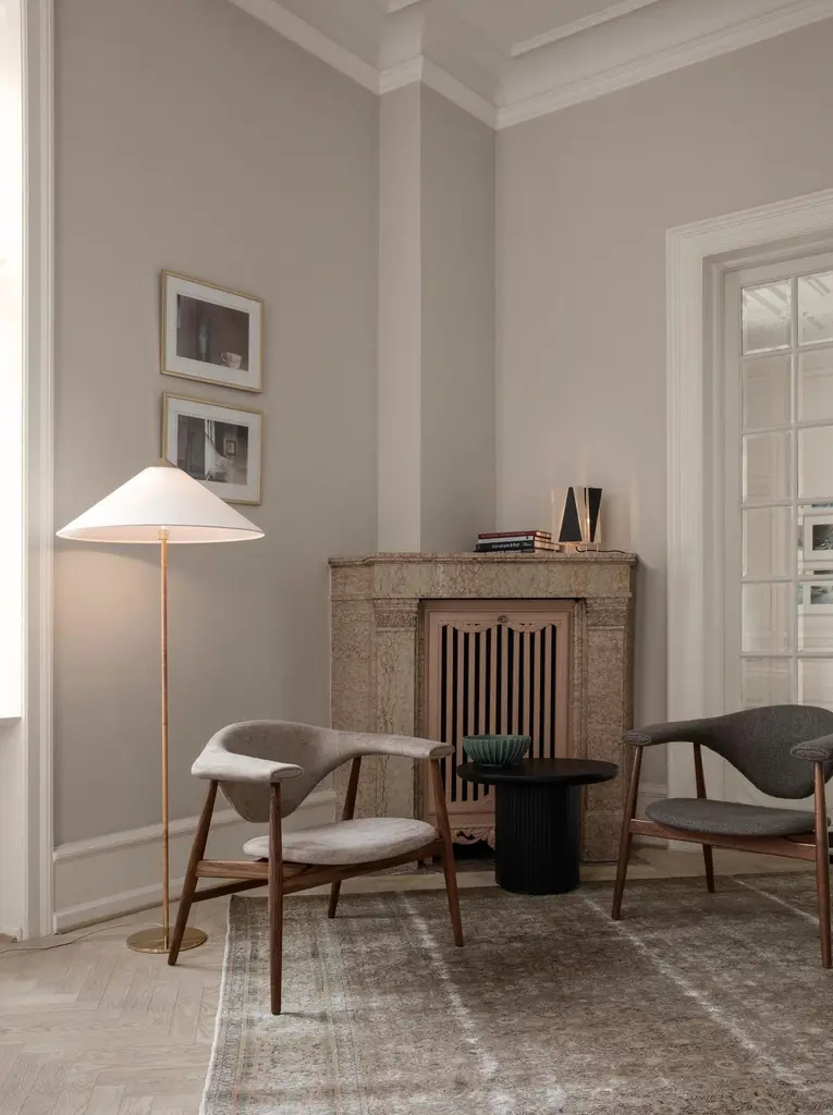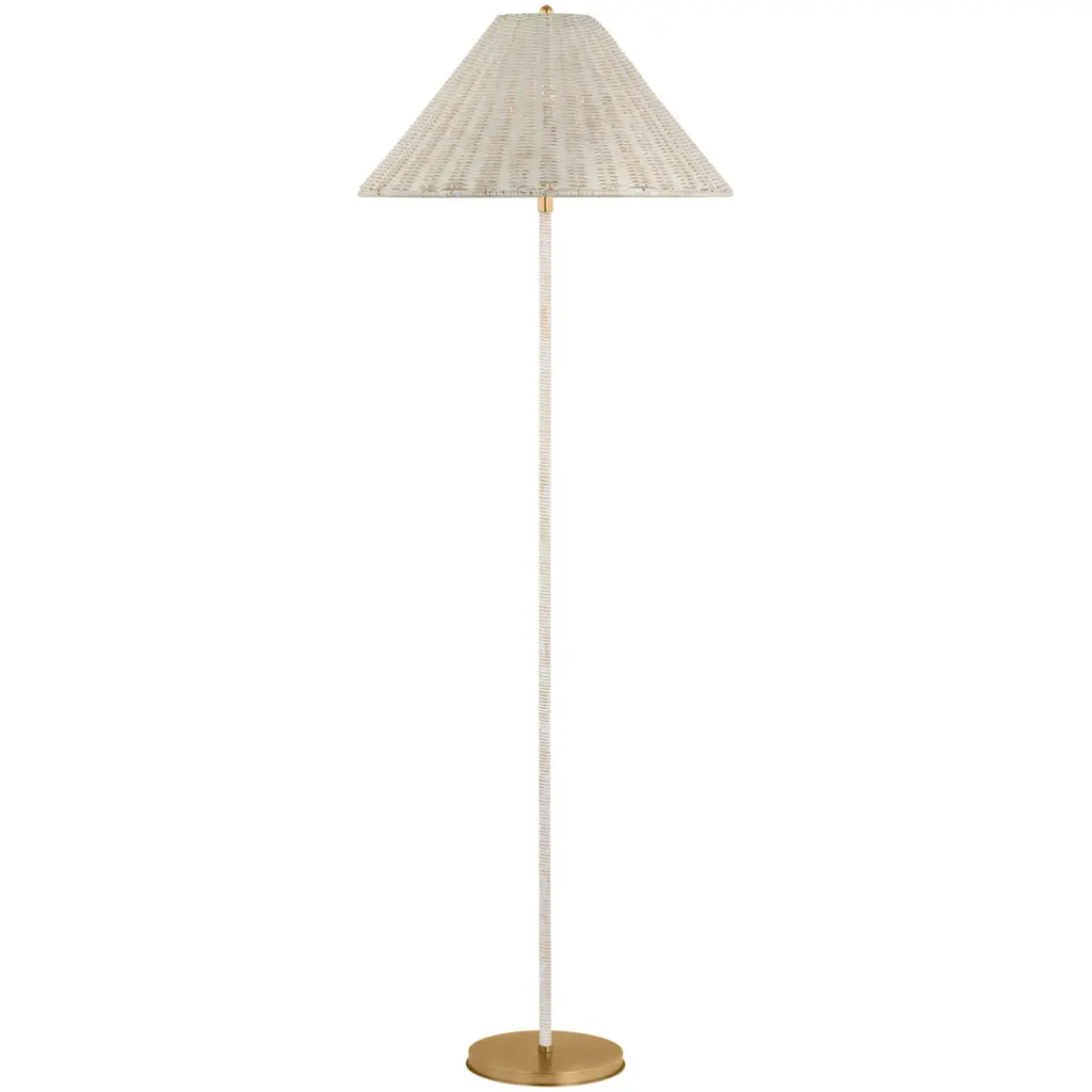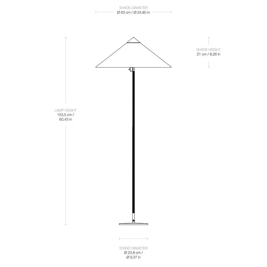 The 9602 Floor Lamp, also known as “Chinese Hat” was designed by Paavo Tynell in 1935 for the hotel Aulanko. Characterized by its elegant and airy lampshade and rattan-covered stem, the 9602 Floor Lamp shows the designer’s limitless imagination and unparalleled ability to create designs of enduring beauty. Adding a playful, exuberant quality to the top, balanced by the more static form of the base, the 9602 Floor Lamp is perfectly suited for creating a gentle ambient light in the domestic living room. Its refined silhouette makes it a timeless addition to both classic and contemporary interiors. With its warm materials and sculptural presence, the lamp is as much an object of art as it is a functional light source.- The lamp is available in four shade options: Canvas, Wicker Willow, Bamboo and Pierre Frey- Lampshade diameter: 63 cm- Lampshade height: 21 cm- Overall lamp height: 153.5 cm- Lightbulb socket: U.S. – 2 x E26 (Bulb not included)- Lumen watt recommended: 810 Lumen (6W-10W LED)- UL Certified for use in the U.S.