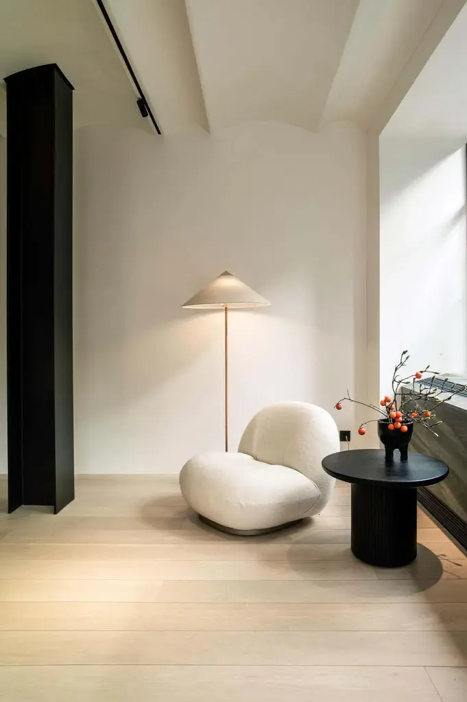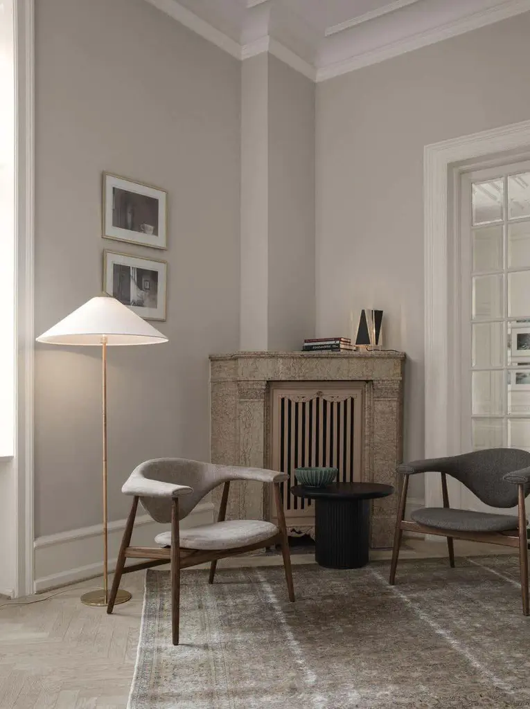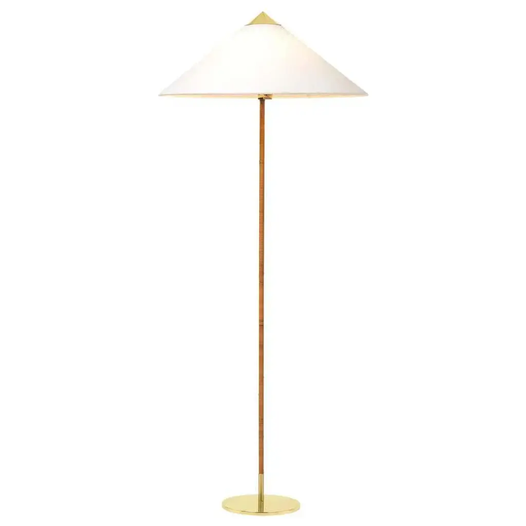 Originally designed by Paavo Tynell in 1935, this authorized GUBI re-edition is executed in brass, rattan and a fabric shade with brass finial. The 9602 floor lamp, also known as “Chinese Hat” was designed by Tynell for the Hotel Aulanko. Characterized by its elegant and airy lampshade and rattan-covered stem, the 9602 floor lamp shows the designer’s limitless imagination and unparalleled ability to create designs of enduring beauty. Adding a playful, exuberant quality to the top, balanced by the more static form of the base, the 9602 floor lamp is perfectly suited for creating a warm ambient light in any environment. Price is per item. Available in unlimited quantities. UL listed. On-off switch on pole. 6 feet of cord. Accommodates 1 x 60W max medium base incandescent bulbs (higher with LED). (1) lamp with canvas shade in stock in Los Angeles and can ship in 3-4 days otherwise In-stock lead time 3-4 weeks. Can take up to 8 weeks or more. In-stock availability subject to change.