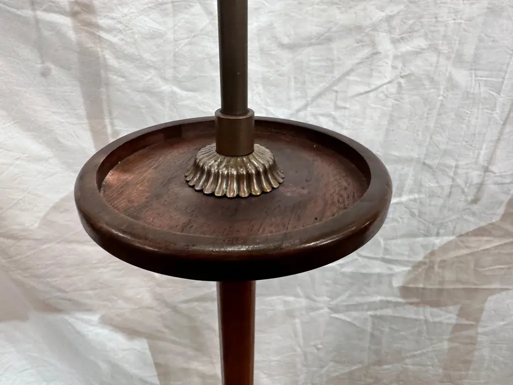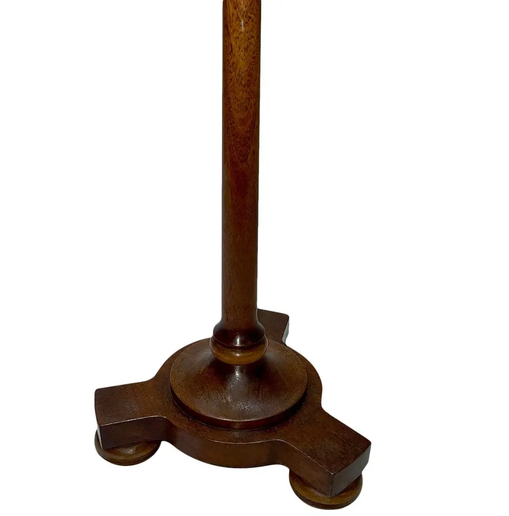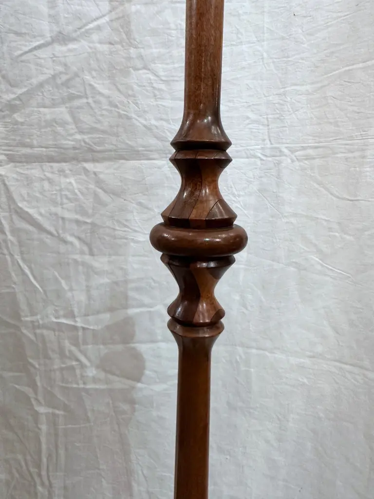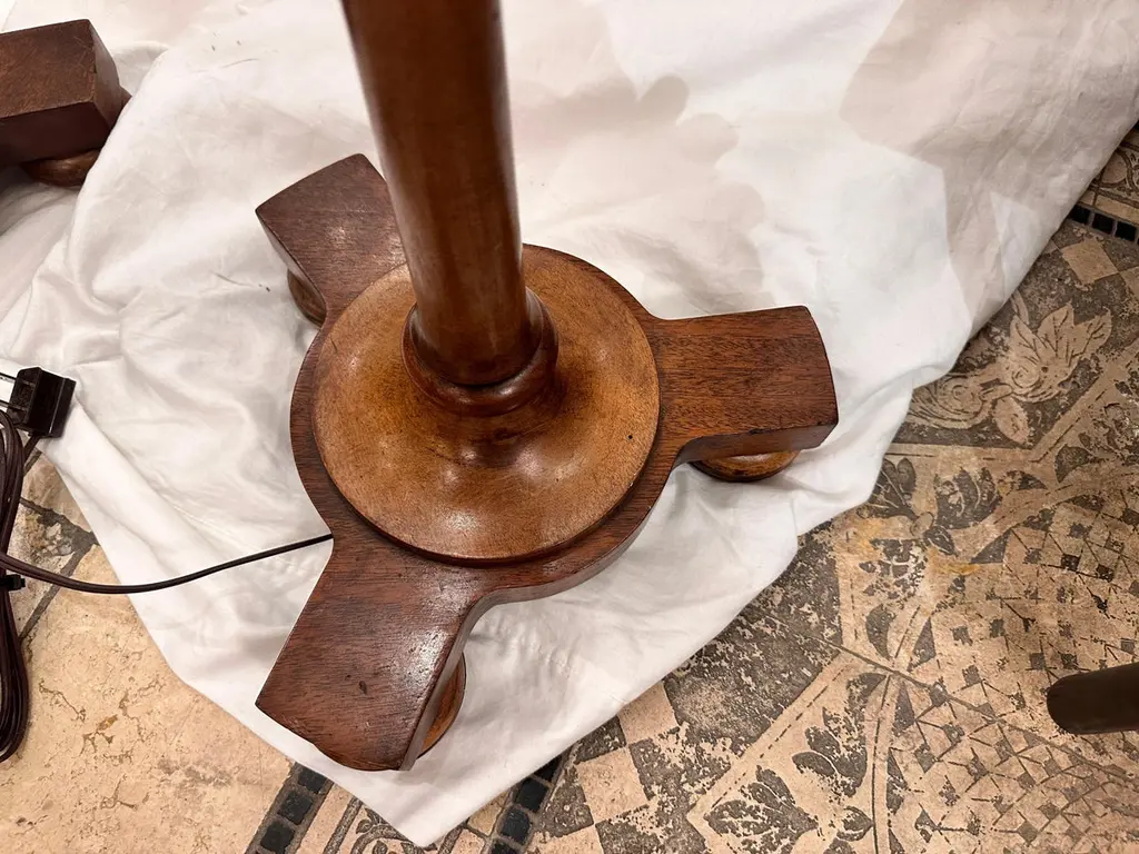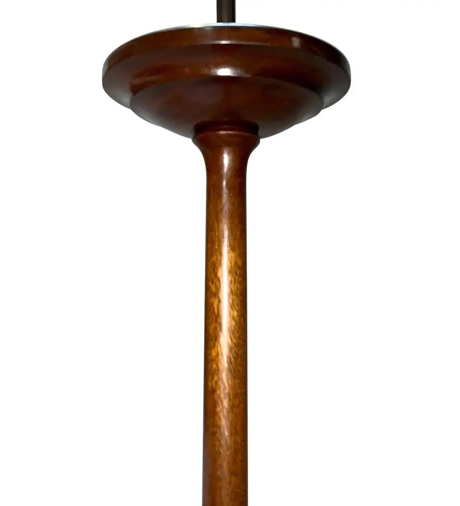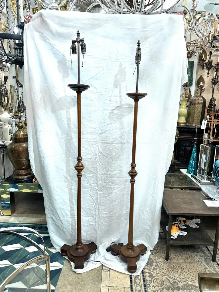 Pair of American 1920's carved wood floor lamps. One slightly taller than the other. Sold Individually.Measurements: Height of body: 52" and 53.5"Diameter of base: 12"Height of cluster: 12"