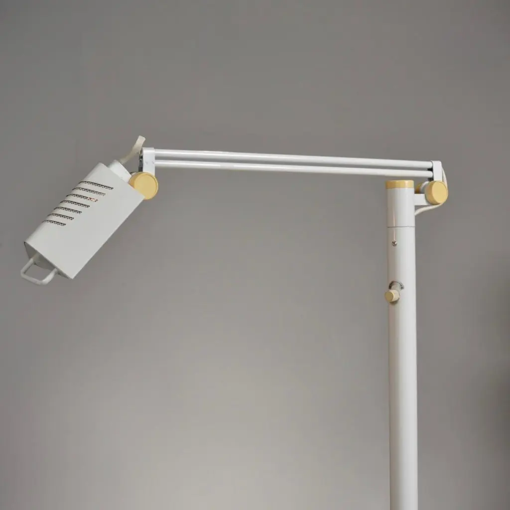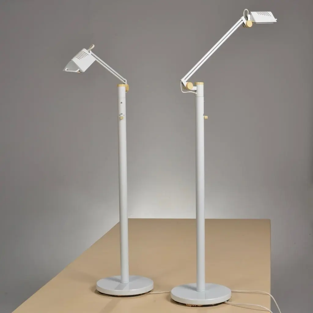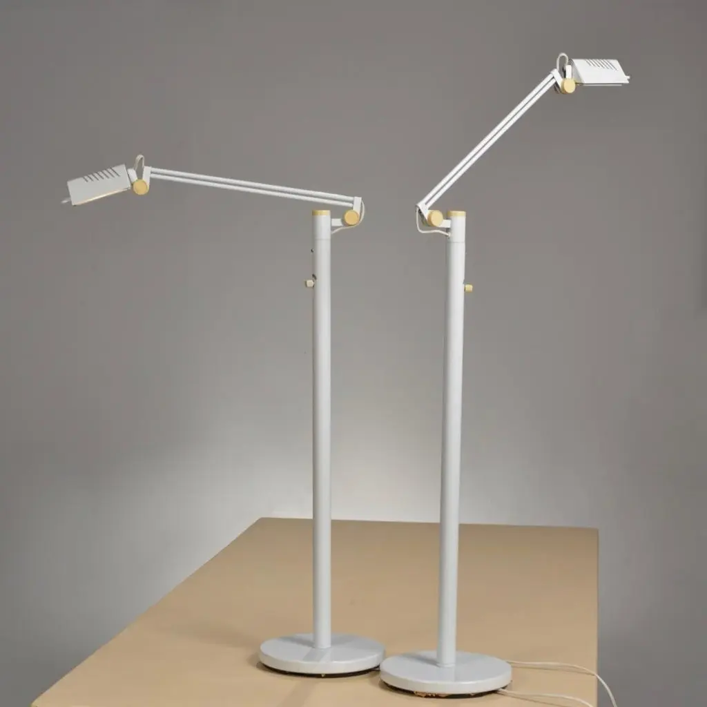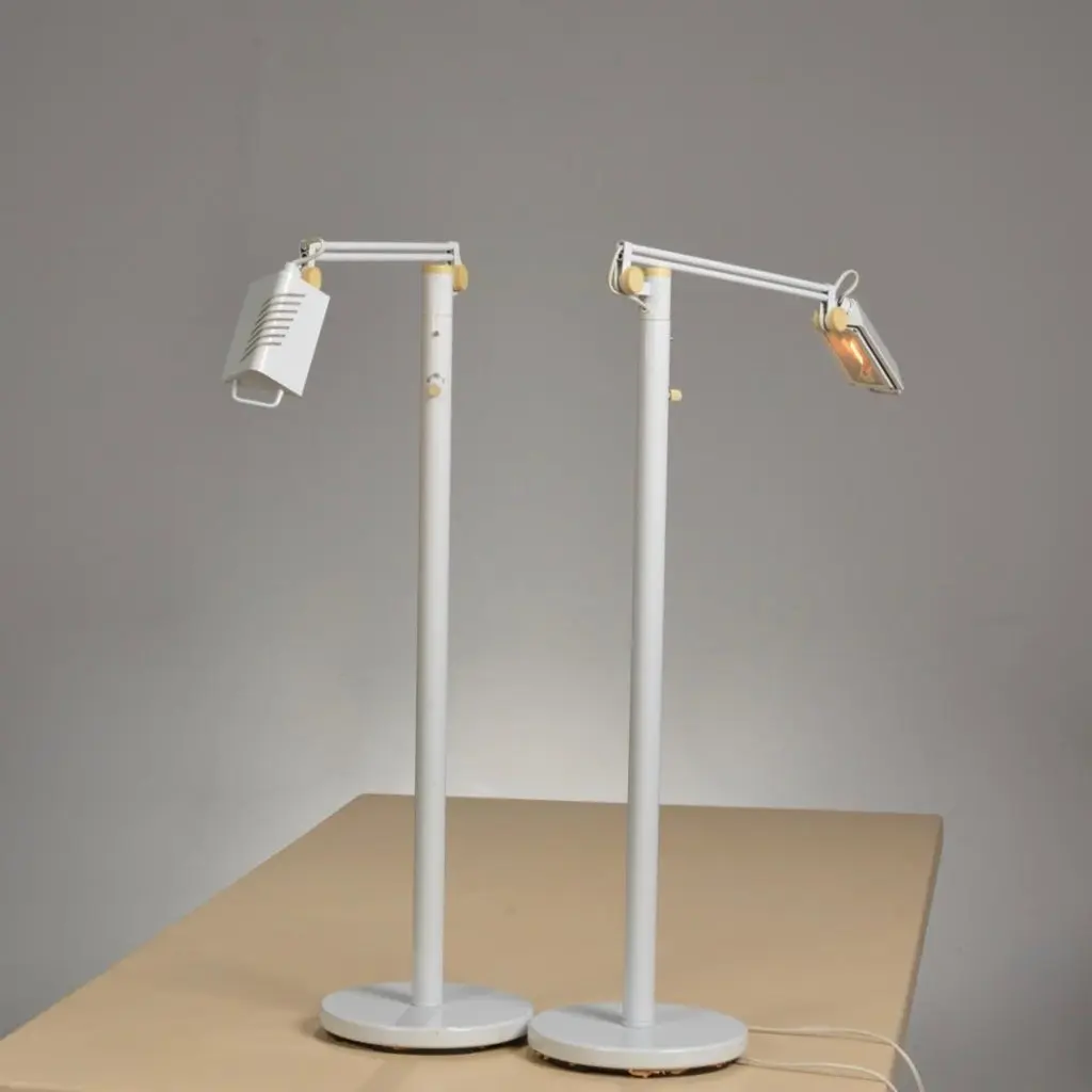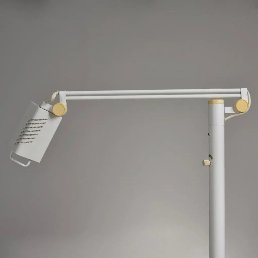 Pair of two Post Modern pharmacy style floor lamps. Articulating, adjustable hight and light head(measurements taken at full standing height). Featuring soft cream/yellow plastic, brightness adjusting knobs and details. This is a classic post modern silhouette with clean lines, playful simplicity, and intentional functionality. Italian made, sturdy, fully functioning, sold individually.