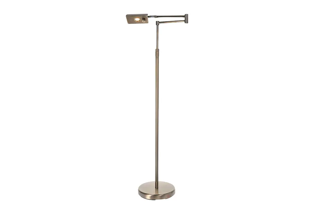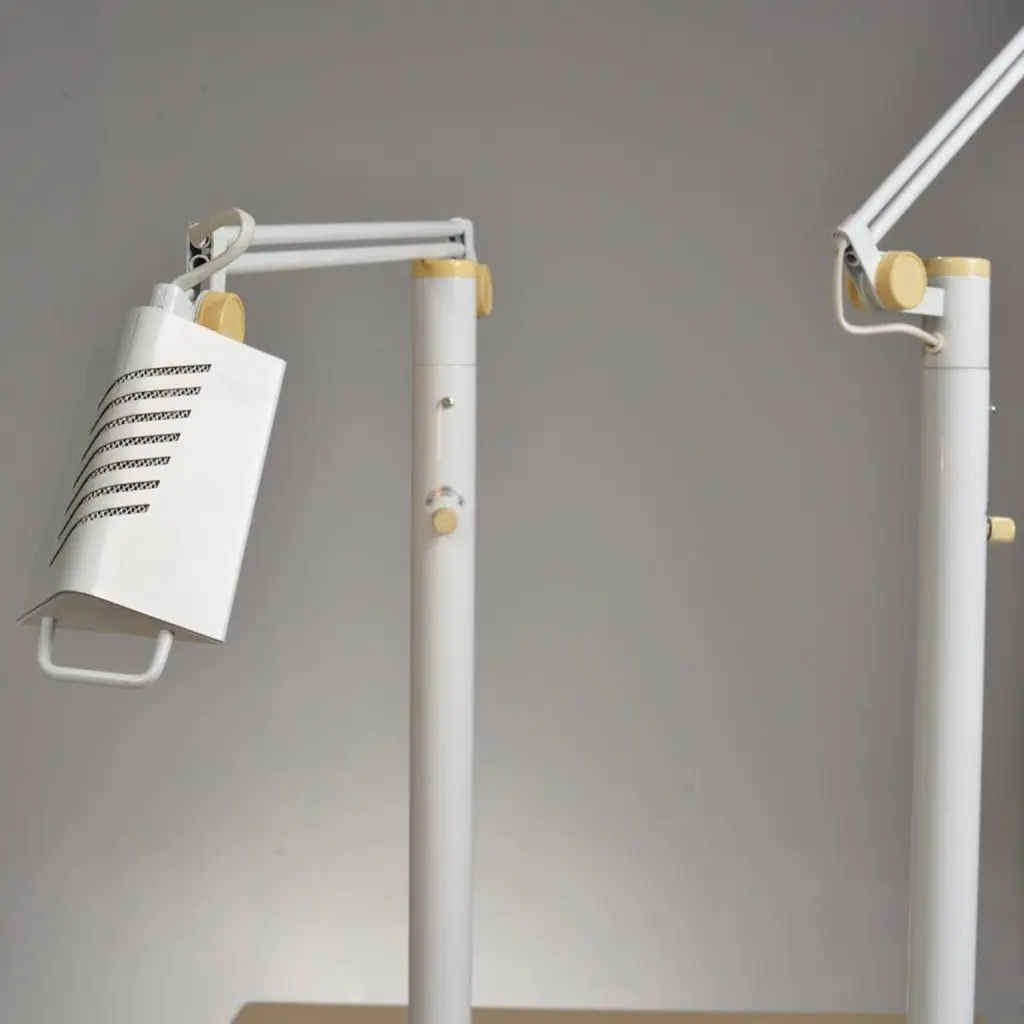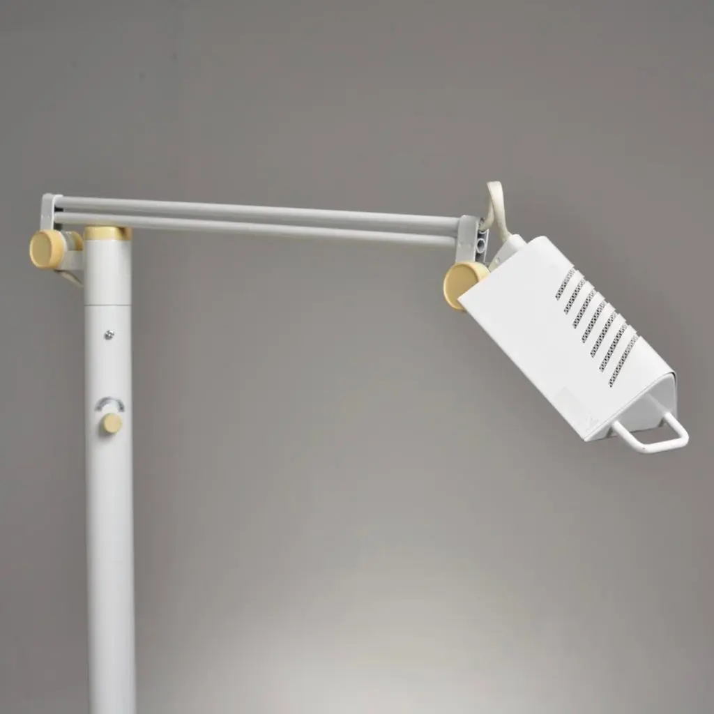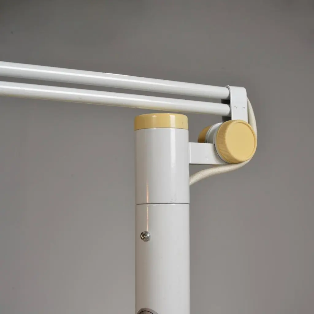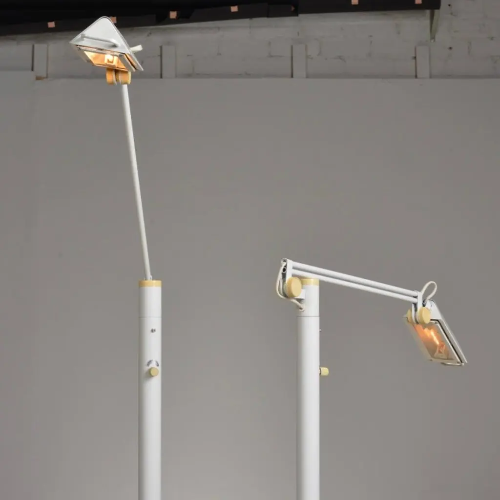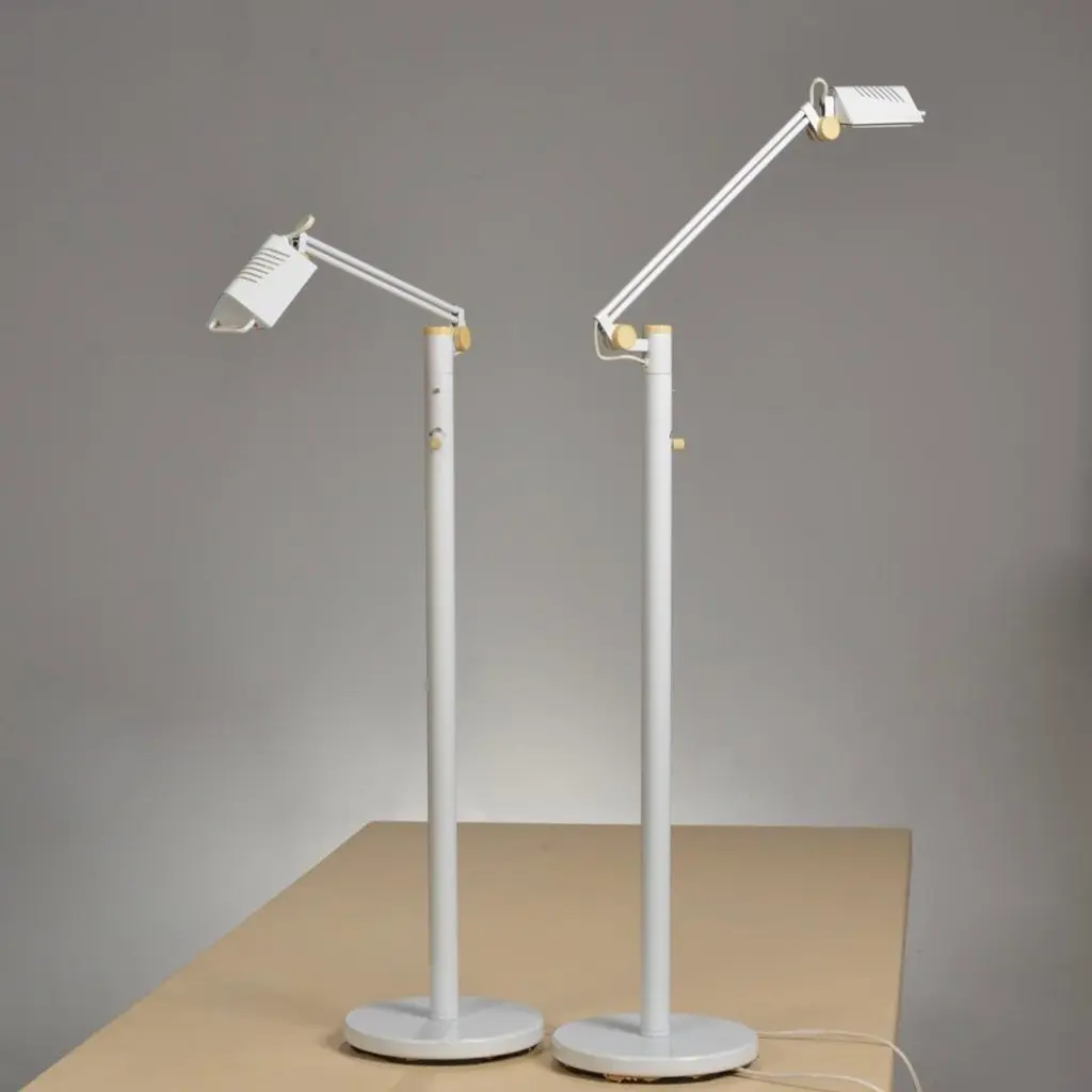 Pair of two Post Modern pharmacy style floor lamps. Articulating, adjustable hight and light head(measurements taken at full standing height). Featuring soft cream/yellow plastic, brightness adjusting knobs and details. This is a classic post modern silhouette with clean lines, playful simplicity, and intentional functionality. Italian made, sturdy, fully functioning, sold individually.