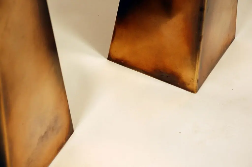 Pair of tall 'Pyramide' patinated brass console or floor lamps by Design Frères. The light source is concealed inside the pyramid base, illuminating the surface behind. Unique design.Also available in natural brass (as seen on the in situ picture).Wired with UL listed parts.