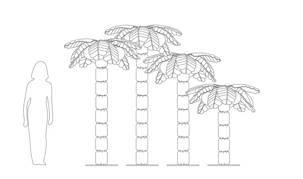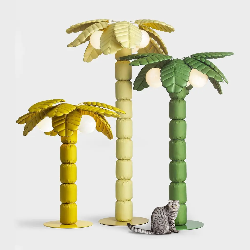 Padded standing light with painted steel structure. N°3 glass light bulbs 12 W, 2700 K and fabric wire. Palm Beach is a soft palm tree with crazy coconuts that double as lights. Palm Beach comes in a series of bright and neutral colors (20 different colors), and it’s available in three different heights.