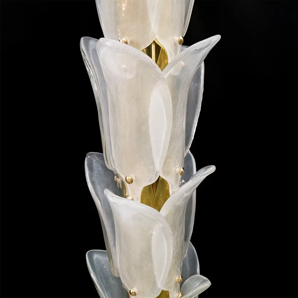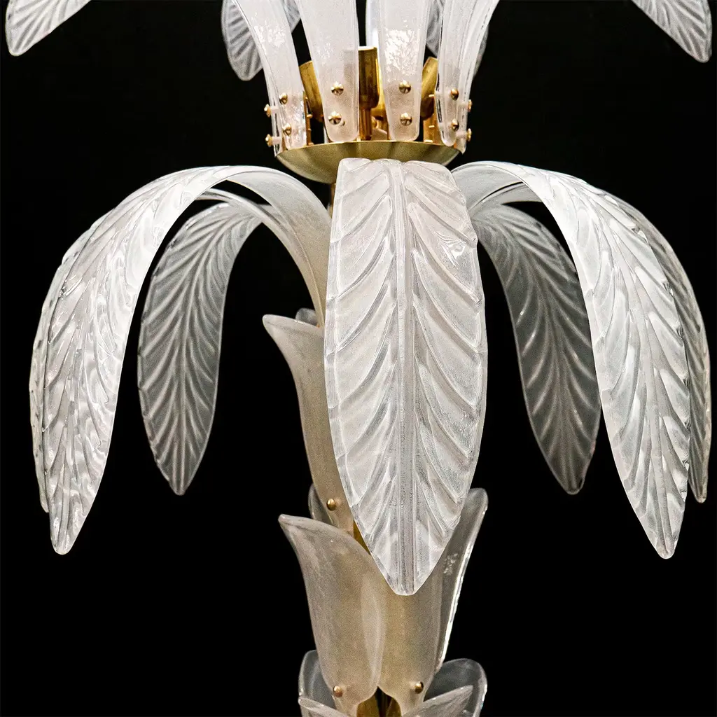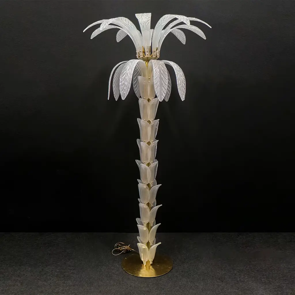 An iconic design of contemporary taste, this palm-shaped floor lamp is a precious and refined artwork handcrafted of first-rate opaline white Murano glass. Featuring a gold-finished brass structure, it features four adjustable lights. A stately and captivating addition to a contemporary-style interior setting. Please inquire with the Concierge for further information.