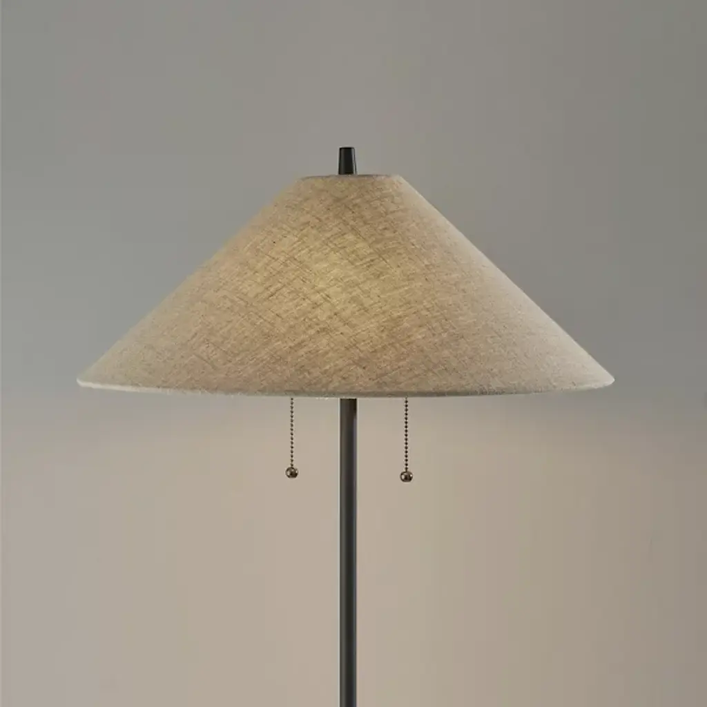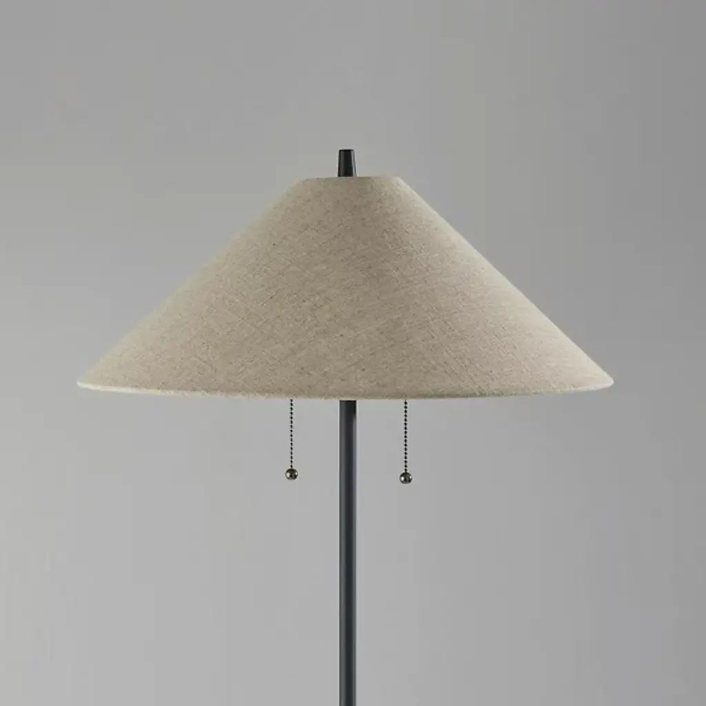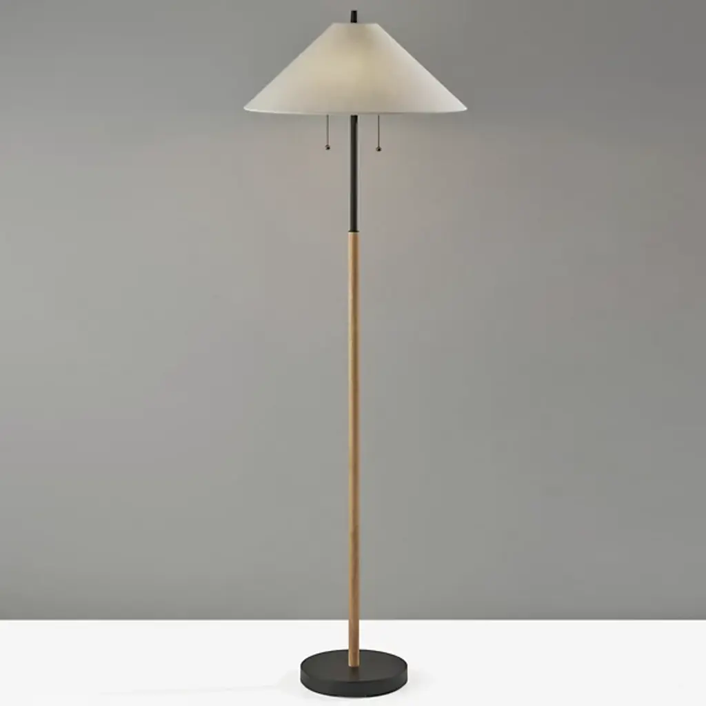 Elevate the refined styling of your rooms with the mixed materials design of the Palmer Floor Lamp from Adesso. Blending metal and wood, this slender piece is an easy addition around the home. It catches the eyes with the contrasting colors of its base and column. A retro-inspired lampshade caps the piece off with a minimal sensibility. The white textured fabric shade softly diffuses light for minimal glare. Operated by dual pull chain switches, the lamp powers on via a slender cord.