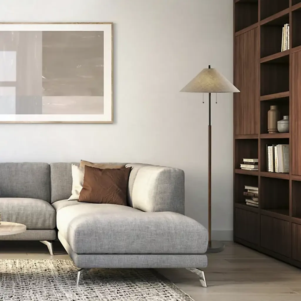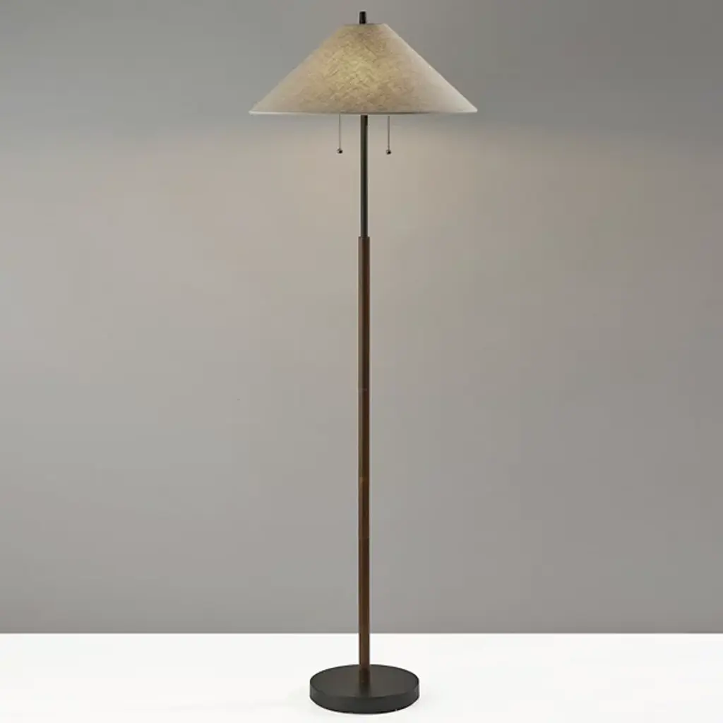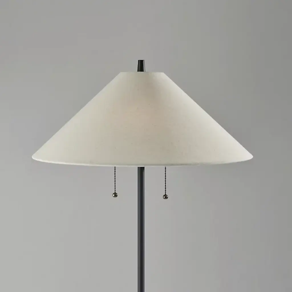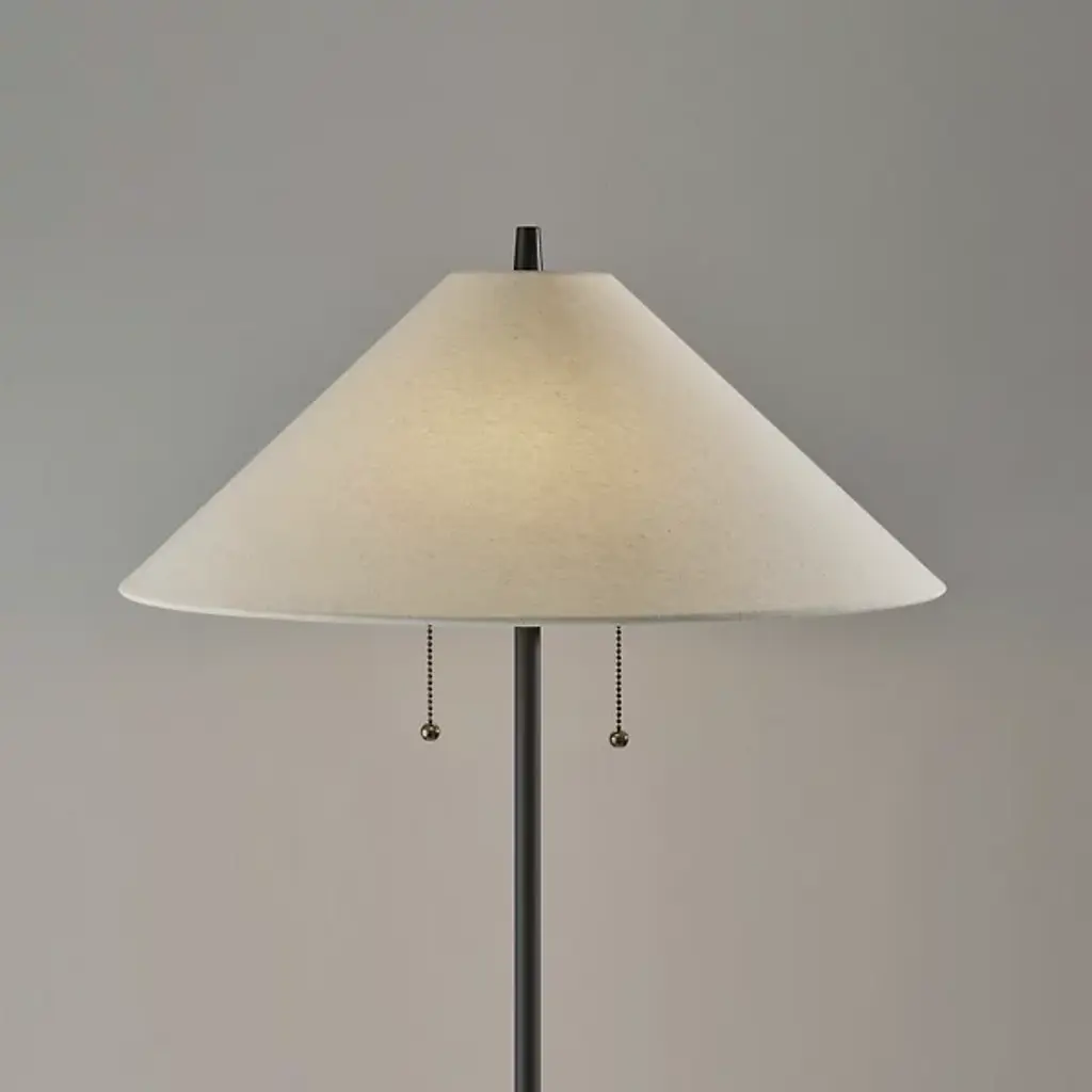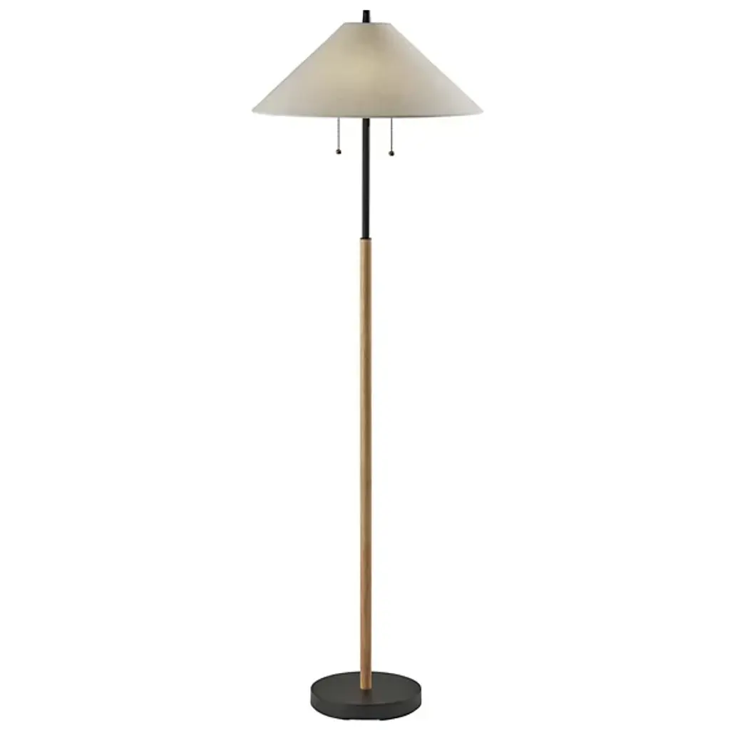 Elevate the refined styling of your rooms with the mixed materials design of the Palmer Floor Lamp from Adesso. Blending metal and wood, this slender piece is an easy addition around the home. It catches the eyes with the contrasting colors of its base and column. A retro-inspired lampshade caps the piece off with a minimal sensibility. The white textured fabric shade softly diffuses light for minimal glare. Operated by dual pull chain switches, the lamp powers on via a slender cord.