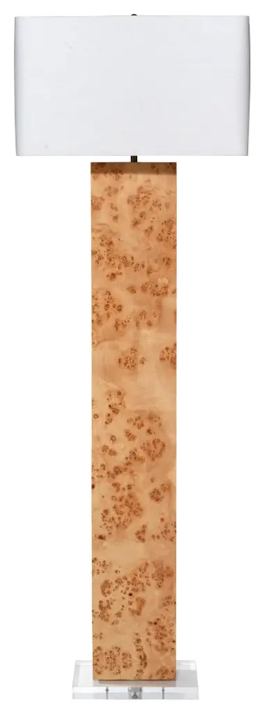 Crafted of burl wood veneer, the clean-lined design of this floor lamp takes on an earthy elegance with its richly grained one-of-a-kind patterns. Balanced on a clear acrylic base and topped with a rectangle linen shade, this floor lamp is the perfect choice for your home. •Crafted of Burl Wood Veneer•100% White Linen Rounded Rectangle Shade•Acrylic Base•Plug-InThe handcrafted nature of burl wood creates products with character and individuality. The inherent knots, grains, and variations in tone and texture are preserved, to create pieces rich in detail and natural beauty. These unique imperfections and variations are what define our products, with each piece having its own personality. •Lamp Dimensions: 50.75"H x 13.5"W x 9.5"D•Shade Dimensions: 12.5"H x 21.25"W x 14"D•1 bulb required; Bulb Not Included•150 Max Wattage; 120 Volts•E26 Bulb Base Type •8 Ft Clear/Silver Exposed Cord•3-way SwitchCare Instructions: We do not recommend using harsh or abrasive cleaners at any time as they can damage product. Wipe surfaces gently with soft, dry cloth. If needed, you may use a lightly damp cloth with water only on base.
