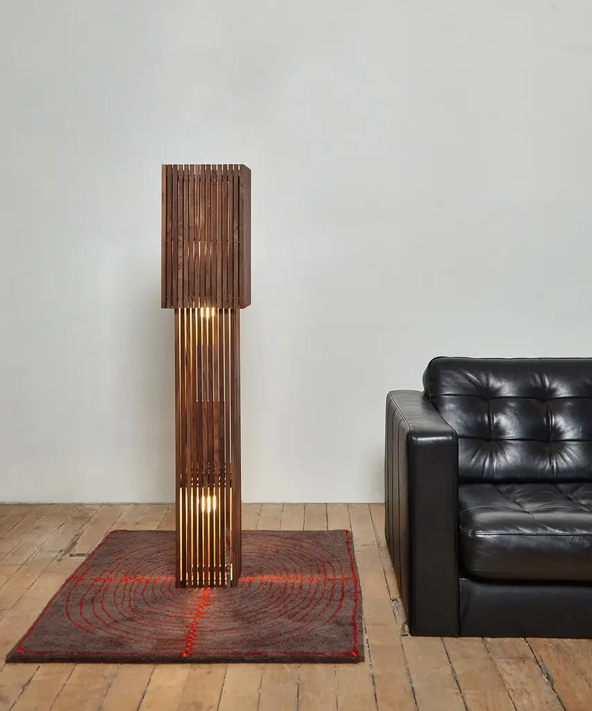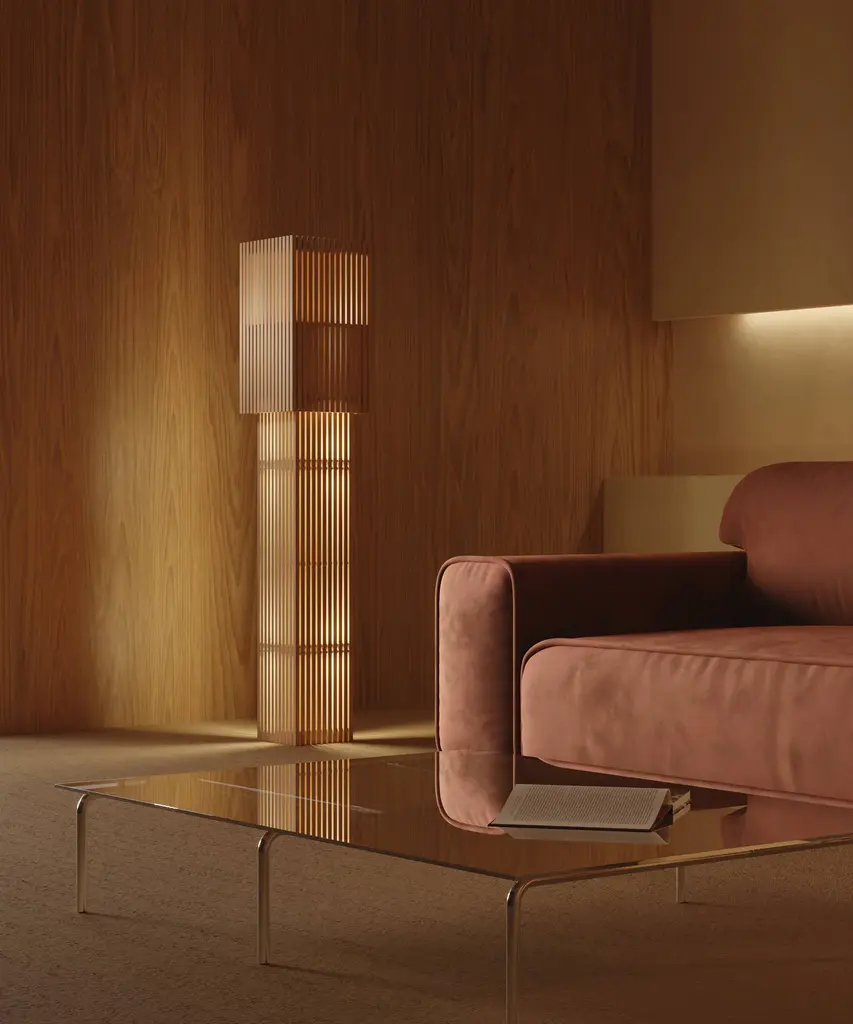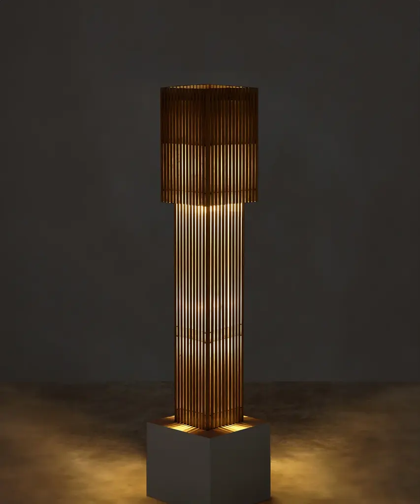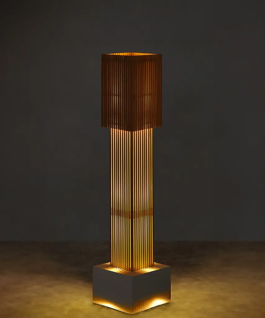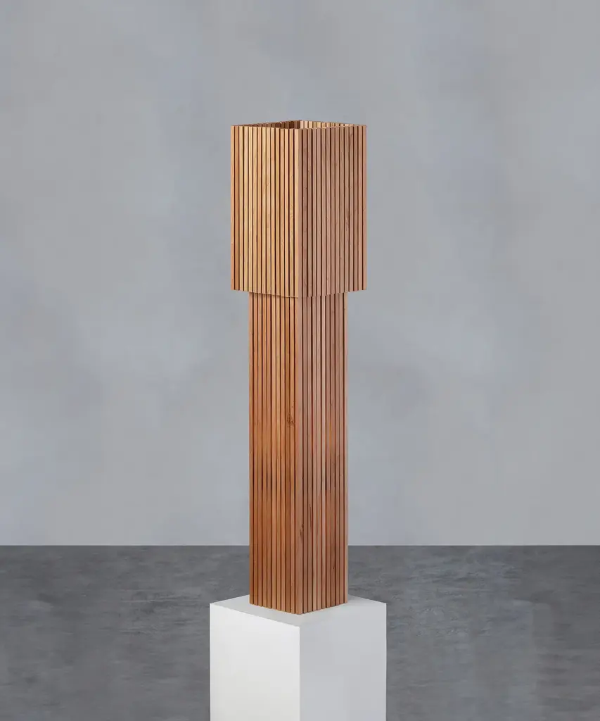 Of the whole collectionThe Parállilo collection references Greco-Roman columns—geometric in construction, yet organic in its soft play with light. Hand-brushed wooden dowels both block and direct the lamp’s concealed LED bulb, casting an uneven glow through the vertical strips of the lamp’s body. The removable top-shade functions as a manual dimmer, allowing the lamp to transform in shape and in intensity. Of the whole collection, the floor lamp best conveys the grandeur of the Greco-Roman columns from which Parállilo draws inspiration. Designed by Montreal based Stamátios Fragos.
