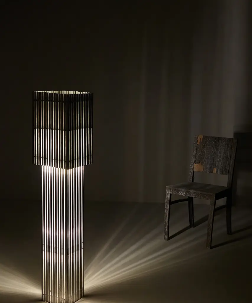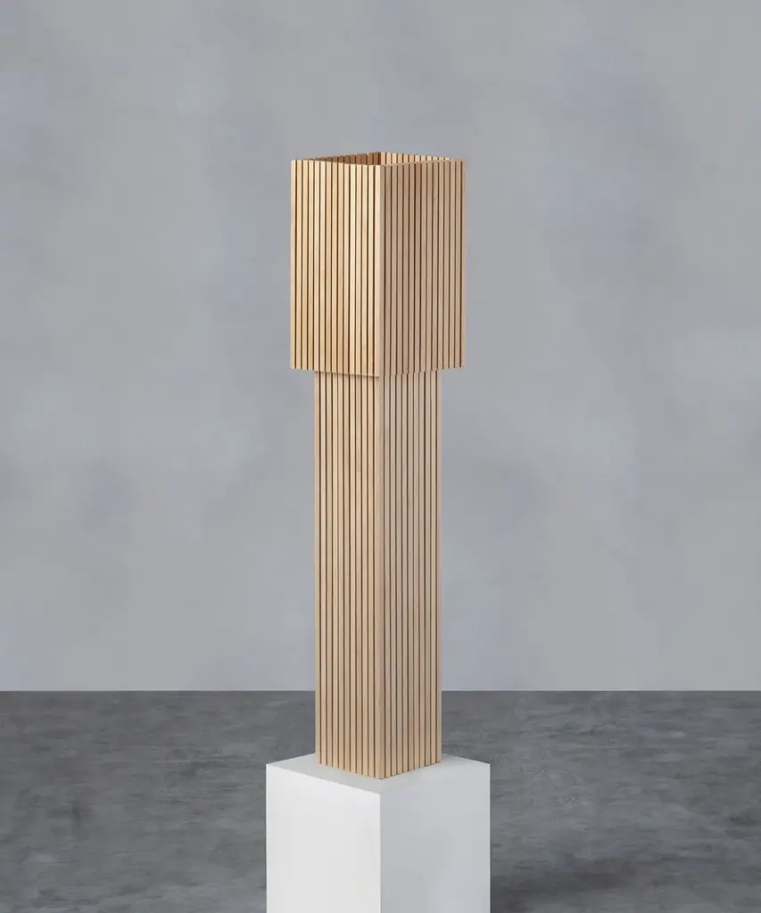 Of the whole collectionThe Parállilo collection references Greco-Roman columns—geometric in construction, yet organic in its soft play with light. Hand-brushed wooden dowels both block and direct the lamp’s concealed LED bulb, casting an uneven glow through the vertical strips of the lamp’s body. The removable top-shade functions as a manual dimmer, allowing the lamp to transform in shape and in intensity. Of the whole collection, the floor lamp best conveys the grandeur of the Greco-Roman columns from which Parállilo draws inspiration. Designed by Montreal based Stamátios Fragos.