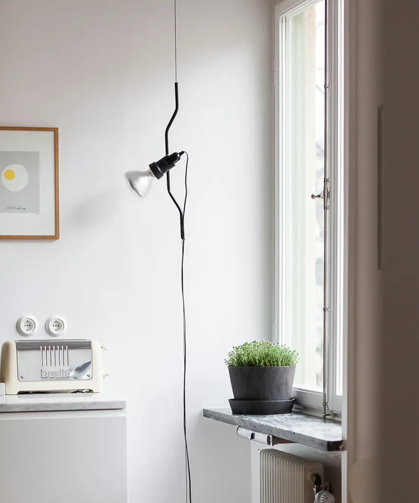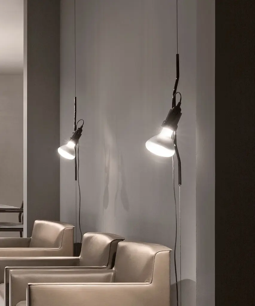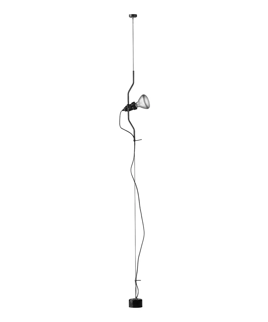 Borne out of a 1971 collaboration between Achille Castiglioni and Pio Manzù, the Parentesi was named for the parenthesis symbol-a visual reference to the nickel-plated shaped tube that lives on a floor-to-ceiling steel cable. The steel cable can reach up to 157", and the tube allows the lamp head to move vertically along the cable to achieve a customized height. The head fixture is an injection-molded black elastomer, equipped with a switch. The Parentesi provides direct lighting and is available in black, nickel, or red. Note: Lamp bulbs and dimmers are sold separately. Inspiration behind the design: "Pio Manzù had the original idea for Parentiesi," explains Achille Castiglioni. "He thought up a fixed vertical boom and a cylindrical box with a slot for the light, which went up and down: you stopped it with a screw. He replaced the boom with a metal cord that, when bent, creates friction and enables the lamp to be in position without requiring any screws." This authentic design is produced in Italy exclusively by Flos.