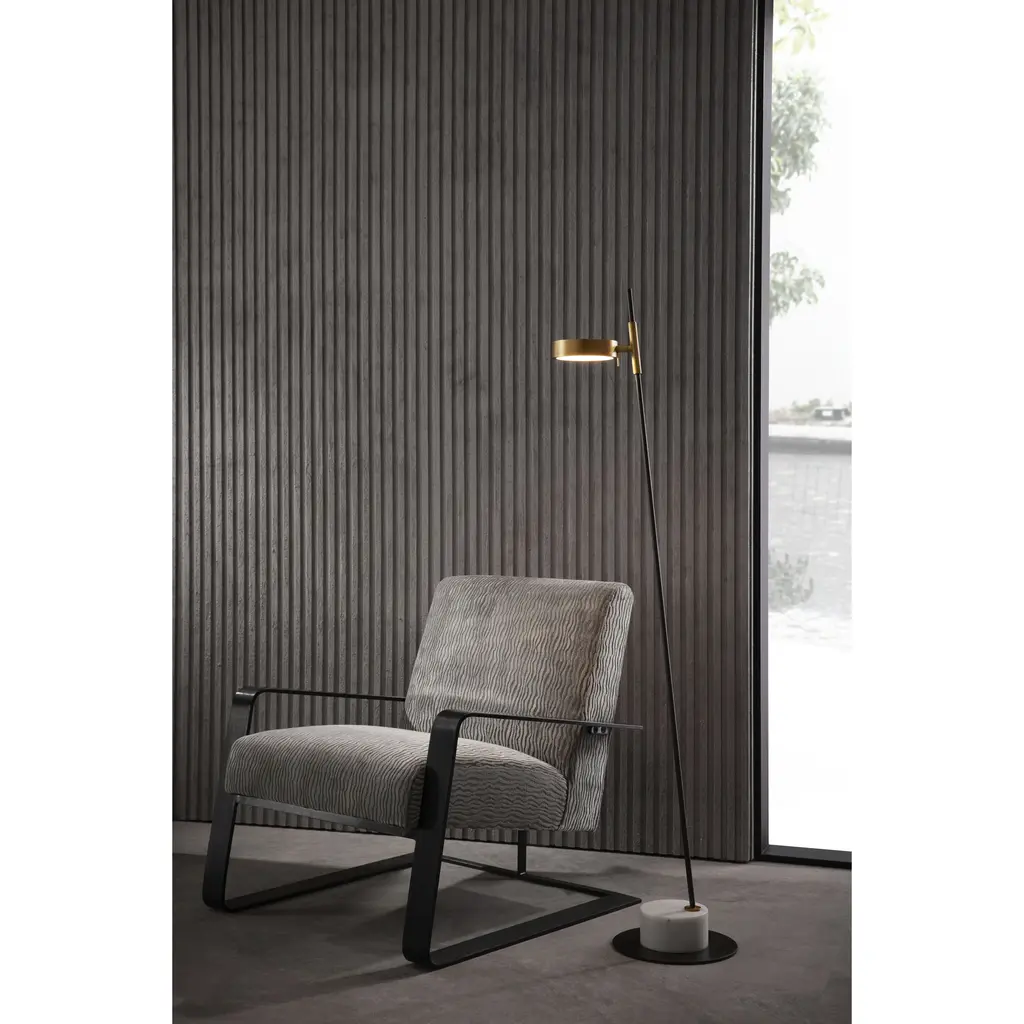 The Park floor lamp imparts an apothecary sensibility with its lithe frame and geometric head. Created in high-contrast bronze and antique brass steel, the angled, LED task lamp is fitted with a clear acrylic diffuser and a pin for pivoting and directing light. The lamp sits on a white marble plinth base and features an antique brass metal shade. Finishes will vary.