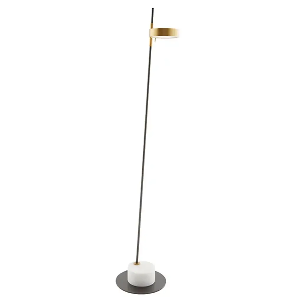 The Park LED Floor Lamp from Arteriors merges historical apothecary influences with modern functionality through its precisely engineered adjustable design. The geometric head pivots on a specialized pin mechanism for exact light positioning. The contrasting bronze and brass finishes create purposeful tension while maintaining material unity. The clear acrylic diffuser softens the LED illumination without diminishing its directional quality. The Park Floor Lamp incorporates a marble plinth base that provides both stability and textural contrast to its metal framework. It is an ideal addition to reading nooks, workspaces, and conversation areas.
