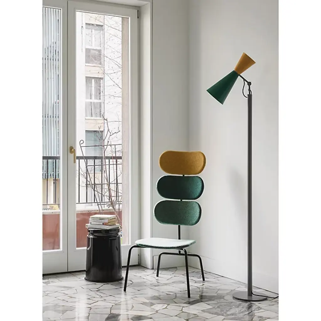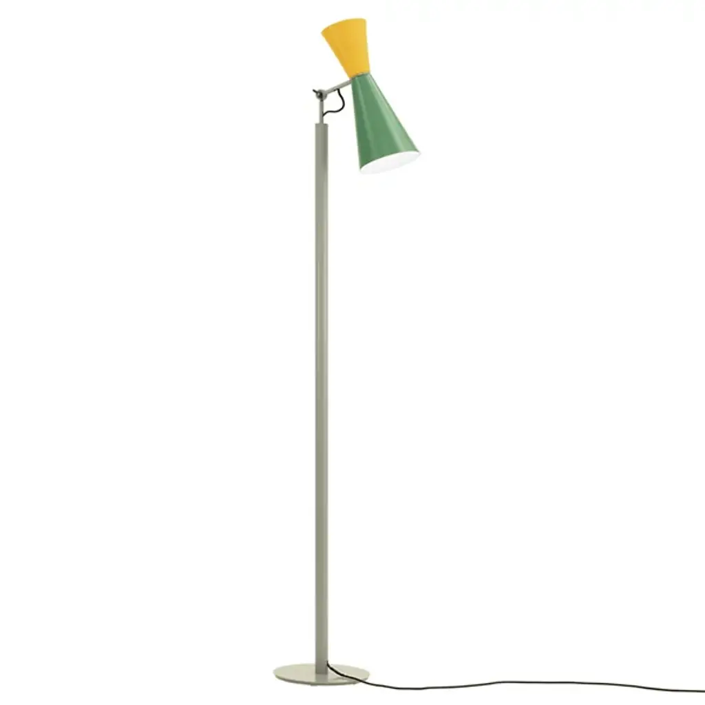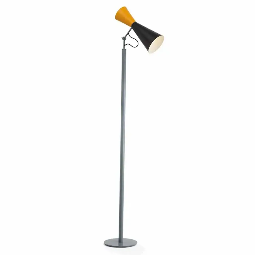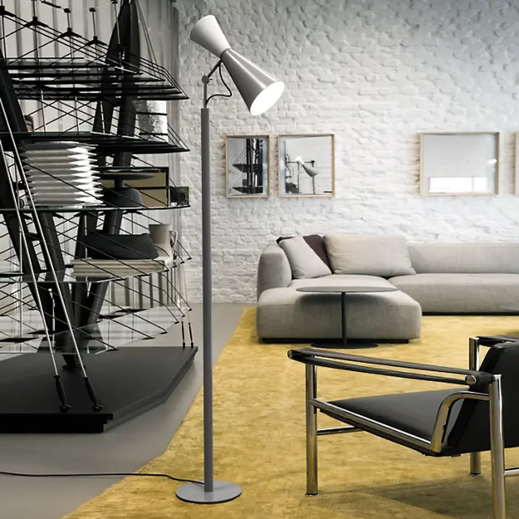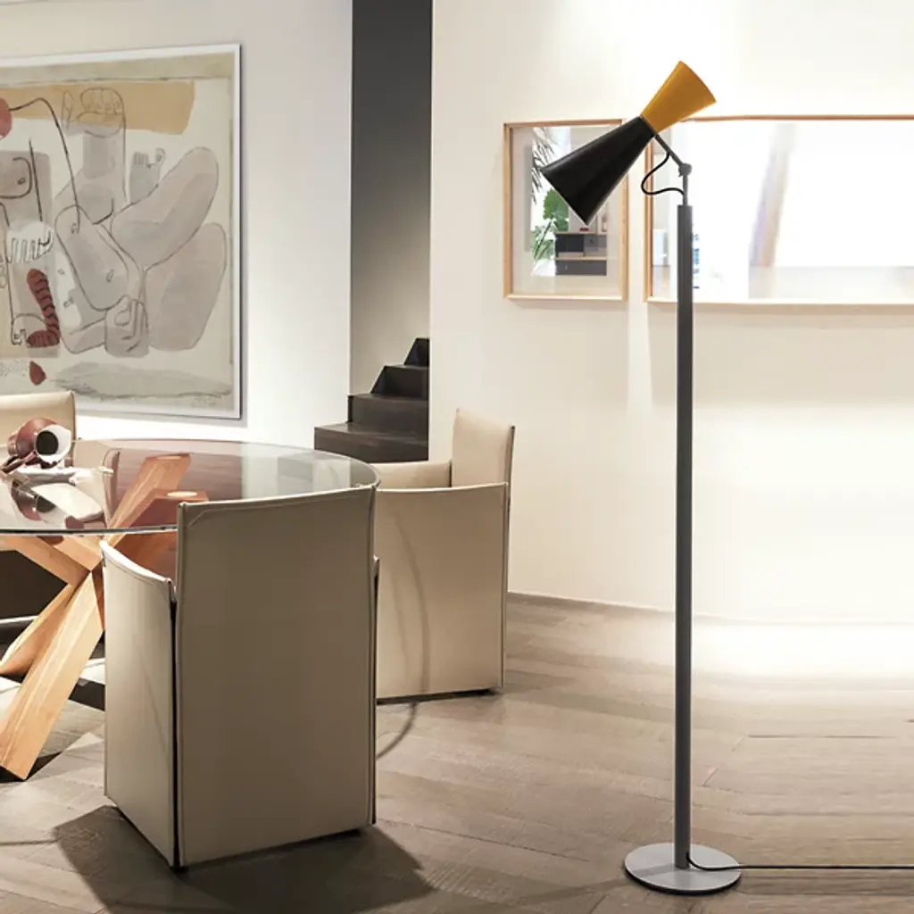 Ambient and warm light. The Parliament Floor Lamp from Nemo features a beautiful form that was designed by Le Corbusier for India’s Chandigarh Parliament in 1963. Le Corbusier stresses functional design solutions, and he looked to primary shapes for this construction, and this floor lamp adorns this space with a slim and solid design. Painted metal cones—which Le Corbusier has described as the “most beautiful forms”—create a fluid silhouette with a dual-lighting setup.