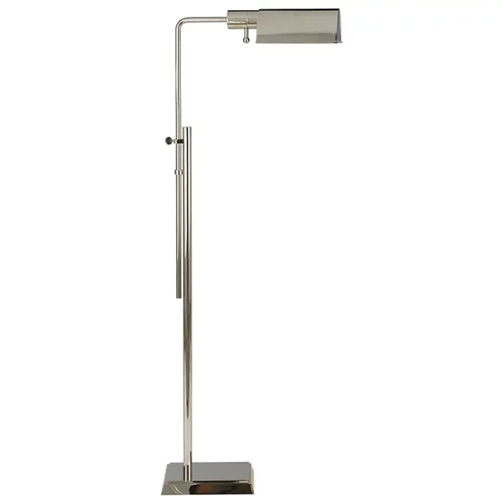 The Pask Pharmacy Floor Lamp by Visual Comfort Signature, formerly known as Visual Comfort, puts on display design that is informed by geometry, using corners and angles to contrast and complement other rounder, smoother features. Unique double stem adds style and allows for significantly adjustable height. 6-inch by 9-inch base provides stability. Dimmer switch at the socket. Designed by Thomas O’Brien.