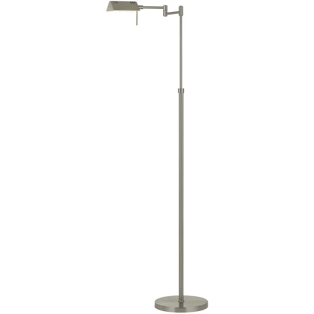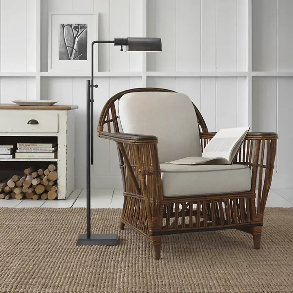 The Pask Pharmacy Floor Lamp by Visual Comfort Signature, formerly known as Visual Comfort, puts on display design that is informed by geometry, using corners and angles to contrast and complement other rounder, smoother features. Unique double stem adds style and allows for significantly adjustable height. 6-inch by 9-inch base provides stability. Dimmer switch at the socket. Designed by Thomas O’Brien.