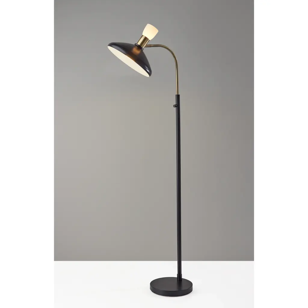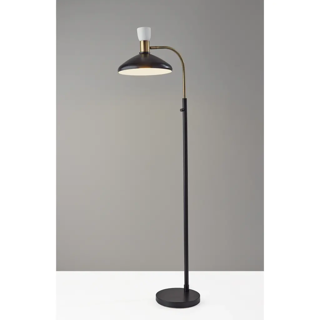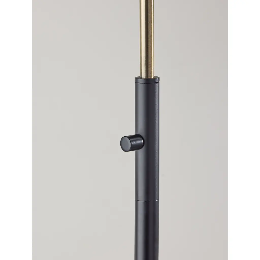 The 61" tall Patrick floor lamp offers versatile lighting while blending industrial, modern chic, and mid-century modern design for the perfect addition to your space. Featuring a mix of metal finishes, the round black base leads to a black tube that transitions to a slim, antique brass stem. The antique brass finish continues through the base of the lamp head for a stylish contrast to the black metal. For a distinct look and versatile lighting options, the desk lamp features dual lampshades. The main light is surrounded by a large, 11.5" diameter round shade with a black metal exterior and white finish on the interior that directs the light from a 60W bulb downwards. With the shade opening leaving the lightbulb exposed, a vintage Edison bulb (not included) makes for an eye-catching addition. The smaller , 3" diameter lampshade is constructed of frosted glass and directs warm light upwards from the included 3W LED light. For multifunctional lighting options, the lamp head can be pivoted both up and down and side to side, allowing you to direct the light wherever it's needed. A 4-way rotary switch located on the lamp pole allows you to set the best lighting for your needs: only the main light illuminated, only the LED light illuminated, or both illuminated together. Complete your décor with the coordinating Patrick desk lamp. Features: Complements industrial, modern chic, and mid-century design. Dual lampshades provide a unique look and versatile lighting options. Adjustable head allows you to direct the light wherever it's needed. Easily adjust the brightness by using only the main light, only the LED light, or both. Complete your décor with the coordinating Patrick desk lamp. Lamp Measures 61"H. x 15.75"W. x 11.5"D. Shade measures Metal:11.5"Dia*4.25"HGlass:3"Dia*2.75"HTotal:11.5"Dia*9.25"H Meta l& Glass Shade Shade Fitter is Screw Down Uno Type A 60W Bulb (not included) / 3W LED (Included) E26 4-way Rotary Switch on Pole Round 10"Dia x 1"H 60" Clear cord