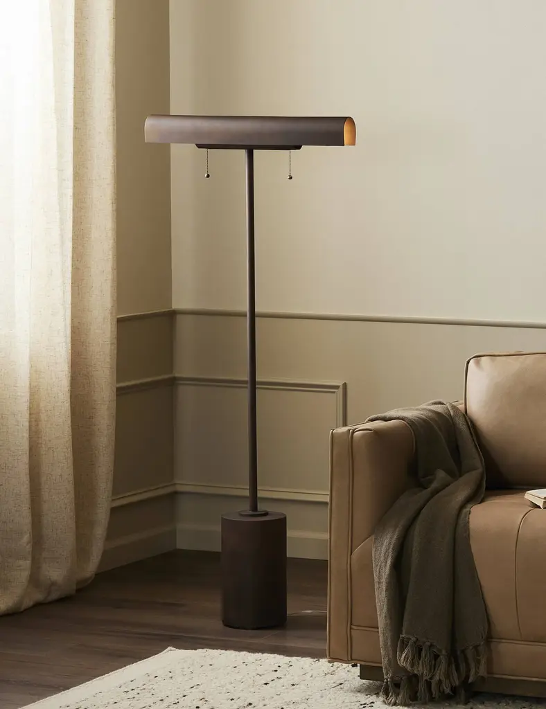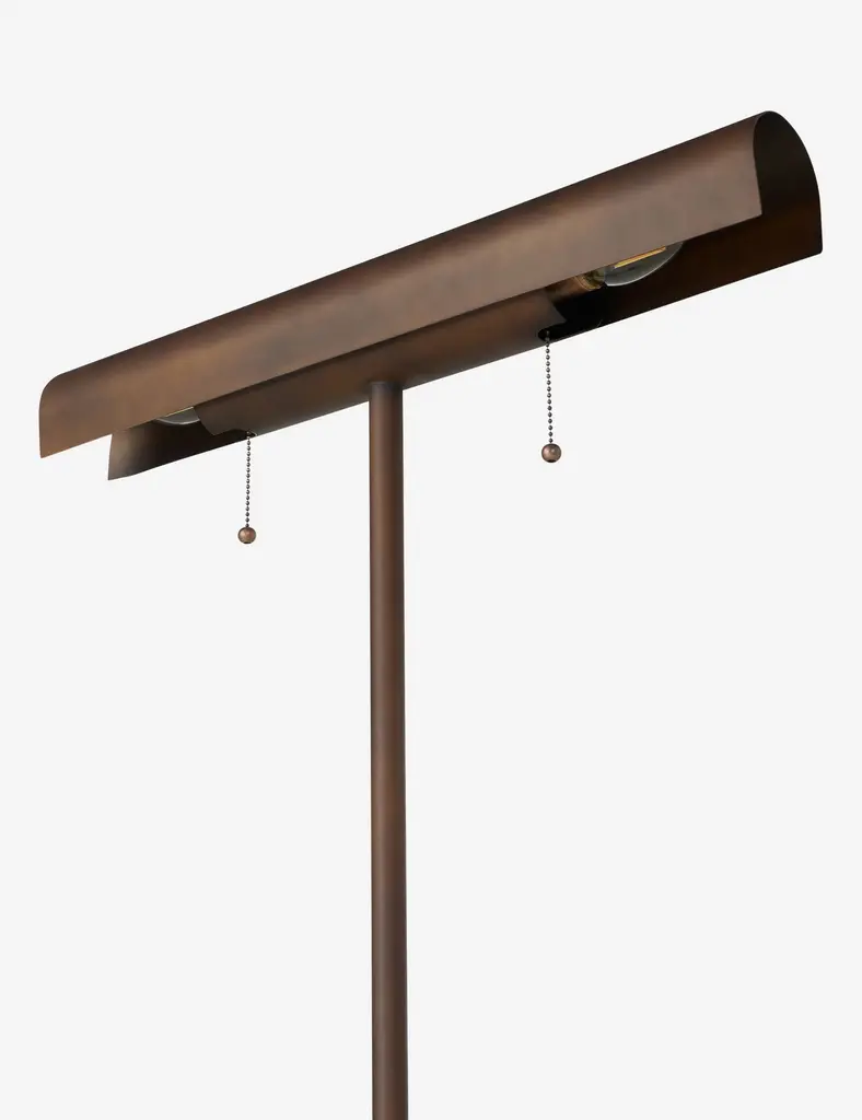 Bring a touch of sophistication to the room with the Peabody floor lamp. The picture light-inspired shade cuts a timeless silhouette with dual pull chains to control each end of the lampperfect for a reading nook or workspace. A thick, weighted base supports the lamp with a sturdy bearing.