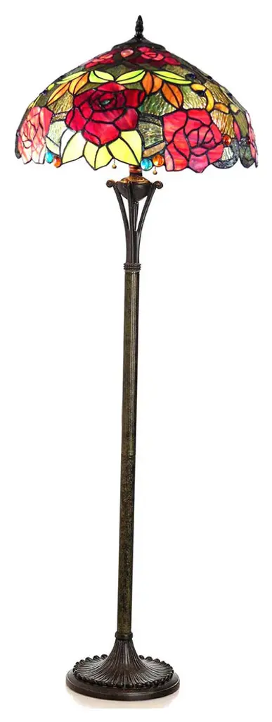 This Tiffany-style floral roses design 2-light floor lamp features an antique bronze finish that will complement many decors throughout your home. Hand crafted from individually hand cut of 456 pieces copper-Foiled stained glass and 36 beads that will add color and beauty to any space.Main colors are green and red.(2) 100 Watt max E26 Type A Bulb (not included)Pull chain456pcs glass cut, 36 beadsDownlightIndoor SettingGlass &/or Fabric Color: Multi-coloredShape: RoundBulb Type: Incandescent; LED; Compact Fluorescent (CFL)Max Wattage: 100Bulb Base: E26/Medium (Standard)Bulb Shape: A19Additional Warning or Disclaimers: Since these are hand crafted products, the exact color of glass pieces may vary. Colors of the glass will appear darker and less vibrant when not illuminated. Handmade glass will vary from one piece to the other; glass made at different times will also vary. Light bulbs used in lamps or ambient lighting may affect the appearance of the products. Stained glass product has been protected with mineral oil as part of the finishing process. Please use a soft dry cloth to remove any excess oil.UL Certification #: E246443