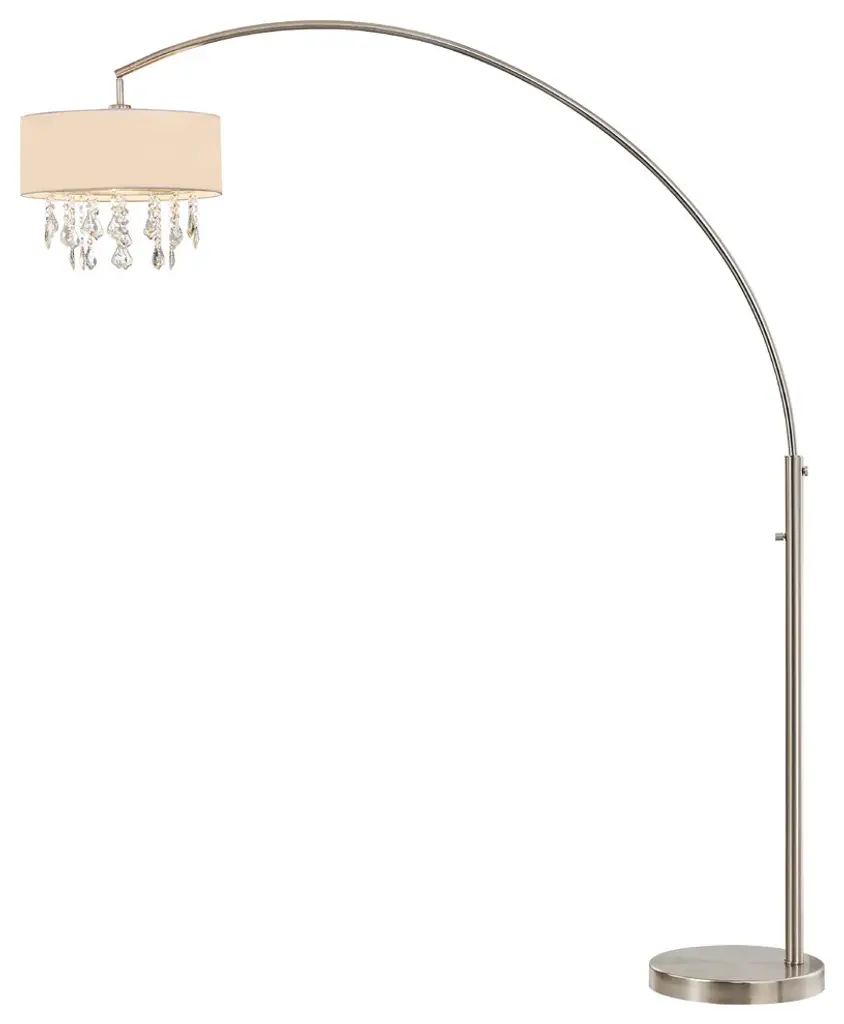 Blend beautiful shapeliness and soft curves with modern and classic materials in this brilliant floor lamp. Designed to light up any space, as well as your sense of aesthetics, this drooping floor lamp has eye-catching appeal. The lamp is anchored by a magnificent base crafted of marble. A sleek chrome stand starts lean and crisp before softly curving to the stunning crystal that shine with mystical colors and accents. This floor lamp has the style to meet the decor of a formal living room, yet offers the panache to brighten up a home library.Features: • Includes: One (1) floor lamp • Finish: Crystal/White/Chrome • Materials: Marble, metal, plastic • Arched chrome finish body • Round white marble base • Switch: 2-way • Switch type: Feed-thru cord • Light system: LED light bulb • Socket: E26 • Bulb type: 9W • Power cord length: 130"Specifications: • Product Dimensions: 86" H x 16.5" W x 57" D • Product Weight: 40.7lbs • Number of Lights: 1 • Wattage: 8 • Assembly Required: Yes