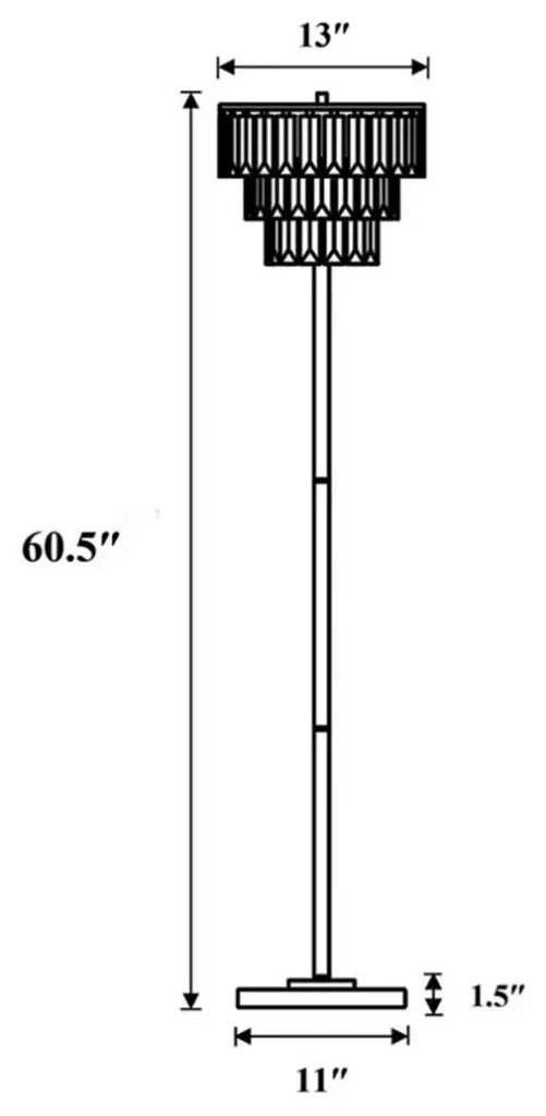 This silky smooth crystal floor lamp has a polished brilliance that you''ll appreciate. It''s versatile enough to add elegance and shine to a formal living room or spruce up a stuffy office. Its sleek silhouette is anchored by a tiered round base crafted of smooth chrome. The slender profile continues with a chrome stand topped by magnificent crystal pieces that dispense dynamic colors and accents to any room. Use it to light up a contemporary console table or place it between to accent side chairs and have engaging conversations while sipping on after-dinner brandies.Features: • Material: Metal, crystal • Finish: Chrome • Chrome finish metal base • Switch: 2-way • Light system: LED light bulb • Switch type: Feed-thru cord • Socket: E26 • Includes: One (1) floor lampSpecifications: • Product Dimensions: 60.5" H x 13" W x 13" D • Product Weight: 14.3 lbs • Number of Lights: 1 • Wattage: 8 • Assembly Required: Yes • Bulb Type: 9W • Product Dimensions: (Power cord length) 76"