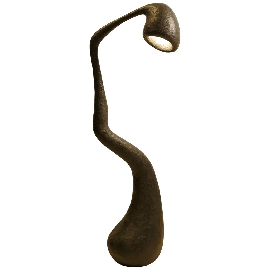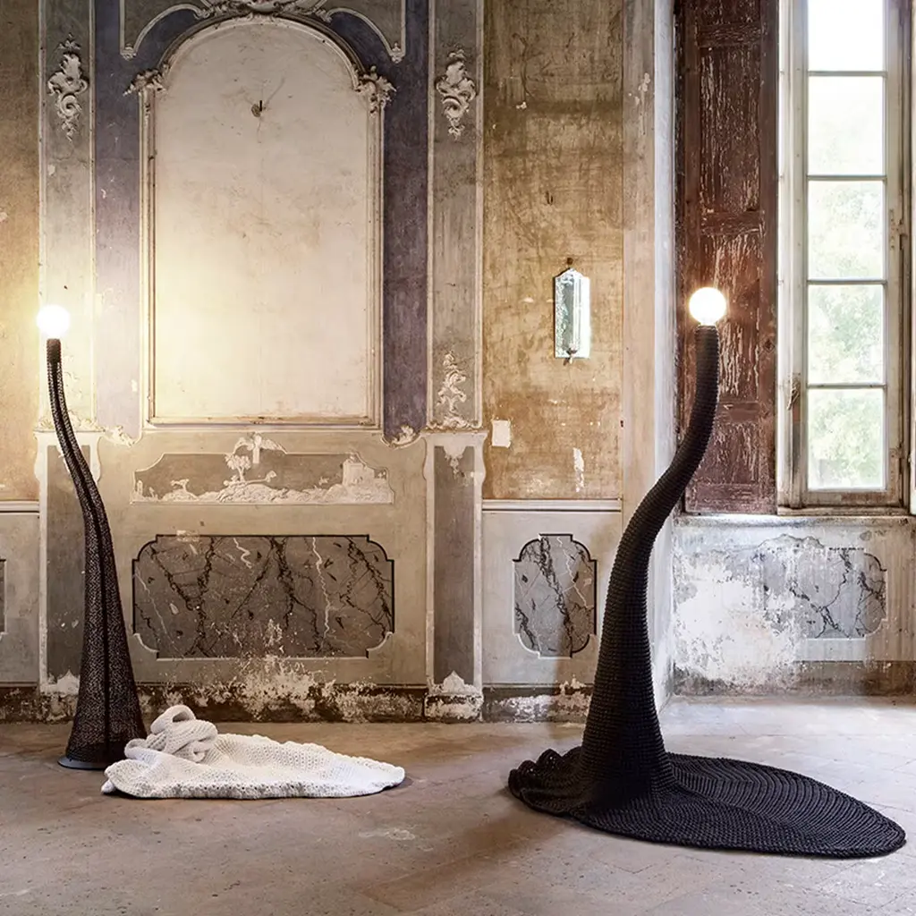 This exceptional floor lamp celebrates the bravery and resilience of Penelope - the mythological weaver wife of Odysseus. The sinuous frame in polished, black-lacquered aluminum rod is dressed in a crochet mantle in fireproof, black fibers of indisputable elegance. The "flex and stay" technology allows the upper structure to be adjusted as desired and to obtain a customized illumination of the surroundings radiating from the spherical bulb (not supplied).