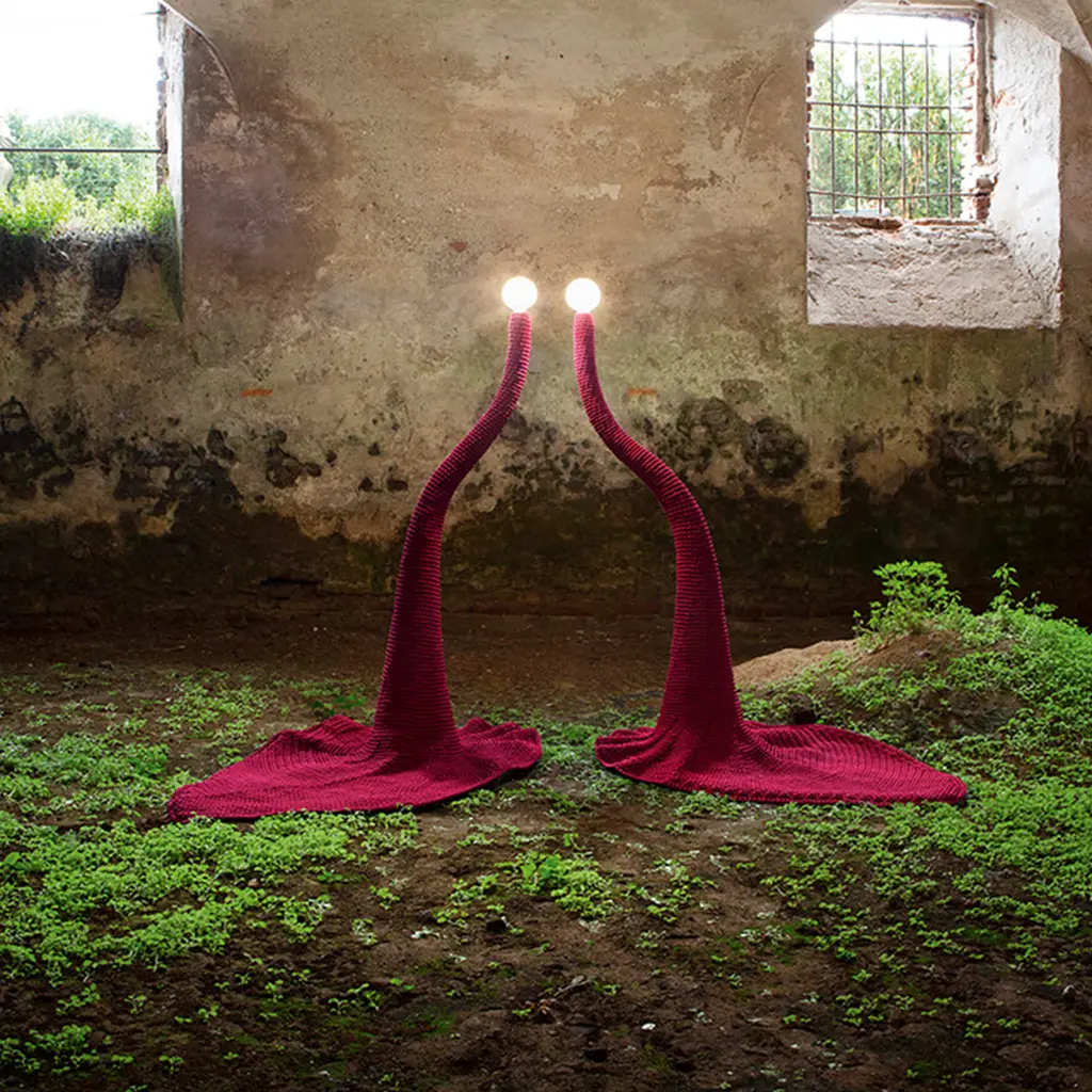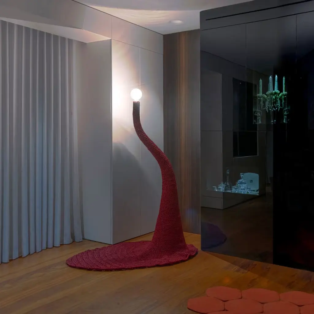 Sure to take center stage in any contemporary or eclectic decor, this artisan floor lamp is dressed in a fine crochet suit woven using fireproof, burgundy fibers as an homage to Penelope, the mythological weaver wife of Odysseus. Its upper section, including the spherical lightbulb (not included with purchase), can be flexed and adjusted for customized illumination. The sinuous structure is fashioned of glossy, black-lacquered aluminum rod for exceptional lightness.