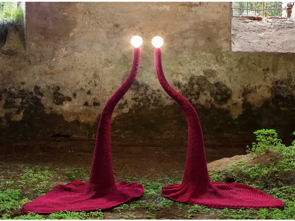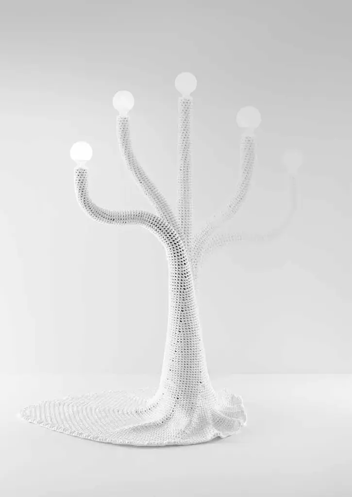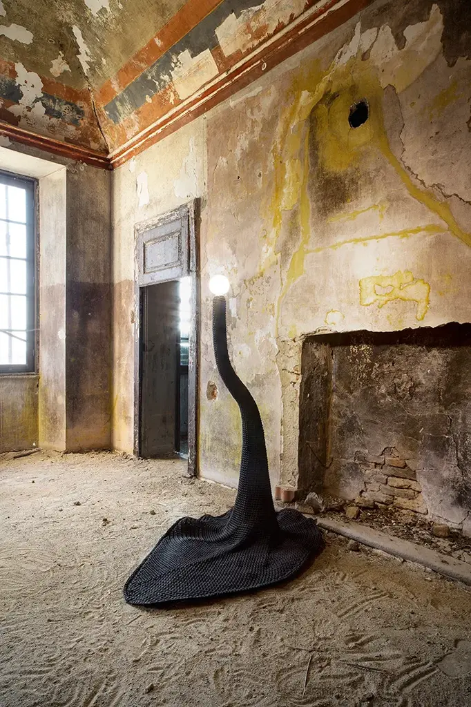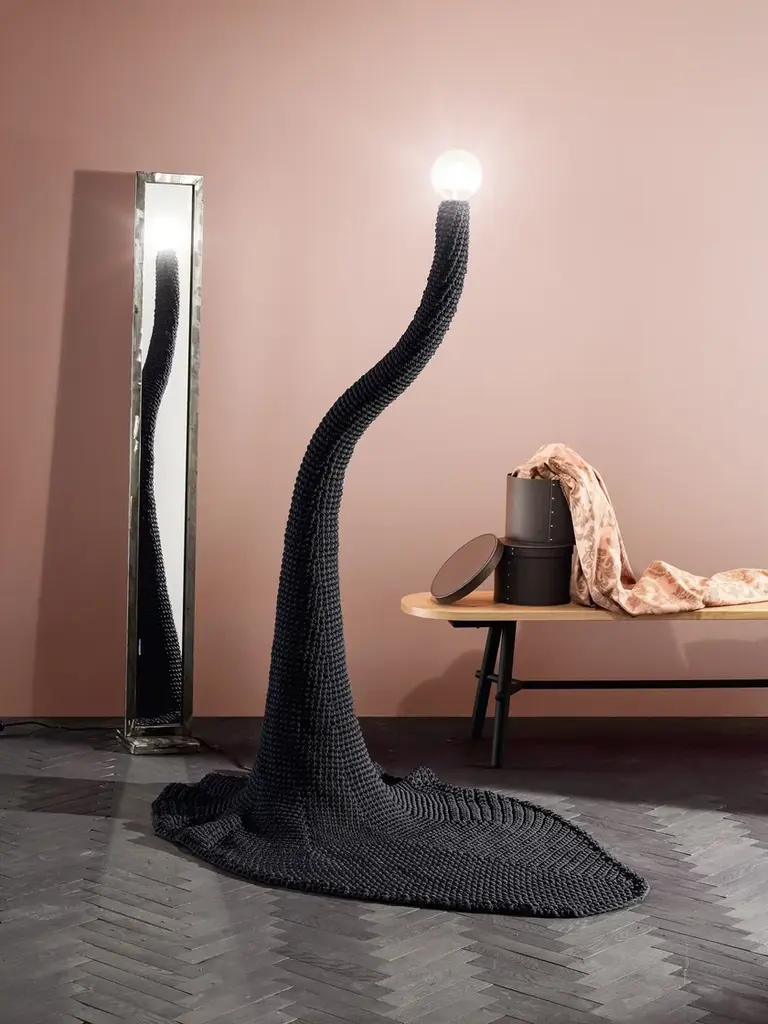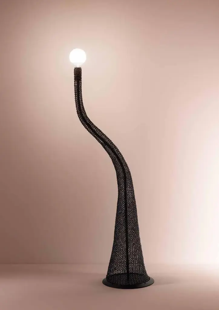Penelope gets her name from the weaver in the myth of Odysseus, a feminine symbol of intelligence, patience, dexterity and an artful adaptability to the ever-changing nature of reality, capable of regenerating and maintaining the spirit of the home. Conceived of as the evolution of a woven carpet that becomes light, Penelope is more than just a furnishing accessory. In fact, within the context of the functionality of contemporary living, she is capable of decorating, furnishing and defining the spaces of our daily lives and, at the same time, stimulating the senses and evoking ancient stories.Produced in a single version, covered in fabric or bare, she brings the tactility of an artisanal object into the home. With this comes the unrepeatability of a product made entirely by hand, the result of wisdom passed down through generations, at once both simple and rich in history, which is integral to the crochet weaving technique. Black painted floor lamp with ON/OFF dimmer.Hand-woven painted netting covered in a crocheted fire-retardant fabric.E27 - max 60 W DIMMABLE - 230 VEnergy class from A to GBulb not included