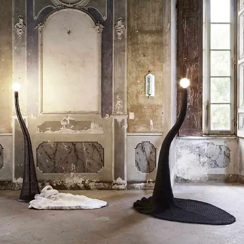 The Penelope Floor Lamp from Fisionarte is a dramatically imagined lighting fixture that pays tribute to the mythological character of Penelope from the myth of Odysseus, described by Fisionarte as “a feminine symbol of intelligence, patience, dexterity, and artful adaptability.” Designed by Domenico Rinaldi, the Penelope Floor Lamp is expertly made in Italy and crafted with a crochet weaving technique, which gives her an intricate texture that is both eye-catching and beautiful.