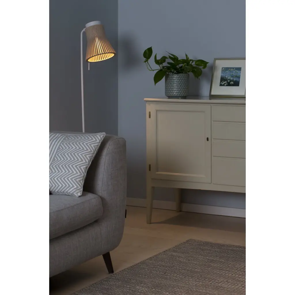 Secto Design’s Petite 4610 floor lamp catches the eye with its slender stem and airy lampshade made of birch. The height of 51.18 in (130 cm) makes Petite 4610 a perfect companion for an armchair or desk, and the wooden shade filters the light creating a soft ambience to any space. Secto Design luminaires are handmade in Finland from form-pressed Finnish birch. The lamps have clean Scandinavian silhouettes, and the wooden surface gives them a warm and appealing character. Secto lamps are designed by architect Seppo Koho who wanted to develop a softly filtering light that doesn’t dazzle but invites people to come closer. Secto lamps emphasize space and environment by creating a unique atmosphere and feeling of closeness.