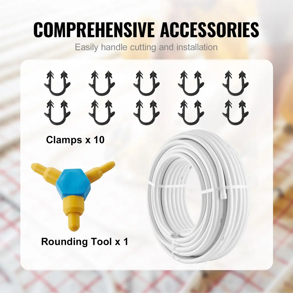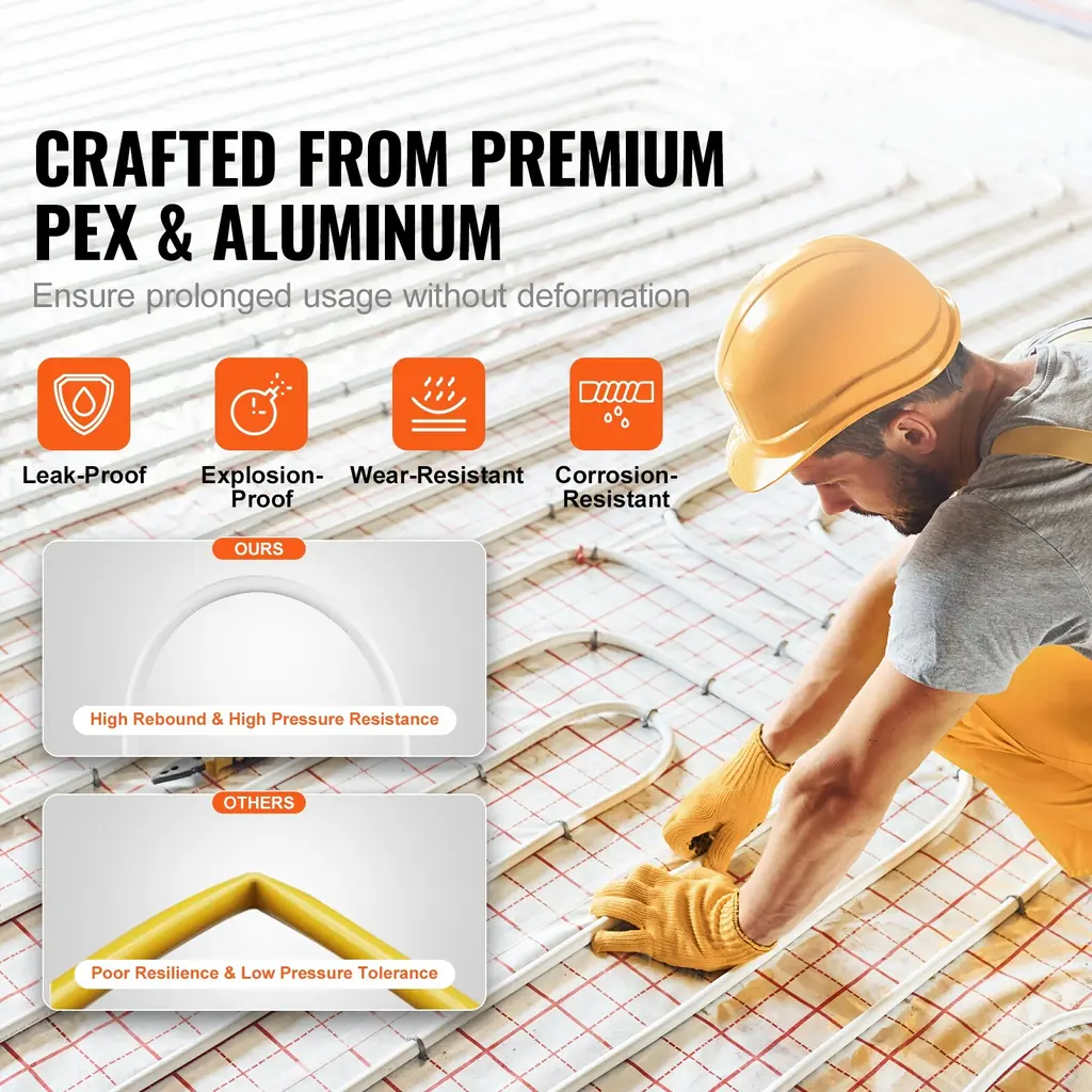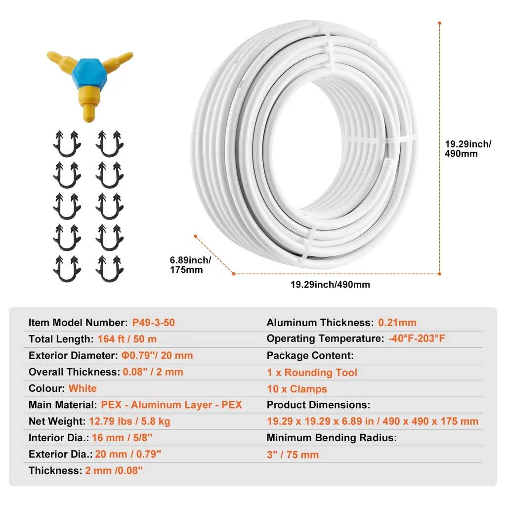 High-Quality Materials, Lasting Performance: When it comes to durability and reliability, our AL PEX tube is second to none! Crafted from top-notch PEX and aluminum materials, our pipe can withstand cracking, leaks, and corrosion. It's built to last, ensuring long-lasting and dependable performance. Say goodbye to frequent maintenance! Unmatched Compatibility & Weatherproof : With a compatibility range from -40°F to 203°F (-40°C to 95°C), our AL PEX tube can handle extreme temperatures, ensuring secure use in both scorching heat and freezing cold. It can be easily installed with different connection systems, making it compatible with a wide range of residential and commercial applications.rust our pipe to deliver consistent and reliable performance. Handle Any Surface with Ease: Designed with a 0.79 in(20 mm) exterior diameter and 0.08''(2 mm) wall thickness, our AL PEX tube has a exceptional bend radius and smooth inner wall for excellent elasticity and high-pressure resistance, which adapts to different ground conditions, avoiding pipe breakage or cracking. Its flexibility makes it easy to bend, cut, and even install in tight corners without compromising its integrity. Get Ready in 3 Simple Steps: Installing our aluminum-plastic composite pipe is a breeze, and you'll have it up and running in no time! Step 1: prepare your tools. Step 2: attach nuts and snap ring connector. Step 3: tighten the nuts, please note that hardware is not included. You don't need to be a plumbing expert to install our aluminum-plastic pipe. Just follow these 3 simple steps, and you're good to go! Versatility at Its Best: Our AL PEX pipe has a total length of 164 ft(50 m), can be used with tee fittings for installation with different connection systems and floor types, such as hot and cold water plumbing systems, indoor gas piping systems, and solar air conditioning piping systems. Ideal for both residential and commercial purposes, such as radiant floor heating systems, water lines for home or camping, cold/hot water transport systems or other plumbing or HVAC uses. Package Content 1 x Rounding Tool 10 x Clamps