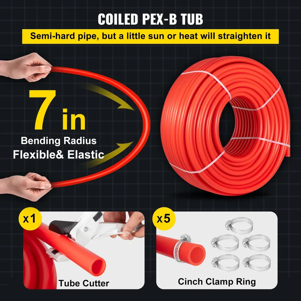 Premium 1" x 500 FT PEX-B Tubing: Nominal Dia.: 1"; Outer Dia.: 5/8"; Thickness: 0.07". Total Length:500 ft / 152.4 m. Our PEX pipe is built with non-barrier oxygen PEX material, non-toxic, and maintenance-freed to keep quick & uninterrupted cold water flowing. Get one to cover all potable water and radiant floor water projects. Flexibility & Cut-to-fit: The PEX water line is flexible, making it easy to cut and bend.The min.7" bending radius keeps the tubing from breaking or cracking and can even be mounted on corner. It meets multiple demands, making it perfect for installations that are required underground and is perfect for soft garden installations. No matter what, you will be ready for anything! Superb Sealing Performance: The PEX coil expands and contracts with temperature changes and is freeze-proof, providing you with a steady stream of water all year around. It withstands cold temperatures to -40℉, high temperatures to 203℉, and high pressures (160 psi at 73℉, 100 psi at 180℉, 80 psi at 200℉). Quick Assembly & Push-to-connect: Experience added convenience! VEVOR's 1-inch heat PEX includes a cutter and five clamps for fast and easy assembly. It is compatible with different connection systems, such as the crimp connection system, cinch (clamp) connection system, press system, and compression PEX fittings. Residential & Commercial Application: The reliable PEX water line 1-inch is suitable for home/commercial improvement needs, such as indoor or outdoor hydronic radiant heating, washing machines, snow-melting driveways, H20 connections, solar heating, etc. Package Content 1 x PEX Tube 1 x Cutter 5 x Clamps