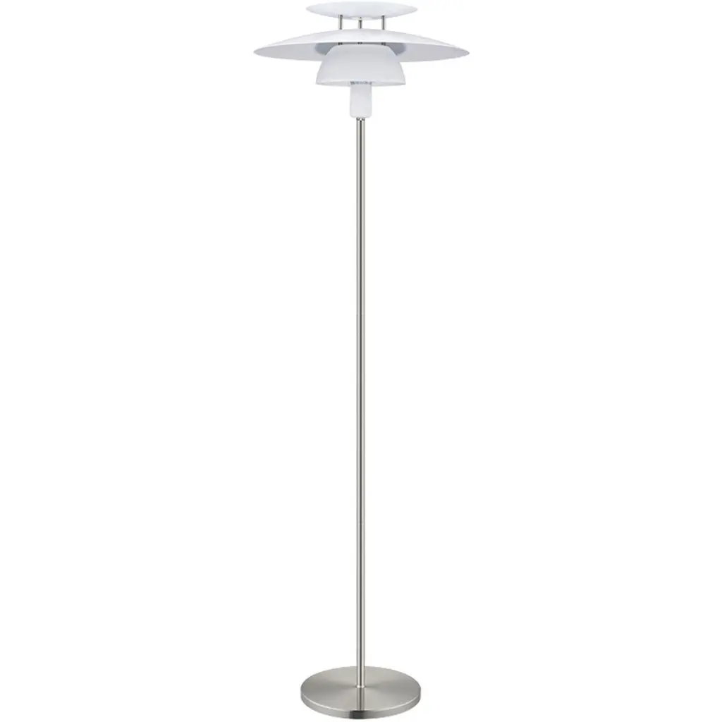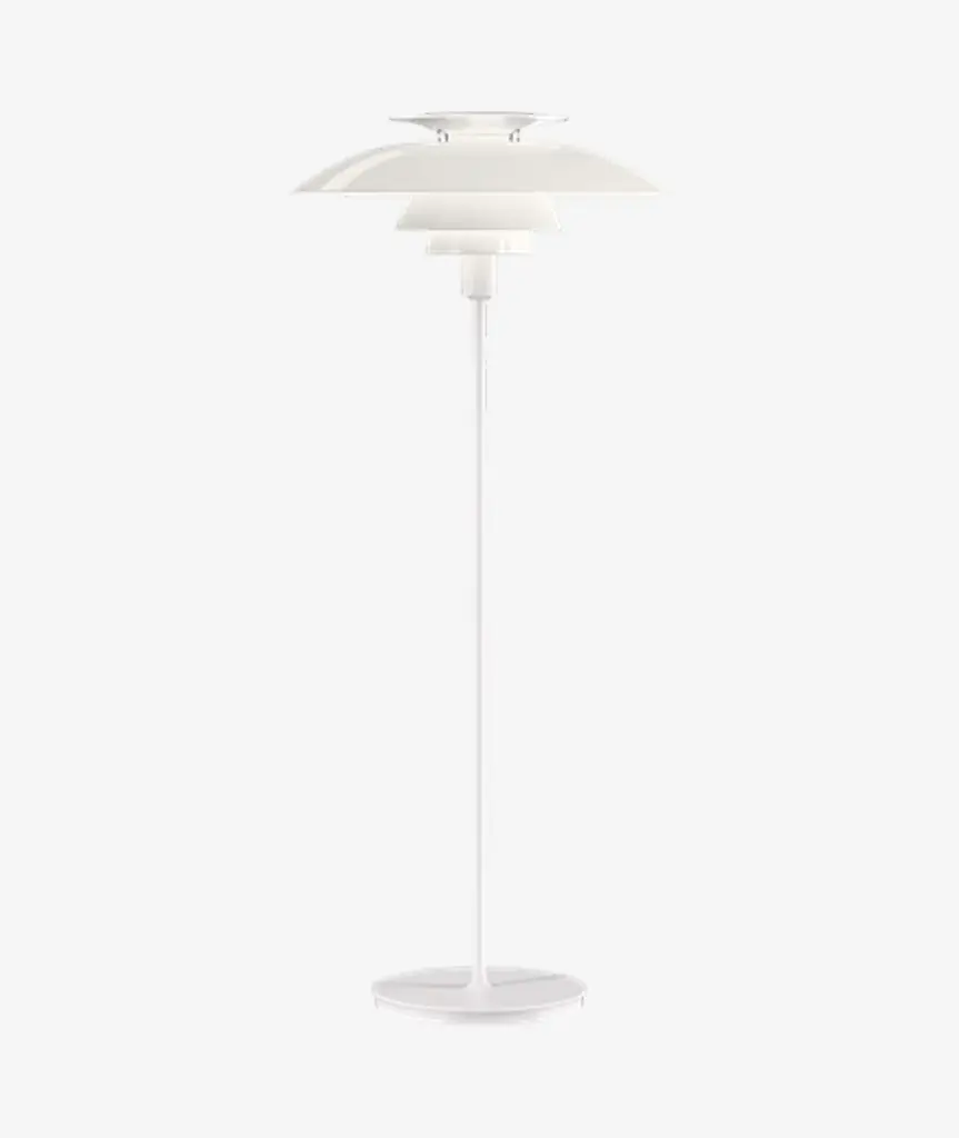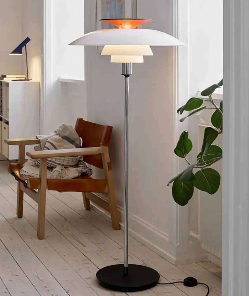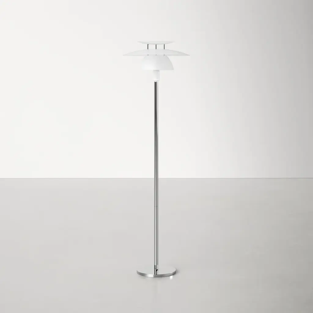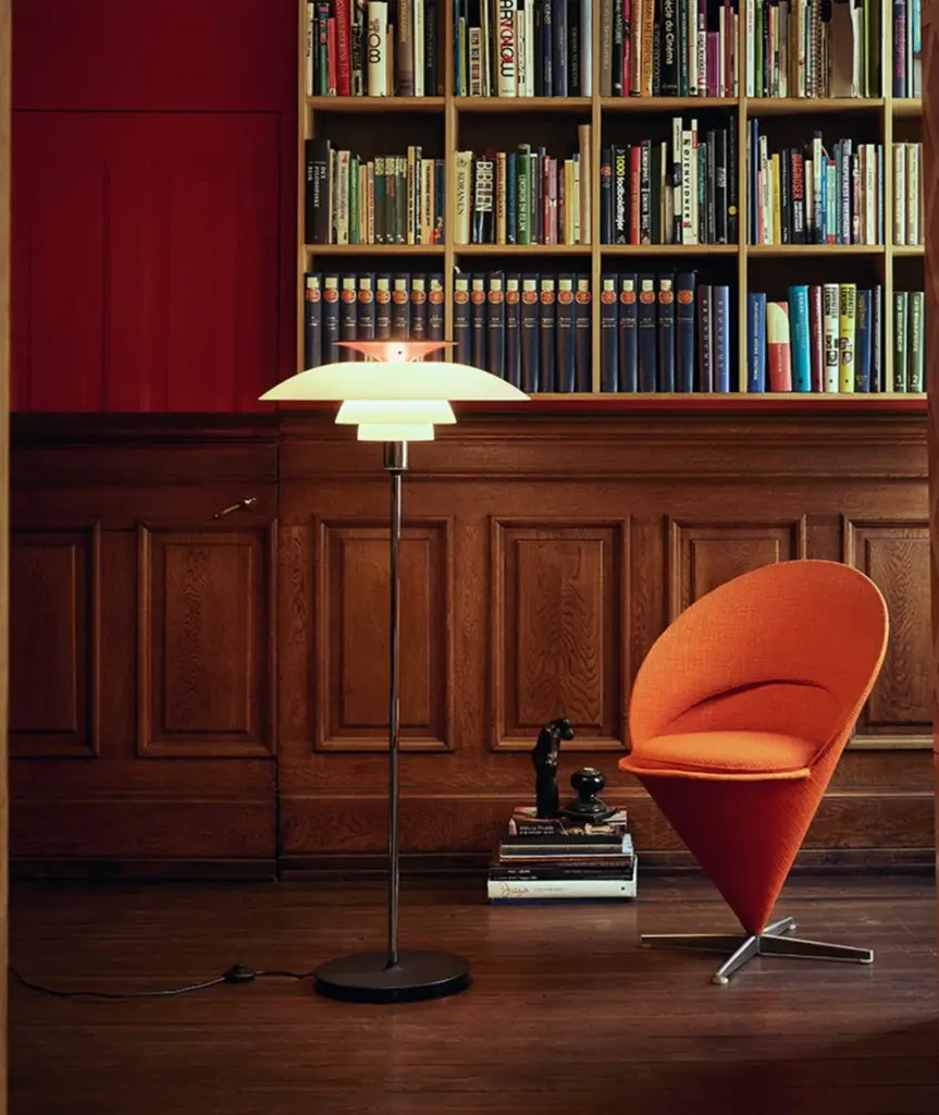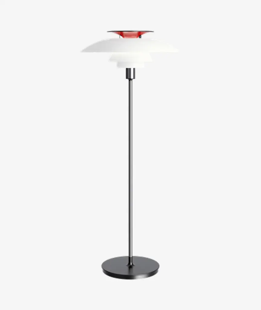 This fixture emits a diffused, reflected, symmetrical light. The majority of the light is directed downward. The opal acrylic shades provide comfortable room lighting. On the original fixture, the red hue of the top reflector adds an intense, warm glow to the light. The black and white fixtures have a white top reflector that reflects the light for a clean, elegant look. The choice of light source will determine the color of the illumination.