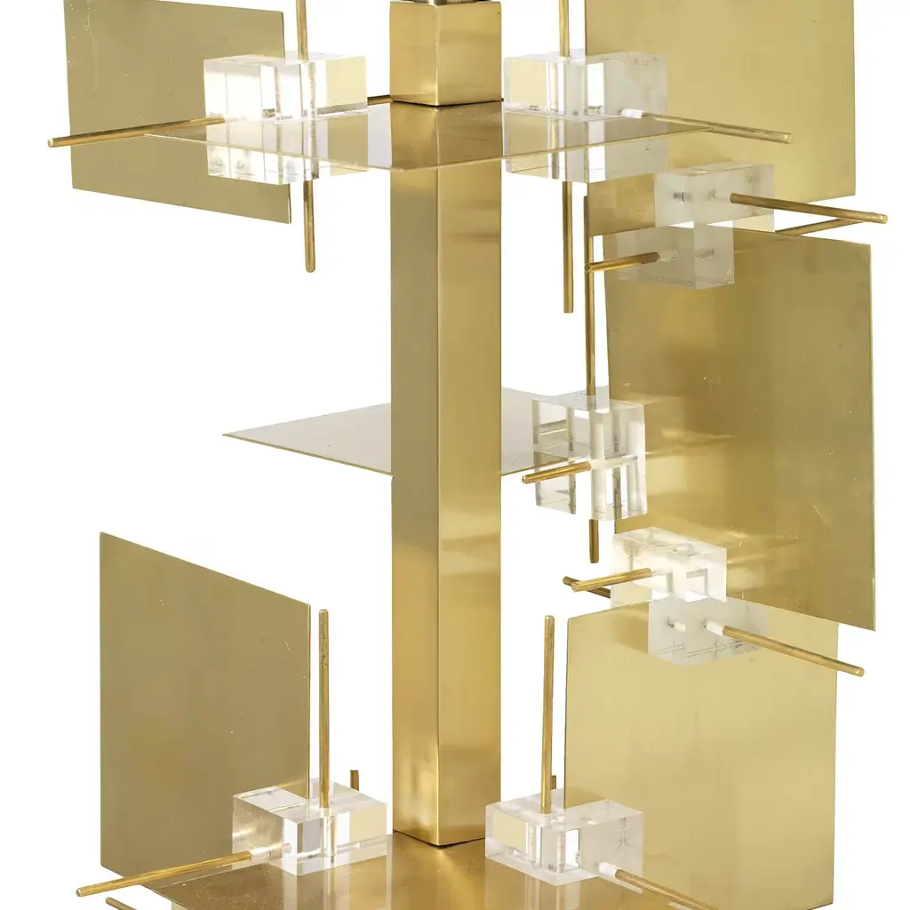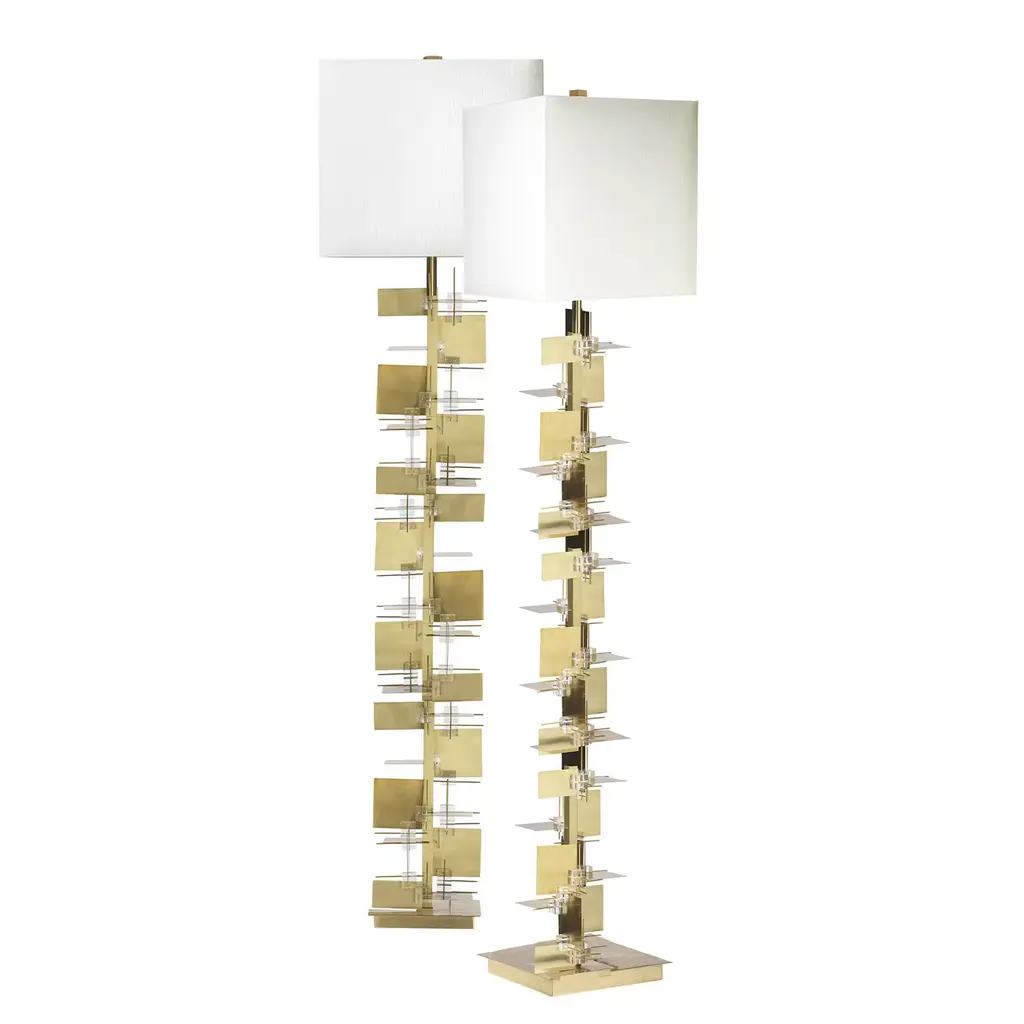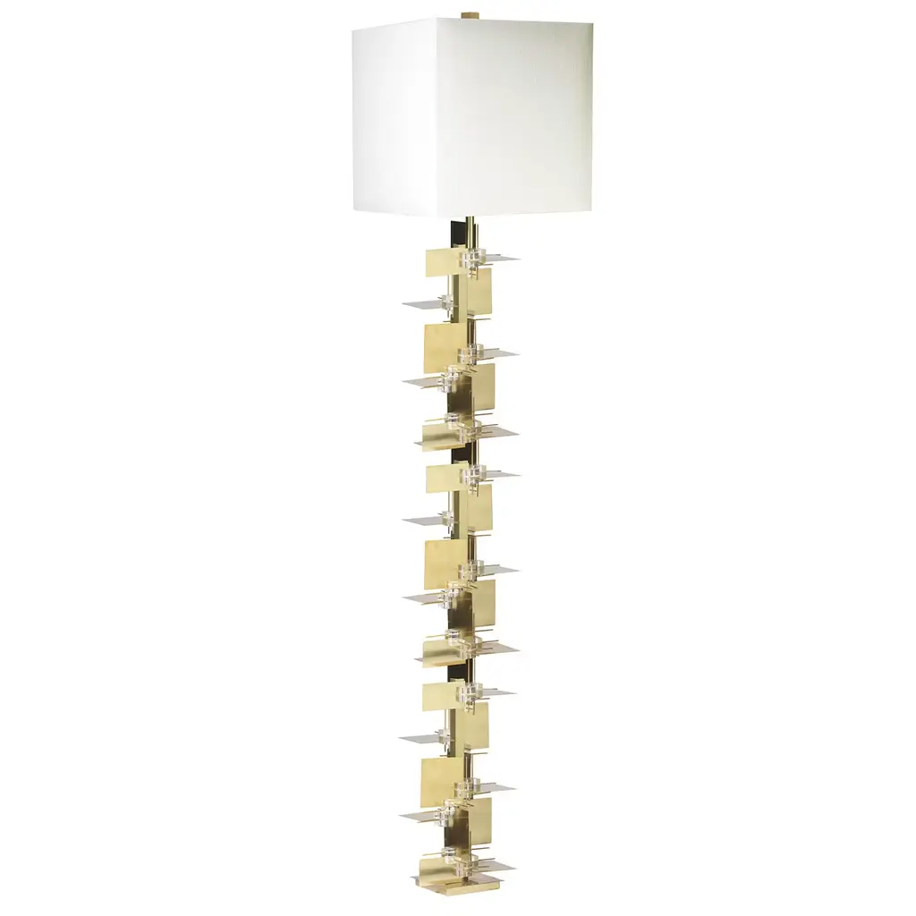 Bold sculptural flair defines this floor lamp from the Contemporary Collection, its design incorporating a cubic lampshade (40x40x40 cm) in ivory shantung fabric for a dash of tradition. The frame features a skeleton of square brass plates intertwined with Plexiglas cubes for a marvelous interplay of reflections and transparencies splendidly enhanced when hit by the light radiating from above. The two fitting bulbs are E27 type (60W). The bulbs are not included.
