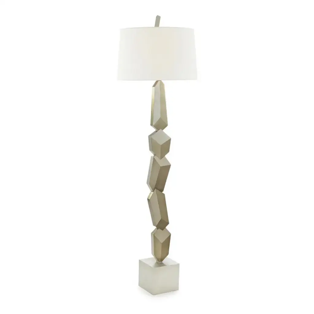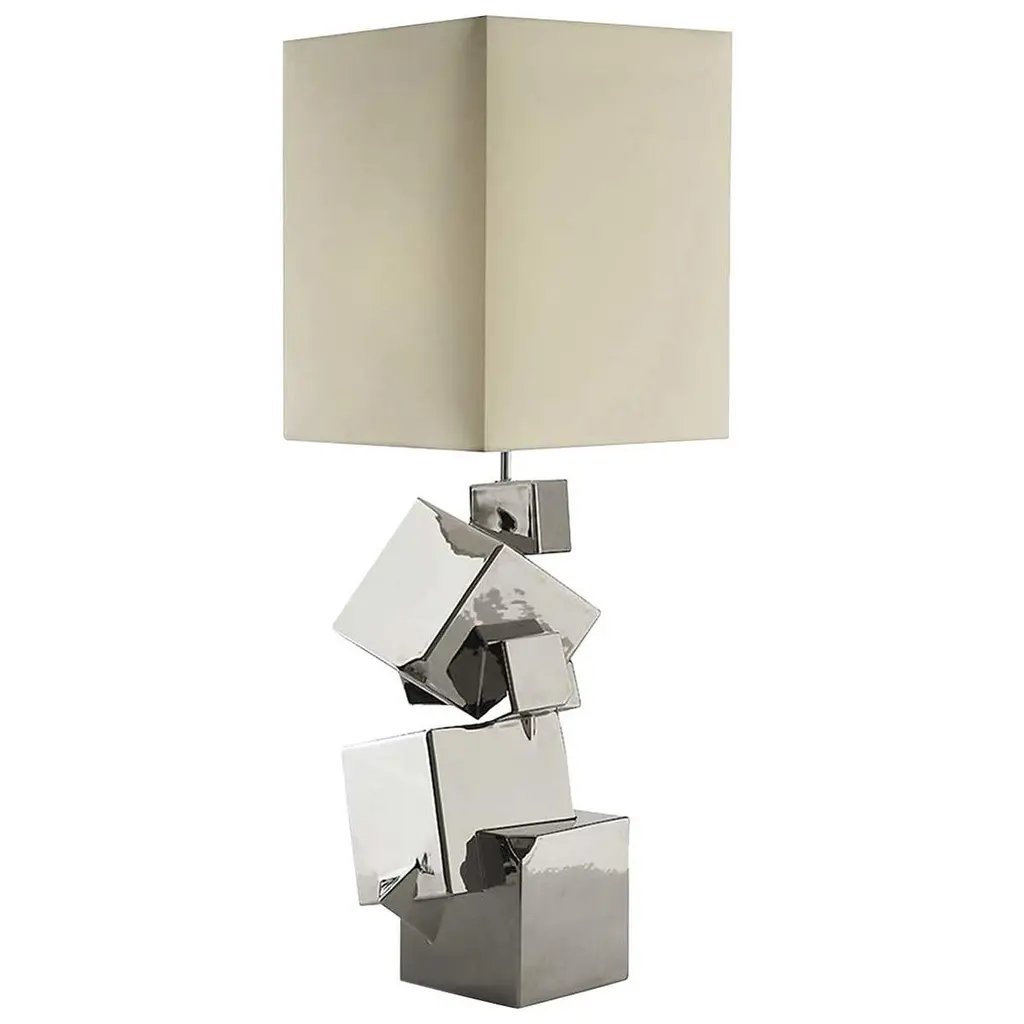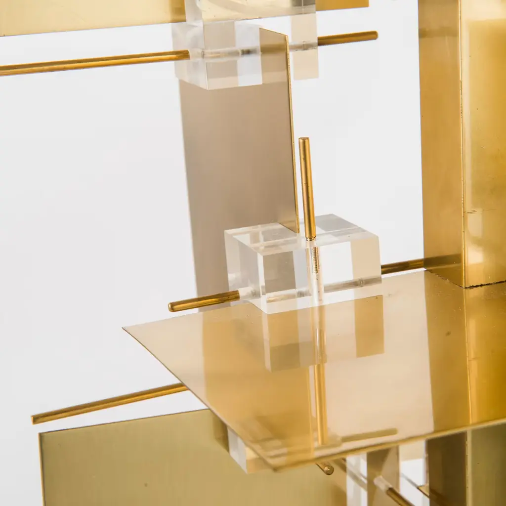 Bold sculptural flair defines this floor lamp from the Contemporary Collection, its design incorporating a cubic lampshade (40x40x40 cm) in ivory shantung fabric for a dash of tradition. The frame features a skeleton of square brass plates intertwined with Plexiglas cubes for a marvelous interplay of reflections and transparencies splendidly enhanced when hit by the light radiating from above. The two fitting bulbs are E27 type (60W). The bulbs are not included.