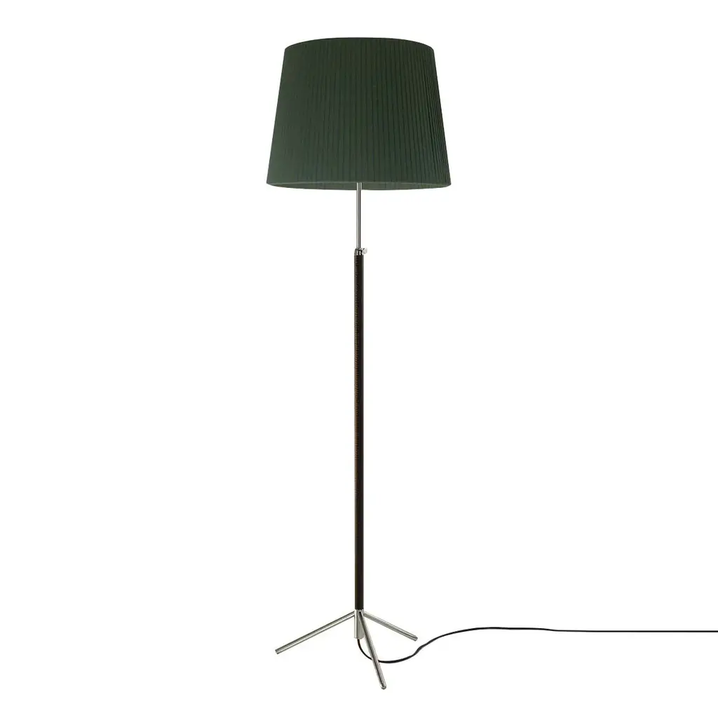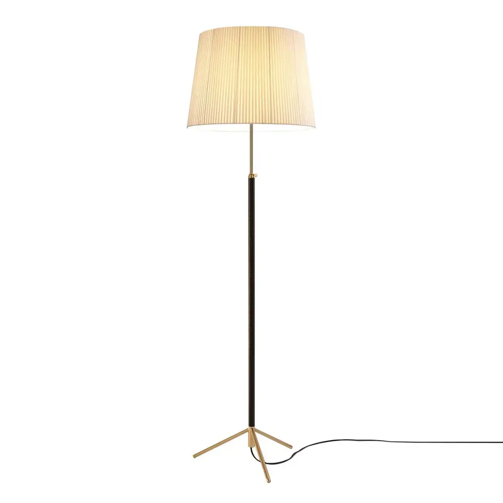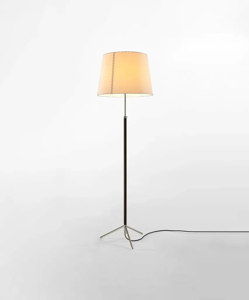 Renowned surrealist sculptor and painter Jaume Sans hung out with Picasso, Dalí, and Calder in pre-Spanish Civil War Barcelona and later originated furniture designs in his own household. Pie de Salón from 1963 features a polished brass or chrome-plated shaft luxuriously clad in leather on a tripod base. The height-adjustable floor lamp offers varied shade styles: the conical G1 and G3 and the straight-sided G2—in white linen, stitched parchment or hand-finished colored ribbon.