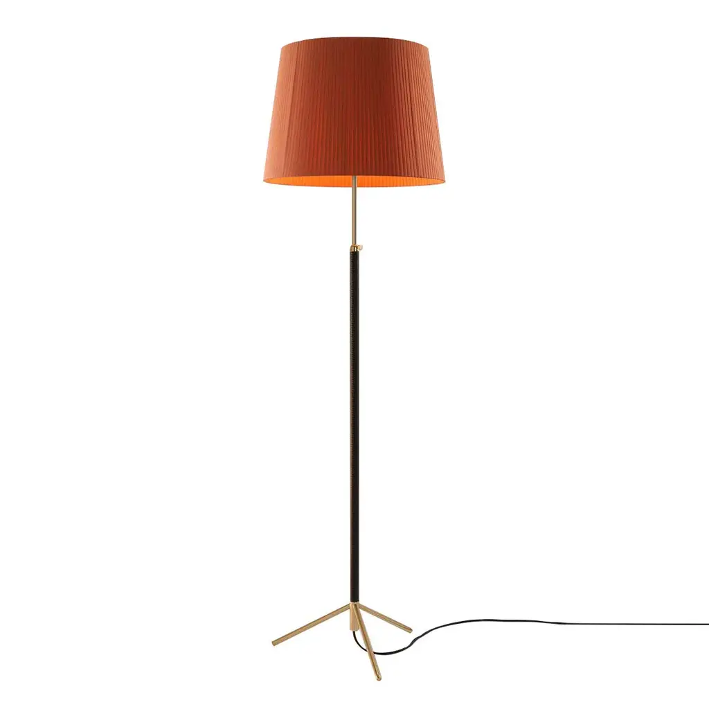 Renowned surrealist sculptor and painter Jaume Sans hung out with Picasso, Dalí, and Calder in pre-Spanish Civil War Barcelona and later originated furniture designs in his own household. Pie de Salón from 1963 features a polished brass or chrome-plated shaft luxuriously clad in leather on a tripod base. The height-adjustable floor lamp offers varied shade styles: the conical G1 and G3 and the straight-sided G2—in white linen, stitched parchment or hand-finished colored ribbon.